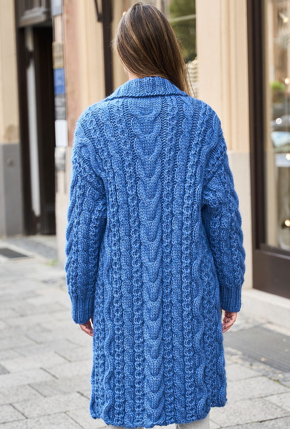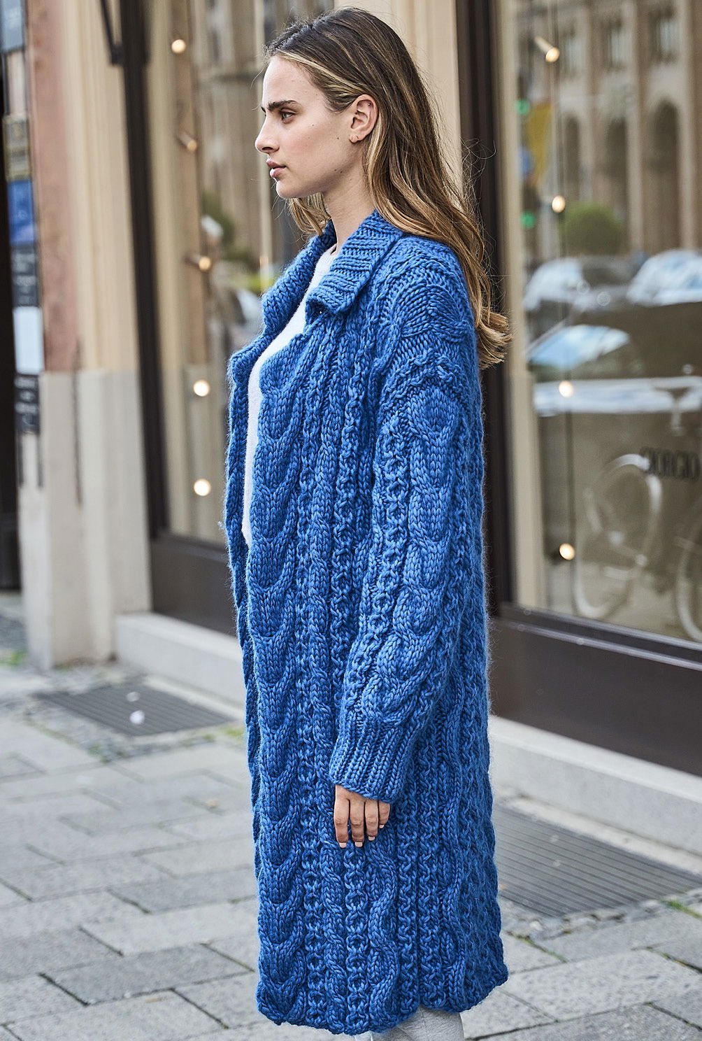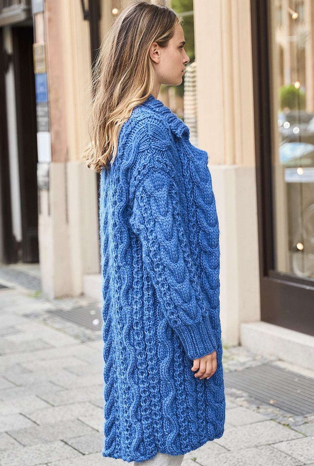 Material: 1300 (1400) 1500 g Blau (Fb 0006) "Bold" (80% Schurwolle, 20% Polyacryl, LL = 90 m/100 g) von LANGYARNS. Je 1 Paar Stricknadel Nr 9 und 10 sowie 1 Rundstricknadel Nr 9.