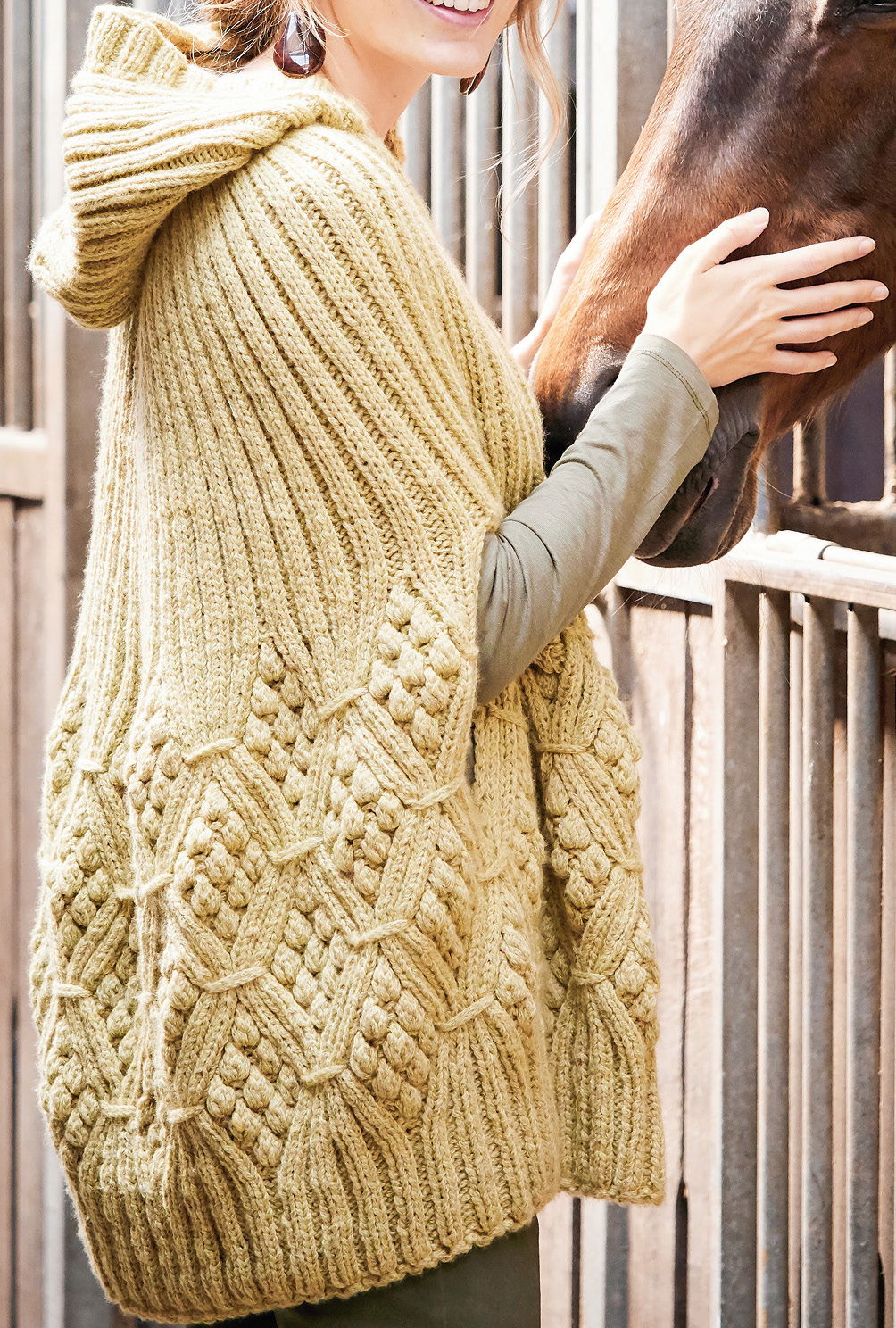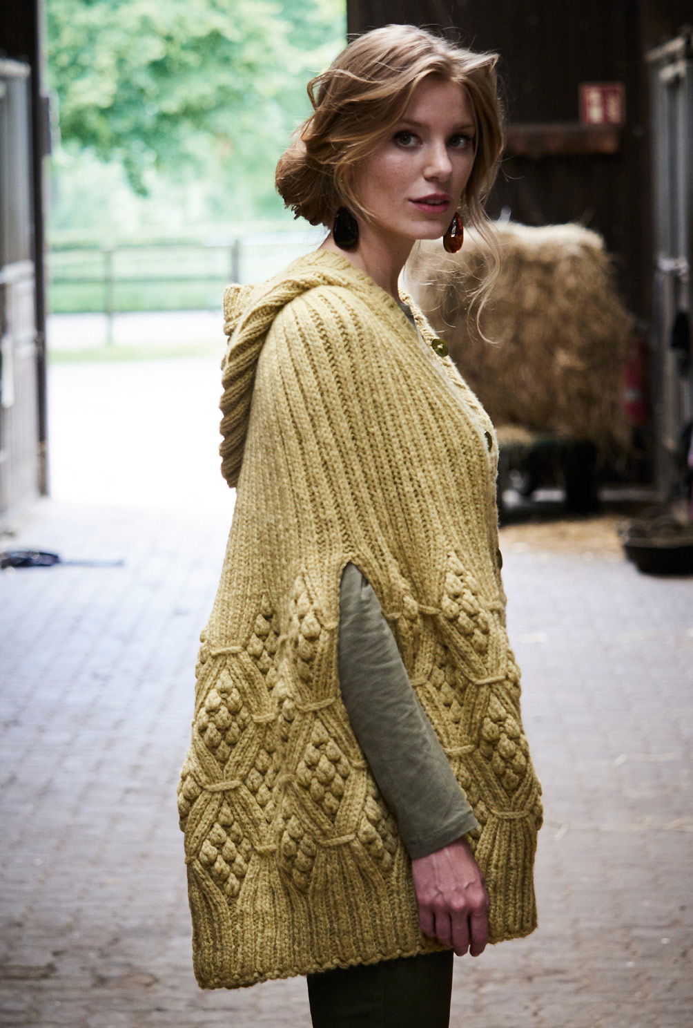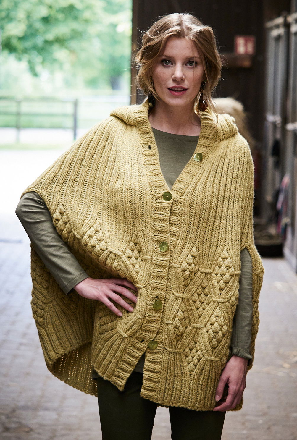 Sabrina Strickjournal Cape mit Kapuze in Messing im Noppenmuster