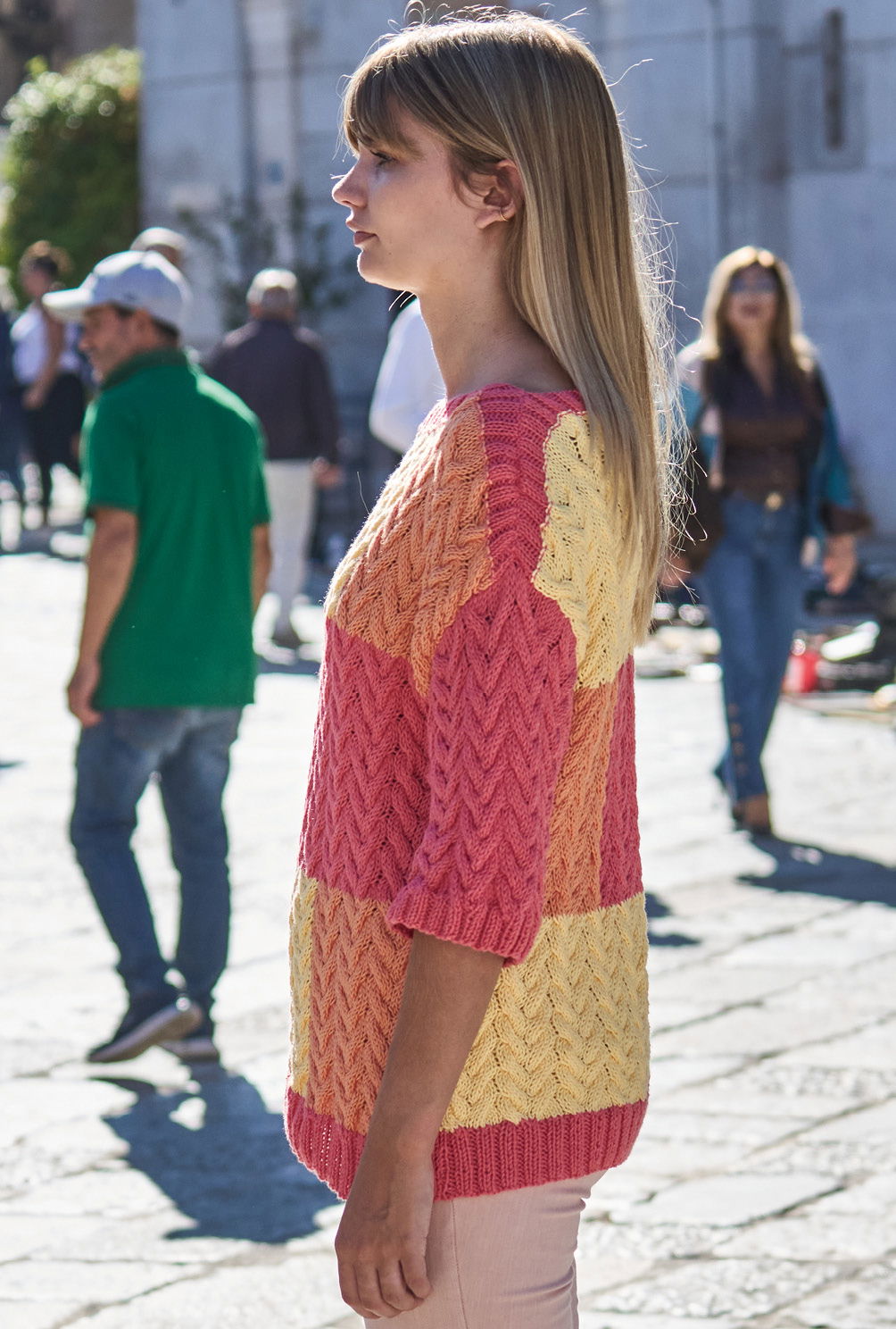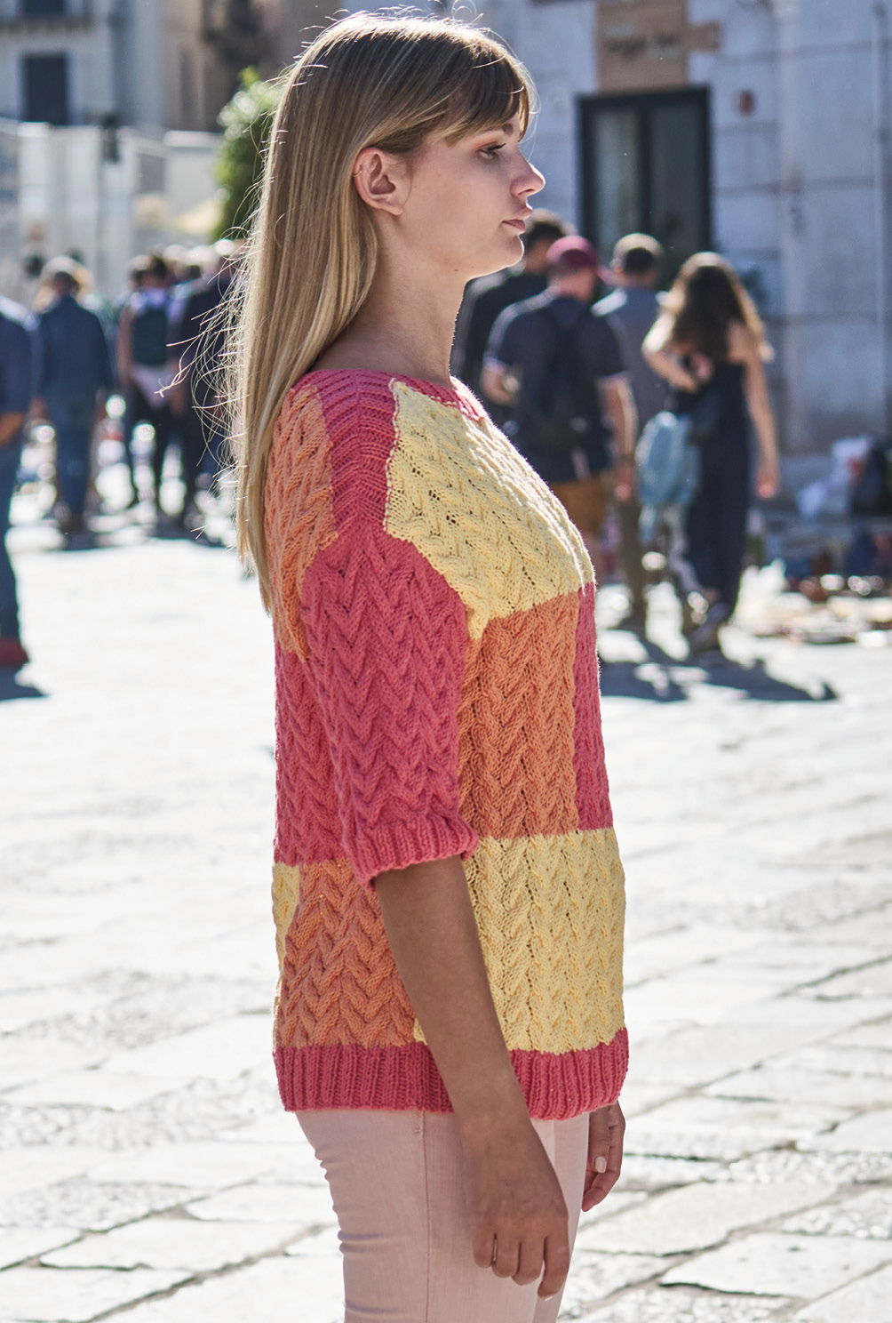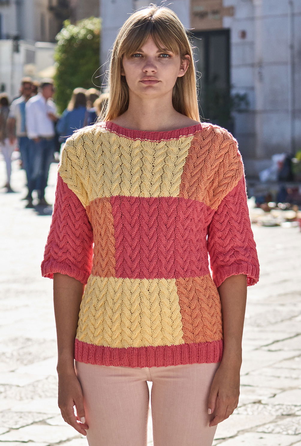 Patchworkoptik in heiteren Tönen – das ist genau das Richtige für die ersten Frühlingsgefühle. Hier als Farbflächenpulli aus weichem Baumwoll-Synthetikgarn, das die dreidimensionalen Strukturen des Zopfmuster so richtig plastisch zur Geltung kommen lässt. Die farbigen Rechtecke werden übrigens in Intarsientechnik gearbeitet. Das heißt, du musst beim Wechsel der Farben die Fäden immer auf der Arbeitsrückseite verkreuzen, so vermeidest du am Übergang unsaubere Löcher. Der gerade Schnitt, leichte Schulterschrägungen und der flache Halsausschnitt stehen für pures Understatement.