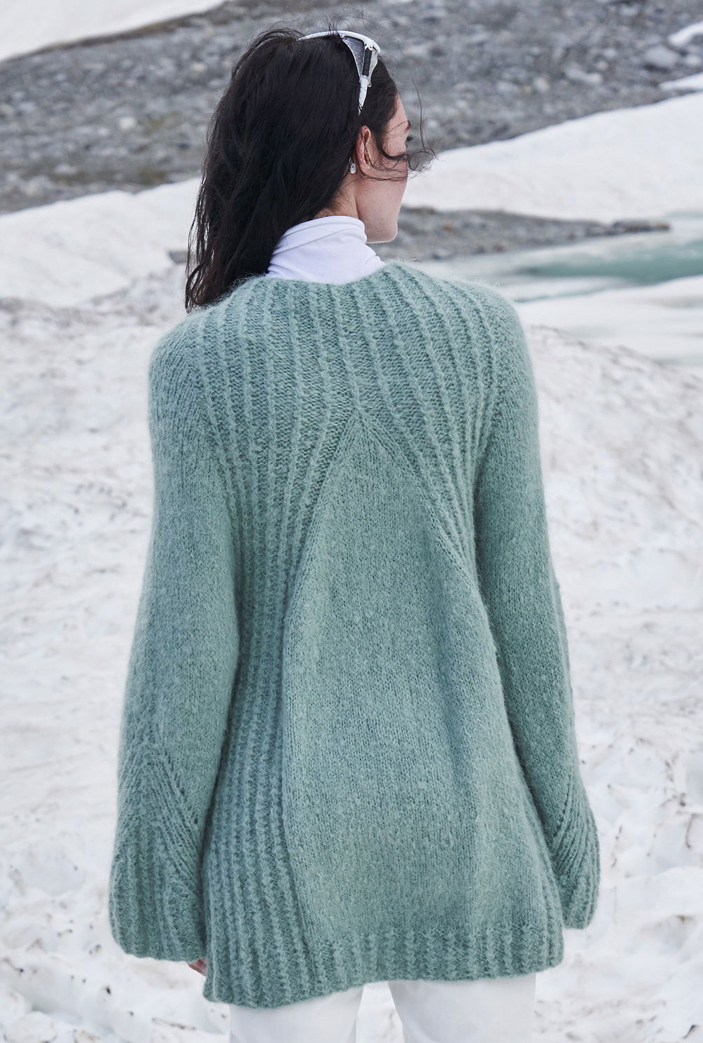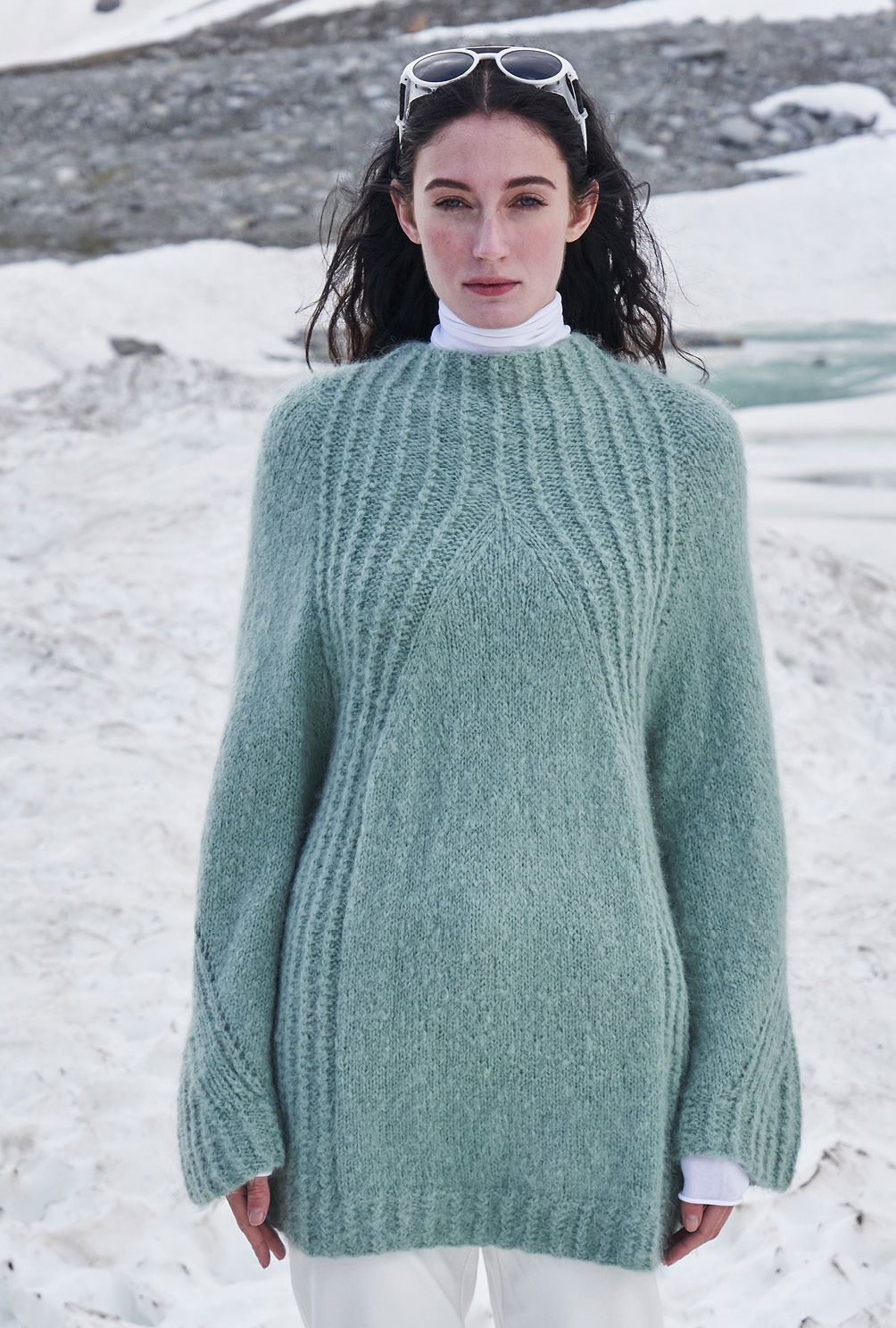 So lässig und kuschelig betont der nahtlos gestrickte Long-Pulli auf schmeichelnde Weise durch raffiniert platzierte Rippen die Schulterpartie. Die weiten Ärmel runden den Look ab und bringen ein weiteres, modisches Detail ins Spiel. Gestrickt aus einer kuscheligen Alpaka – und Schurwollmischung mit Nadelstärke 6 und einer Maschenprobe von 18,5 Maschen und 22 Reihen geht es zügig voran: Das geteilte Bündchen wird zunächst noch in Reihen gestrickt, danach geht es immer in Runden weiter – dann ist es auch schon Zeit, den Body mit den Ärmel zu verbinden. Auch diese werden in Runden gestrickt und dann zusammen mit den Maschen des Körperteils auf die Nadel genommen. Jetzt folgt die Passe. Damit auch bei den Abnahmen des Schulterdreiecks alles schön übersichtlich bleibt, sind diese gleich in der Strickschrift des Musters eingezeichnet. Sowohl das Rippenmuster, als auch die kleinen Zöpfe sind nicht schwierig zu stricken, bringen jedoch Abwechslung, Strickspaß und natürlich auch die besonders schöne Optik ins Spiel.