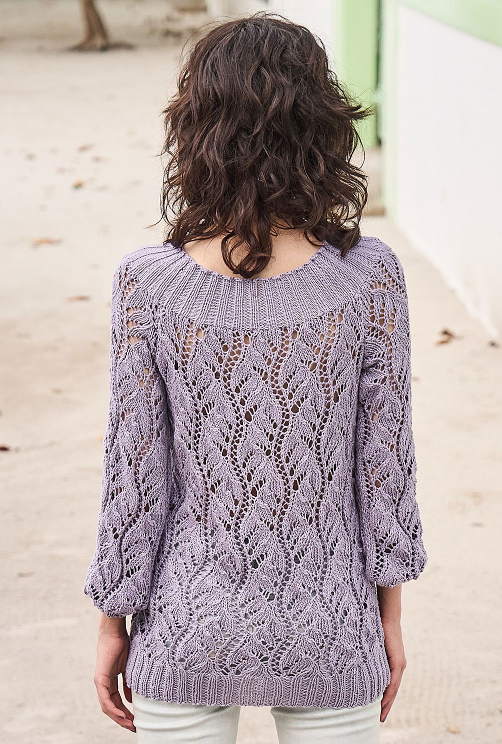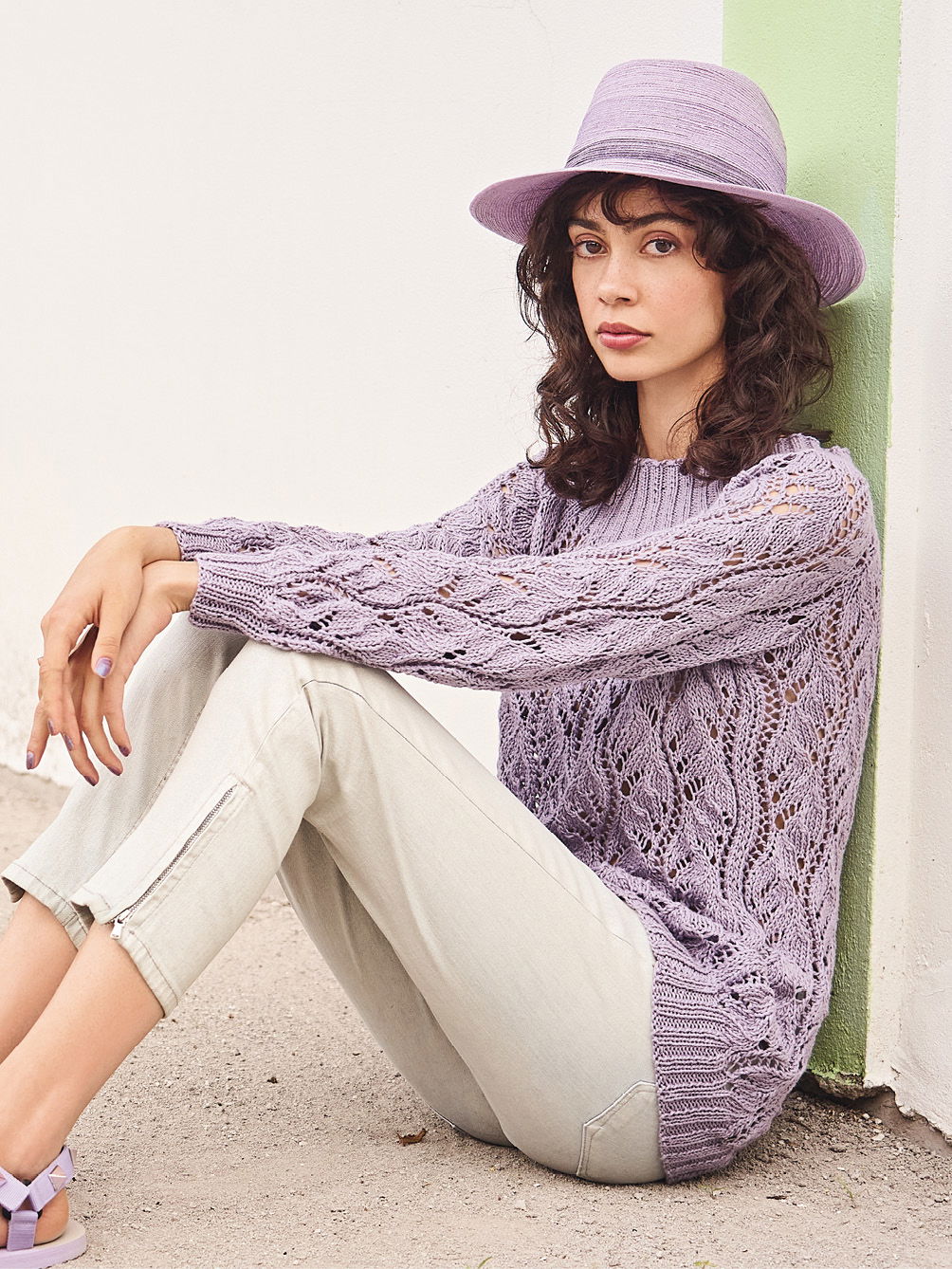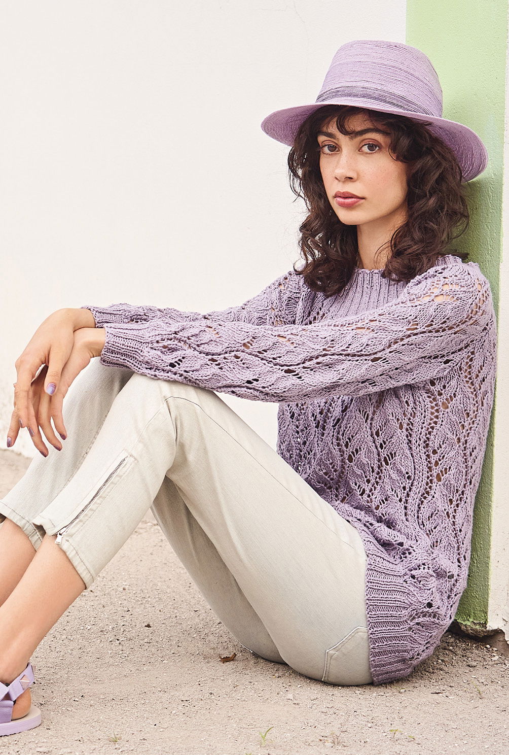 Ausdrucksvolle Spitzenmuster sind ein Stilmittel, um schlichten Schnitteneine spannende Optik zu verleihen – wie der fliederfarbene Pulli mit breiten Rippenblenden aufs Schönste beweist. Gestrickt wird der Sommerpullover in Einzelteilen und von unten nach oben. Direkt nach dem Bündchen geht es allover im zarten Ajourmuster weiter. Ein bisschen Konzentration braucht es für das Muster schon, aber die klare und übersichtliche Strickschrift hilft dabei, stets den Überblick zu behalten. Sind alle vier Teile fertig gestrickt, werden die Nähte geschlossen und aus dem Halsausschnitt die Maschen für das Rippenbündchen herausgestrickt. Danach nimmt der neue Sommerpulli dann am besten noch ein kleines Bad und wird schön glatt ausgestrichen und liegend getrocknet. Dabei entfaltet das Ajourmuster seine volle Schönheit.
