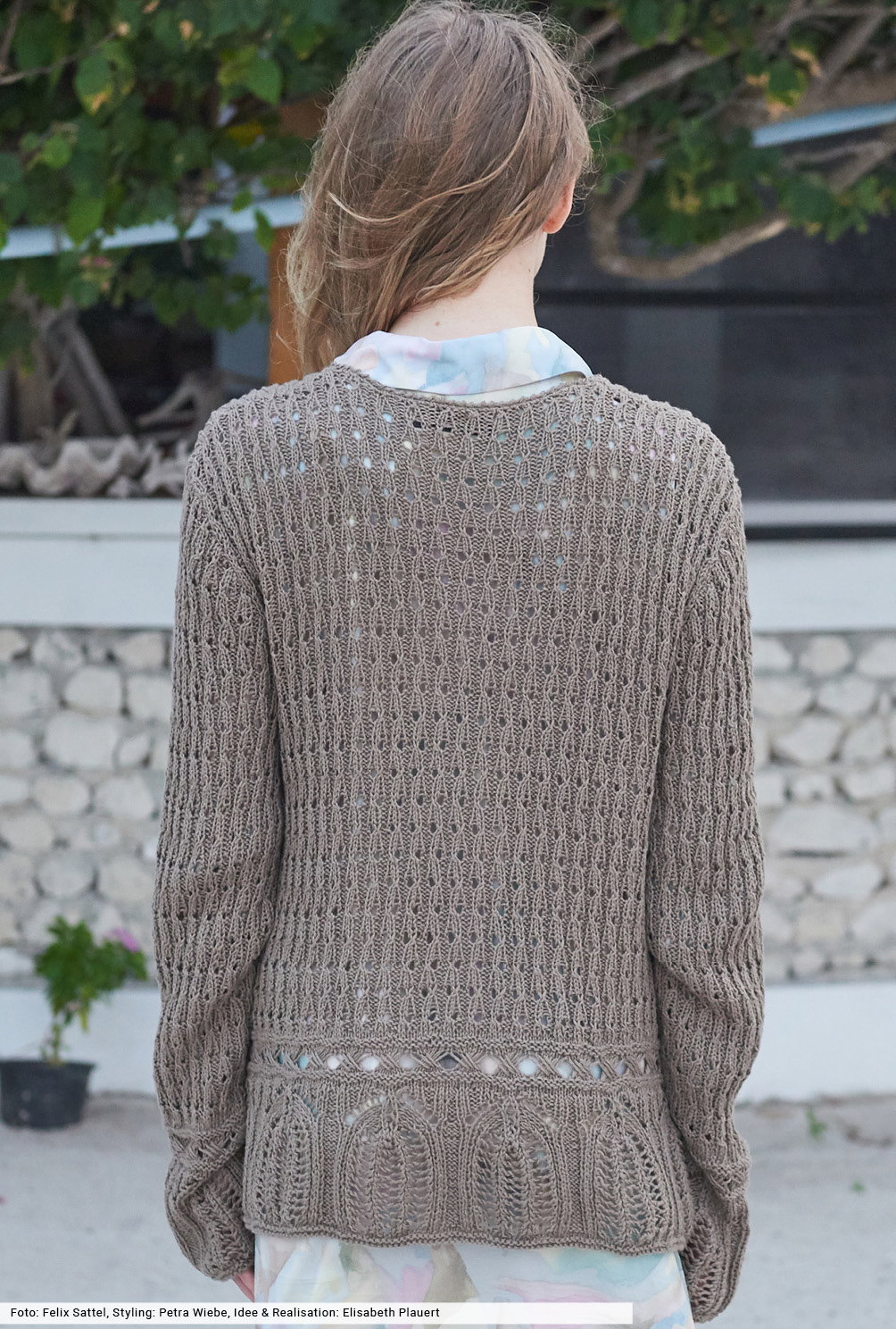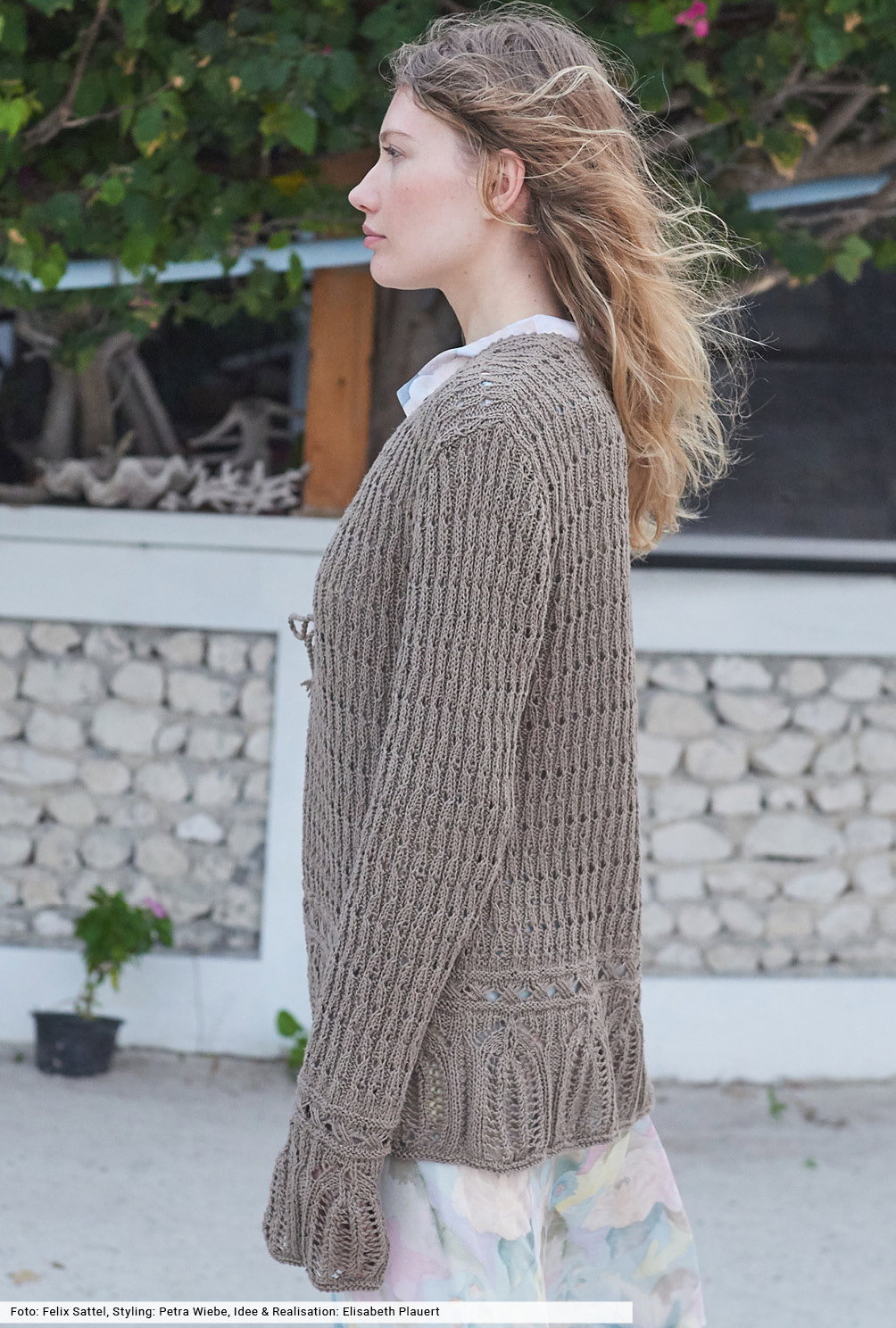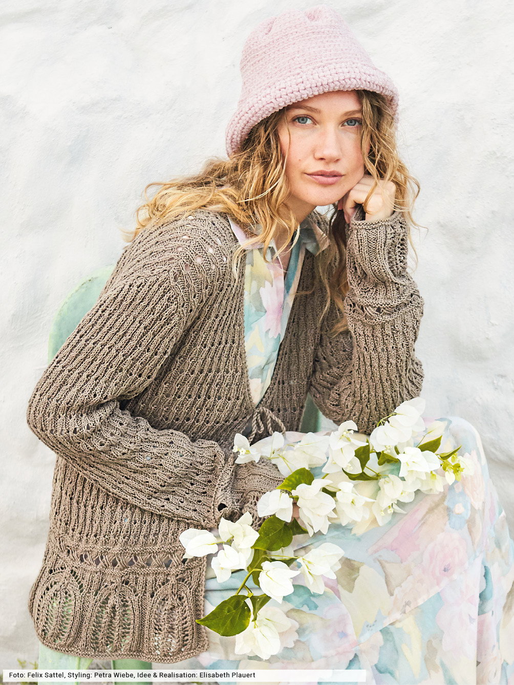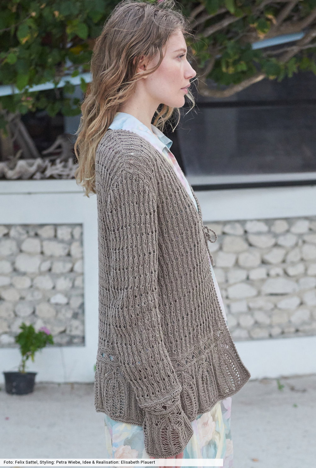 Jetzt haben lässige Jacken mit Bindebändern ihren großen Auftritt. Denn sie passen nicht nur zu Hosen, sondern auch zu Röcken oder am Strand zum Bikini. Der natürliche Farbton dieses Modells lässt das Bogen- und Fallmaschenmuster als Blende besonders schön zur Geltung kommen, das gleichmäßig strukturierte Lochmuster setzt sich allover in Szene. Fehlt nur noch ein Hut: aus leicht glitzerndem Chenillegarn wird er gehäkelt und vervollständigt selbstbewusst jedes Outfit.