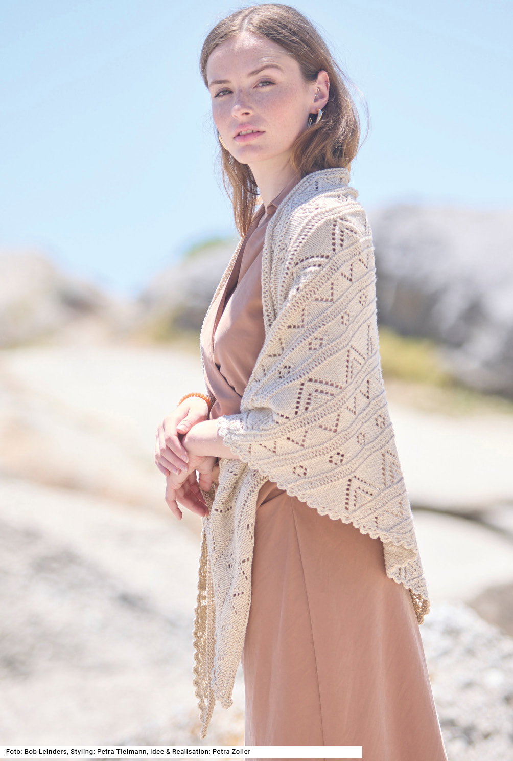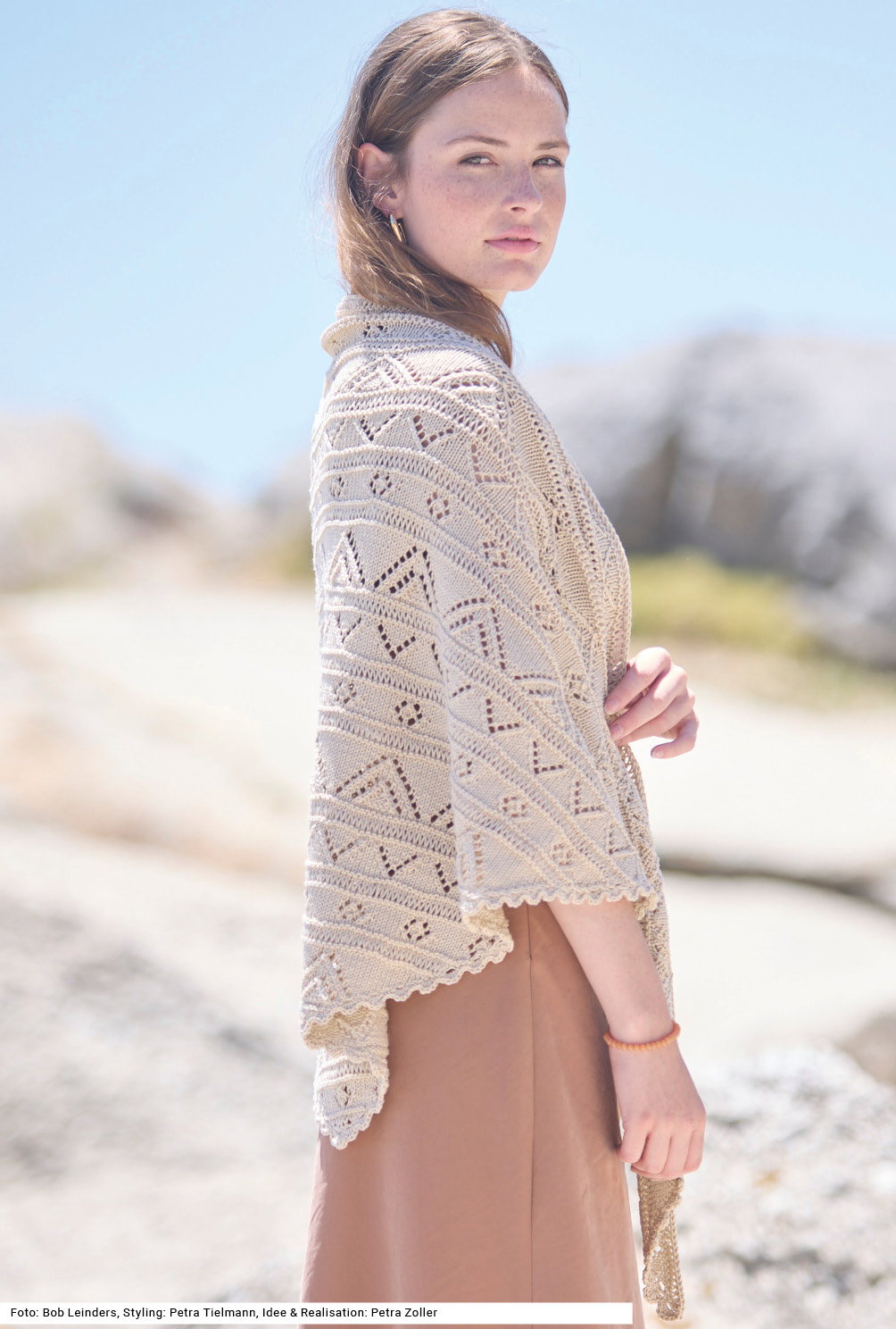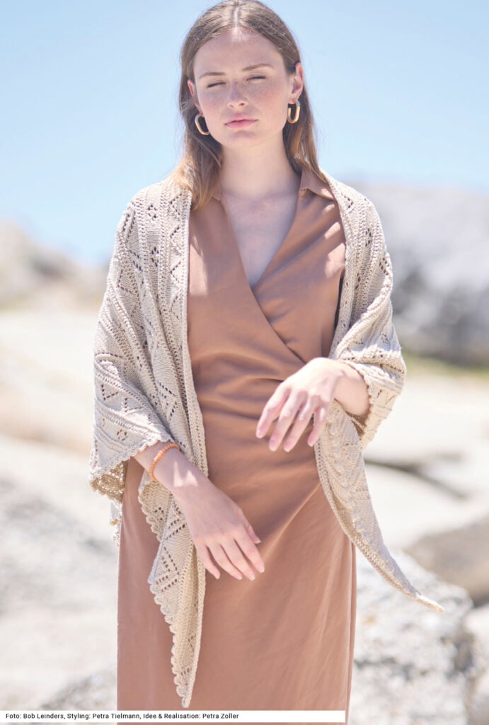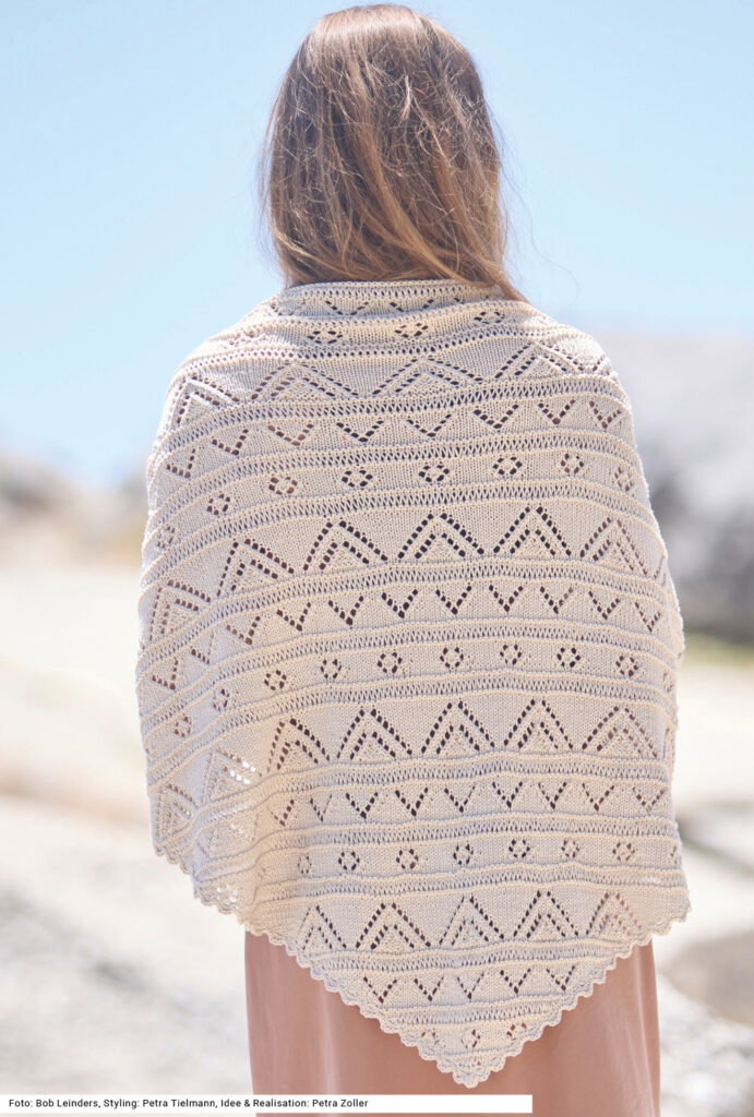 Ein Tuch muss zwei Eigenschaftenn erfüllen: Es soll ein schönes zu vielem tragbares Muster haben und es soll im Notfall auch die Schultern wärmen. Beides erfüllt dieses gestrickte Dreiecktuch mit unterschiedlichen Ajourmustern, die als Blumen, Zacken und Dreiecke erscheinen. Die einzelnen Muster werden durch kraus rechts gestrickte und Fallmaschen-Streifen getrennt. Eine gehäkelte Muschelkante perfektioniert das Ganze vortrefflich. Die verschiedenen Lochmuster-Rapporte folgen harmonisch übereinander und erzeugen ein Spiel aus Transparenz, Struktur und Bewegung. Die Anleitung dazu gibt es für ein Baumwollgarn und in einer Tuchgröße von 74,5 x 161,5 cm.