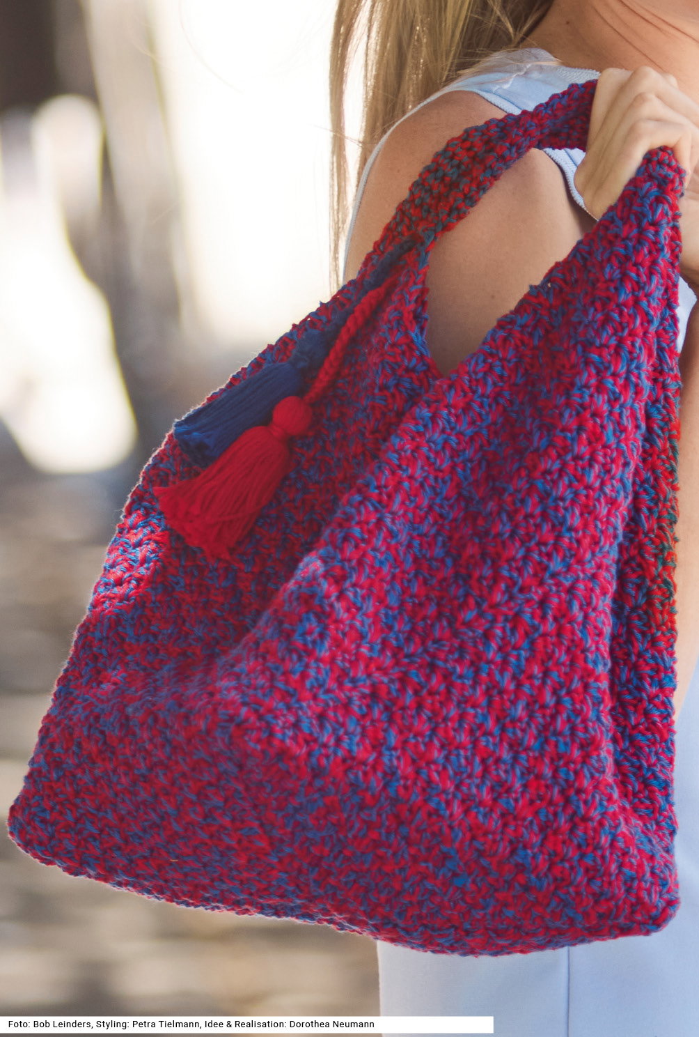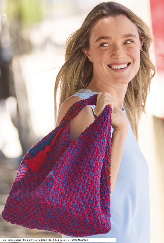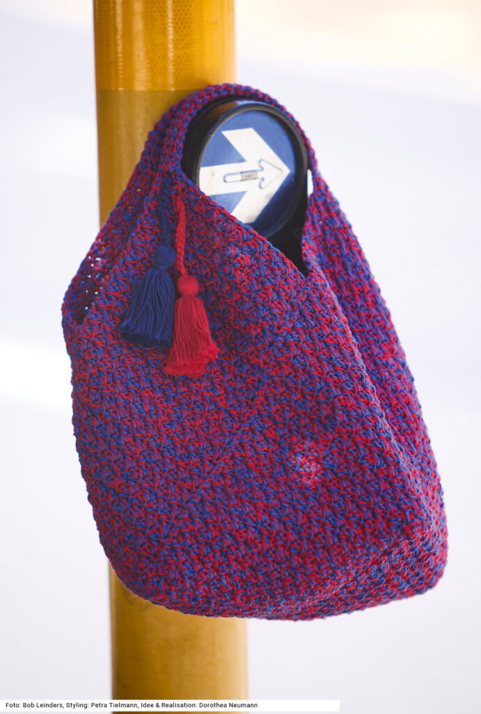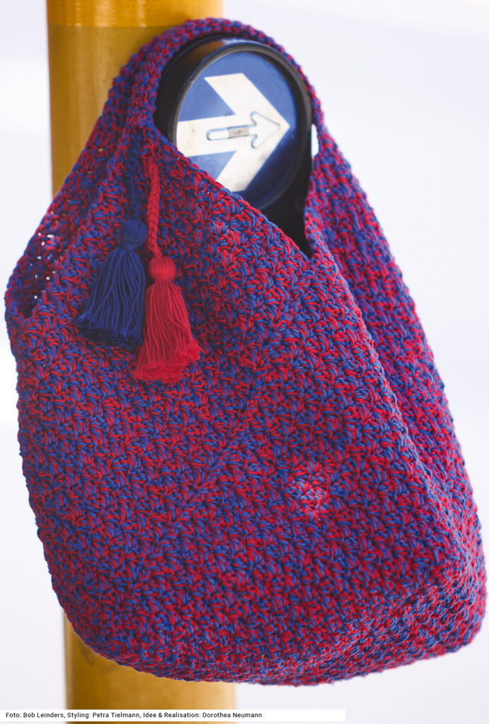 Kompakt im Format, raffiniert in der Konstruktion – diese baumwollene Tasche entsteht aus quer angesetzten Streifen, die sich zu einer plastischen skulpturalen Form verbinden. Keine Angst, dafür gibt es einen exakten Schnitt, der zeigt, wo die Flächen aufeinandertreffen. Das doppelfädige Häkeln in zweierlei Farben erzeugt einen lebendigen Melange-Effekt. Das kleine Muster besteht aus Stäbchen und festen Maschen. Hübsches Gimmick: zwei Quasten an den Henkeln, die für zusätzliche Aufmerksamkeit sorgen. Die Anleitung steht für eine Tasche mit den Maßen 22 x 44 cm bereit.