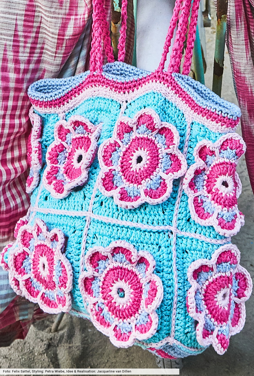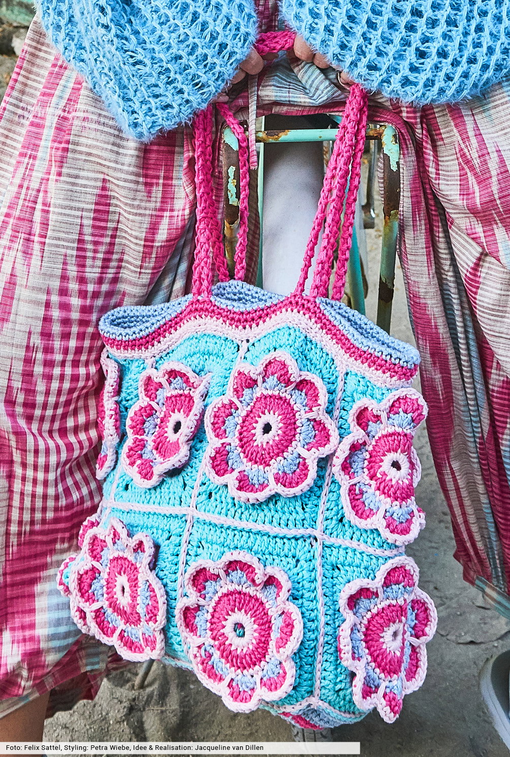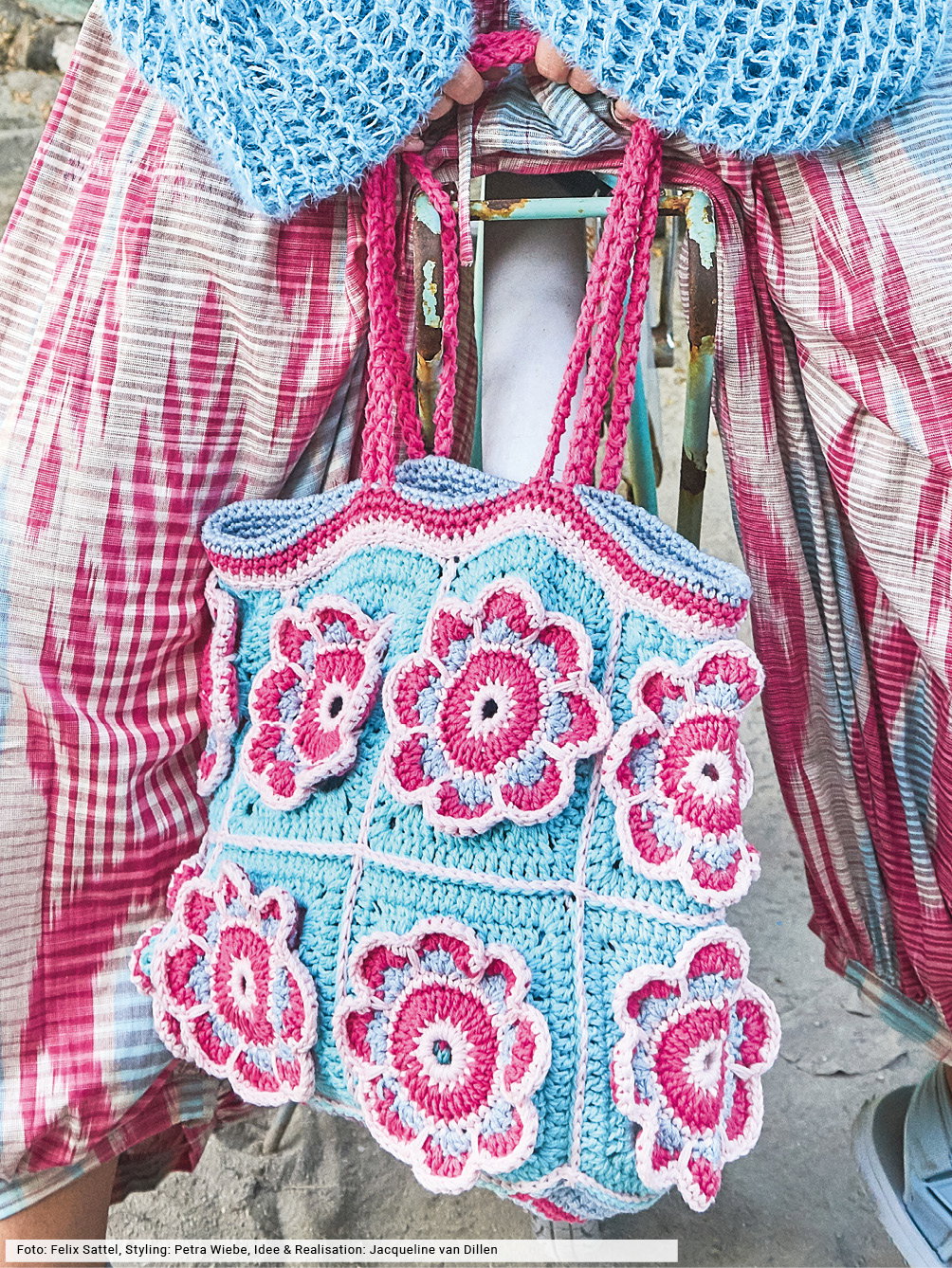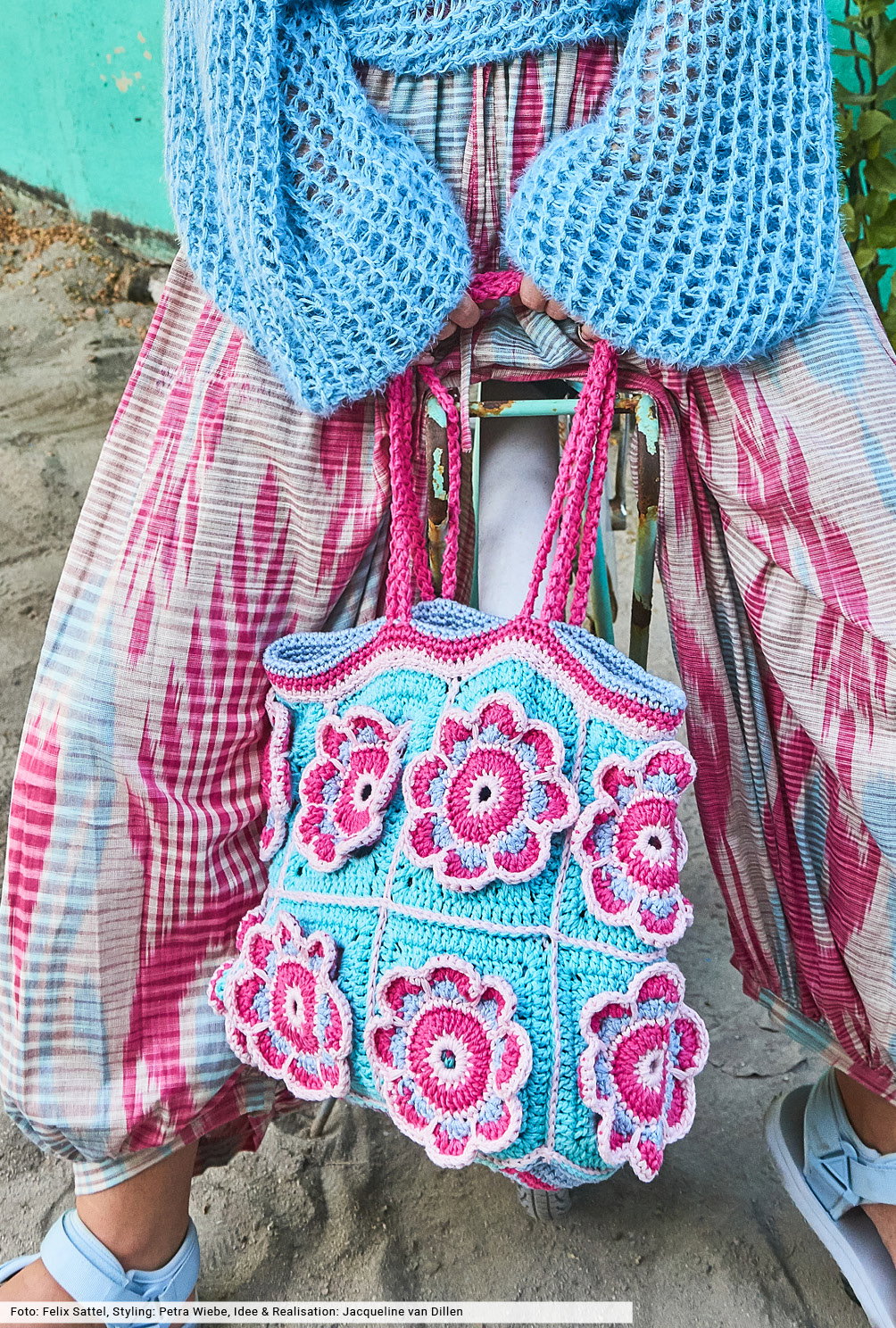 Ein bisschen retro, durch den farbenfrohen Mix jedoch modern und voller Beach-Attitüde – diese Häkeltasche aus Granny-Squares mit Blüten und Streifenelementen ist wie gemacht für lange Tage am Strand und passt perfekt zum Hoody und zum Bikini-Oberteil. Es wird doppelfädig gearbeitet. Zuerst häkelst du den Boden aus festen Maschen, dann folgen nach unserer Häkelschrift zwölf Grannys. Alles zusammenhäkeln und die Henkel anfertigen – und schon hast du ein Behältnis, in das alles passt, was du für einen Beach-Tag brauchst.