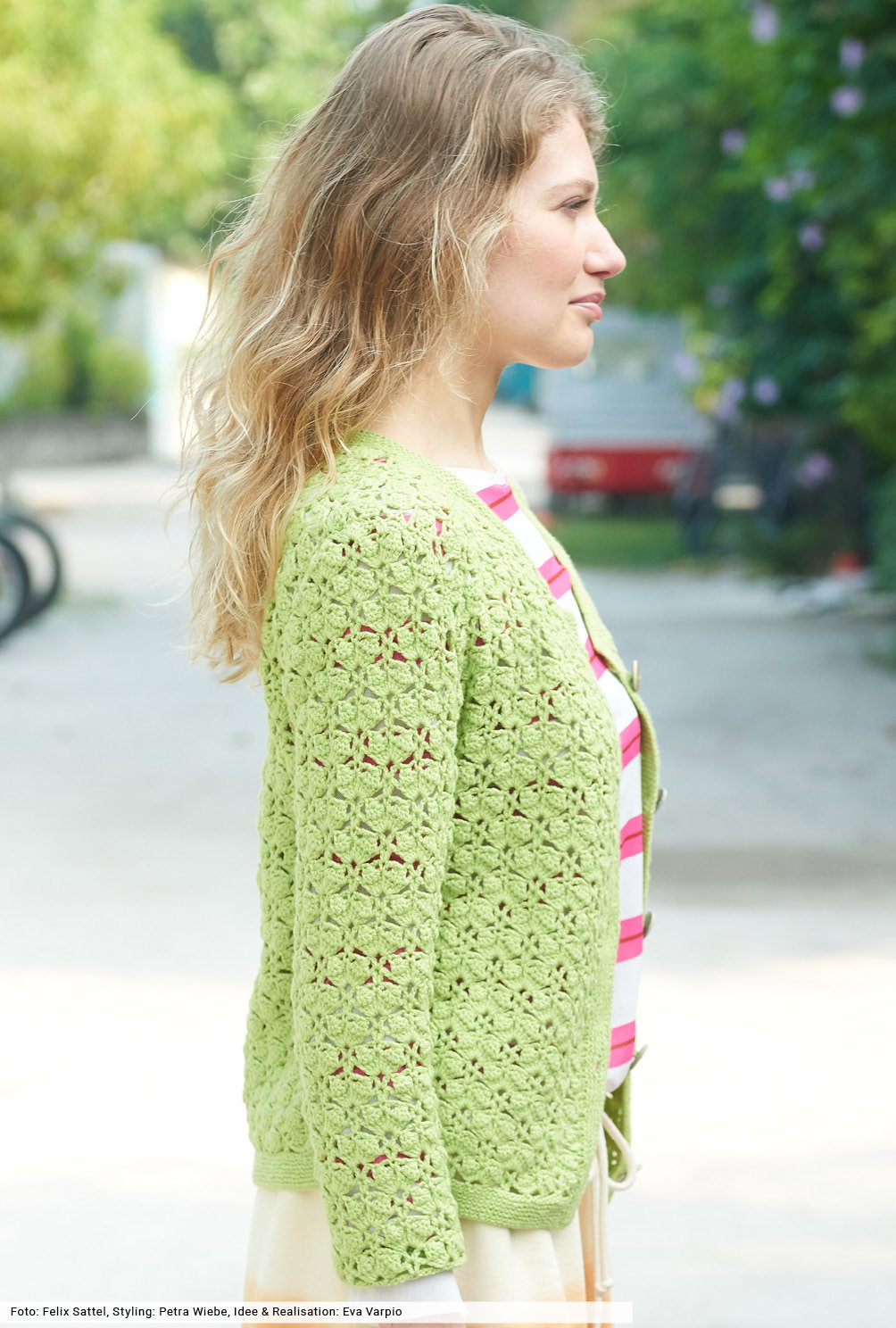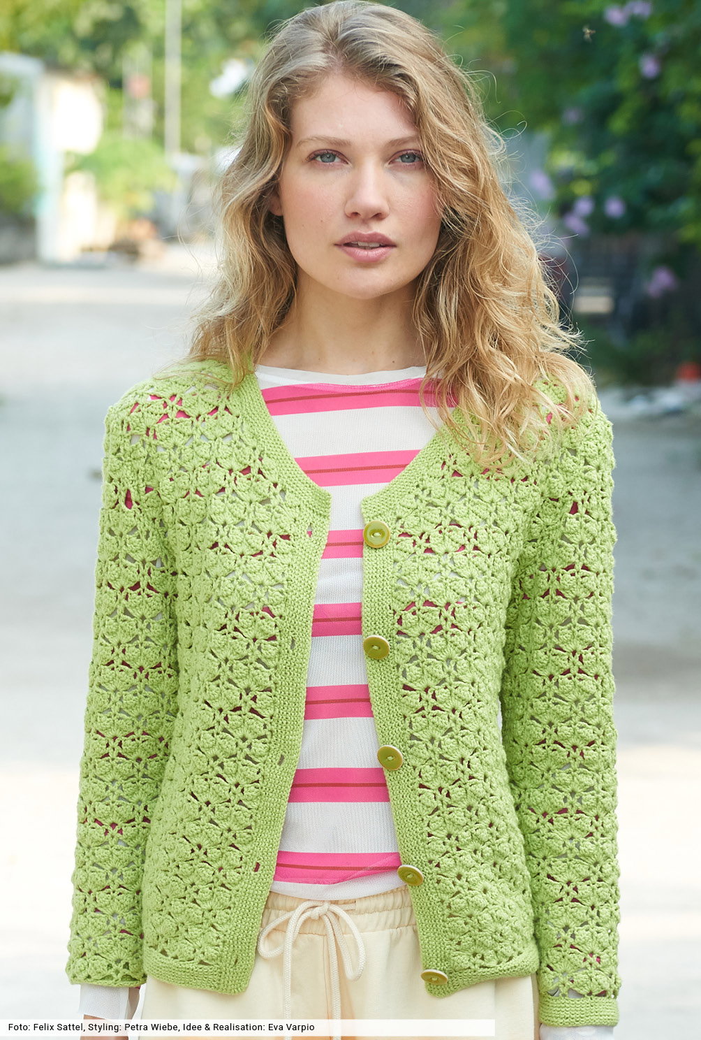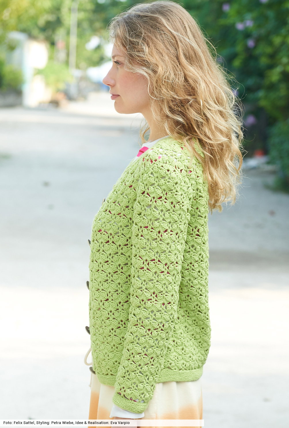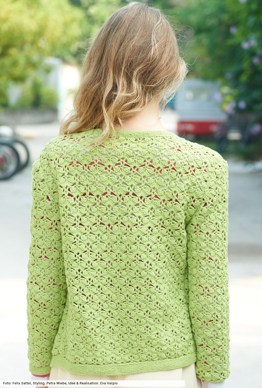 Fruchtig, frech, frisch – und gehäkelt! Für das Muschelmuster haben wir eine übersichtliche Häkelschrift erstellt, die genau zeigt, wie du arbeiten musst. Tipp: Erstelle eine kleine Maschenprobe, danach geht die dir die Arbeit umso leichter von der Nadel. Das Finish dieser hübschen Jacke bilden schmale Blenden, die kraus rechts an die Ränder und den Halsausschnitt gestrickt werden. Farblich passende Knöpfe runden auf harmonische Art und Weise die Optik ab.