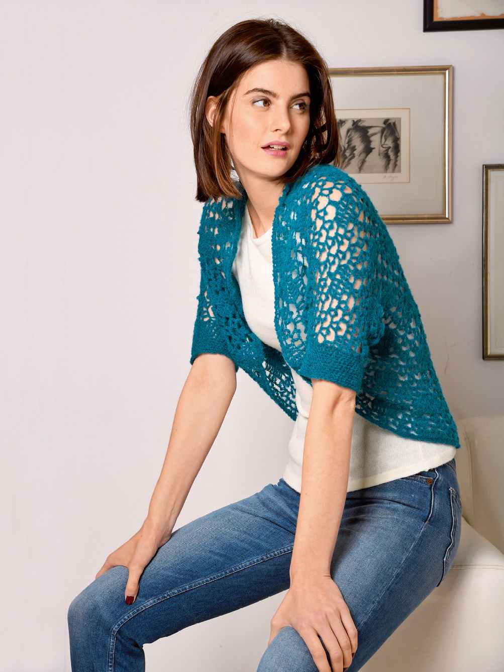 Taillenkurz ist dieser luftige Bolero. Er ist wirklich nicht schwer zu Häkeln. Das Muster bestehend aus Luftmaschen und Stäbchen. Si bekommt das Muster die Ajour Optik, die auf nackter Haut oder mit etwas hellem darunter getragen sehr gut zur Geltung kommt. Du häkelst ein ganz einfaches Rechteck. So hast du keine Zu- und Abnahmen. Im Anschluss nähst du die Seitennähte nach Plan zusammen, sodass die Ausschnitte für die Arme offenbleiben. An diese häkelst du dann Blenden aus festen Maschen, die den Seelenwärmer optisch abrunden. Du arbeitest mit Nadel Nr 4 und Garn von LANGYARNS. In der Anleitung findest du die Größe 36, 38, 40, 42, 44 und 46.