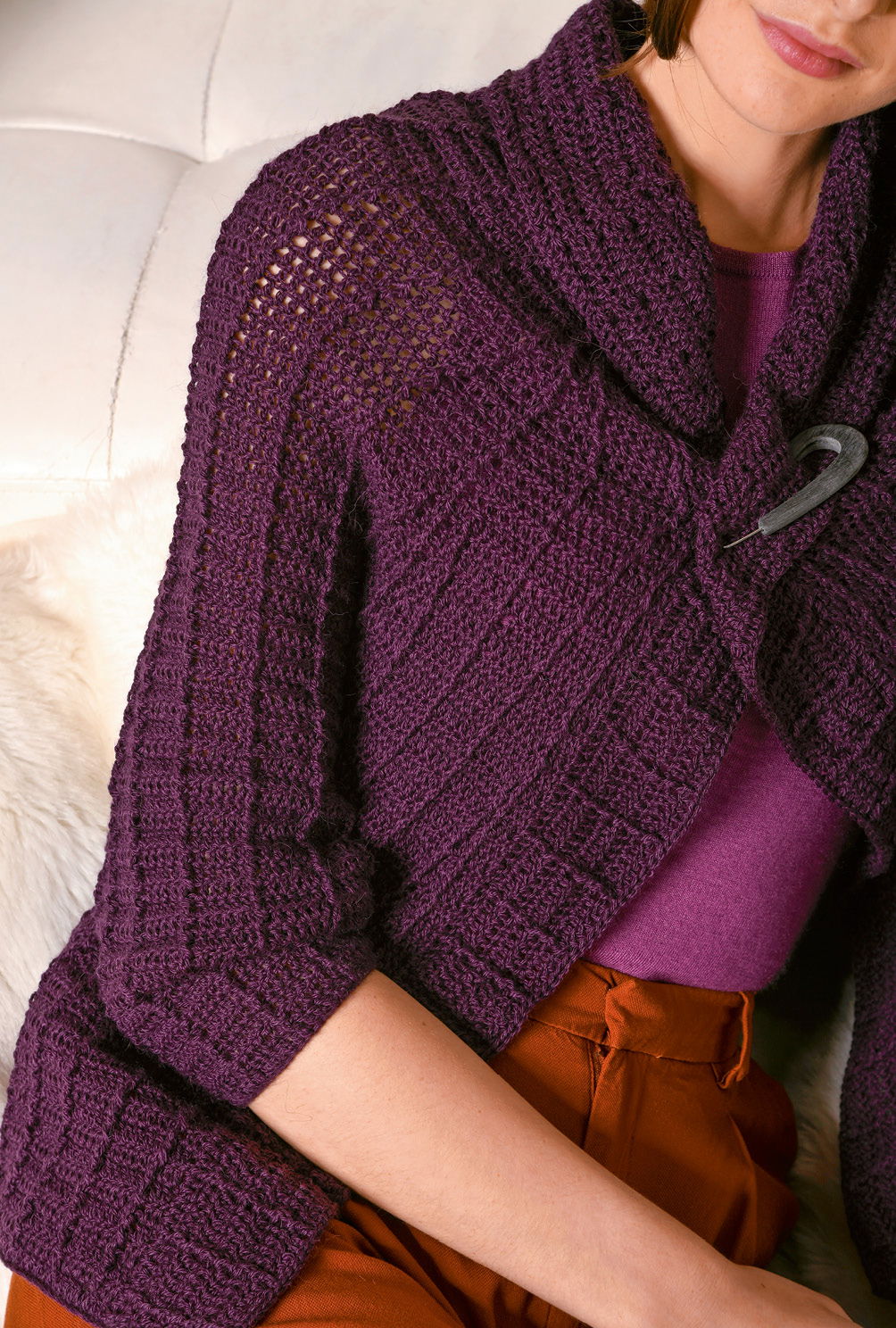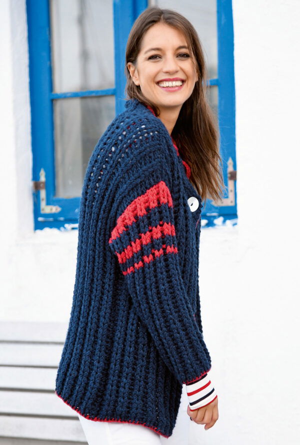 Was für eine außergewöhnliche Jacke! Das Muster setzt sich aus Stäbchen und Reliefstäbchen zusammen. Durch die Reliefstäbchen entsteht die Rippenoptik. Es sind doppelte Stäbchen die in den Hinreihen von vorne und in den Rückreihen von hinten um den Kopf des darunter liegenden Stäbchen gearbeitet werden. Das ist nicht weiter schwierig, nach ein paar Reihen hast du das Muster verinnerlicht. Besonderes Augenmerk liegt hier auf dem Schnitt. Der untere Teil ist relativ kurz, dafür ist die Raglanschrägung um so tiefer. Hier musst du genau nach Anleitung arbeiten. Du häkelst über alle Maschen und nimmst betont an 8 Stellen ab. Auch hier spielen die Reliefstäbchen wieder eine Rolle. Zum Schluss umhäkelst du für die Blenden noch den Ausschnitt und die Vorderteilkanten. Du arbeitest mit einer Häkelnadel Nr 3,5 und Garn von ggh. In der Anleitung findest du die Größen 36, 38, 40, 42, 44 und 46.
