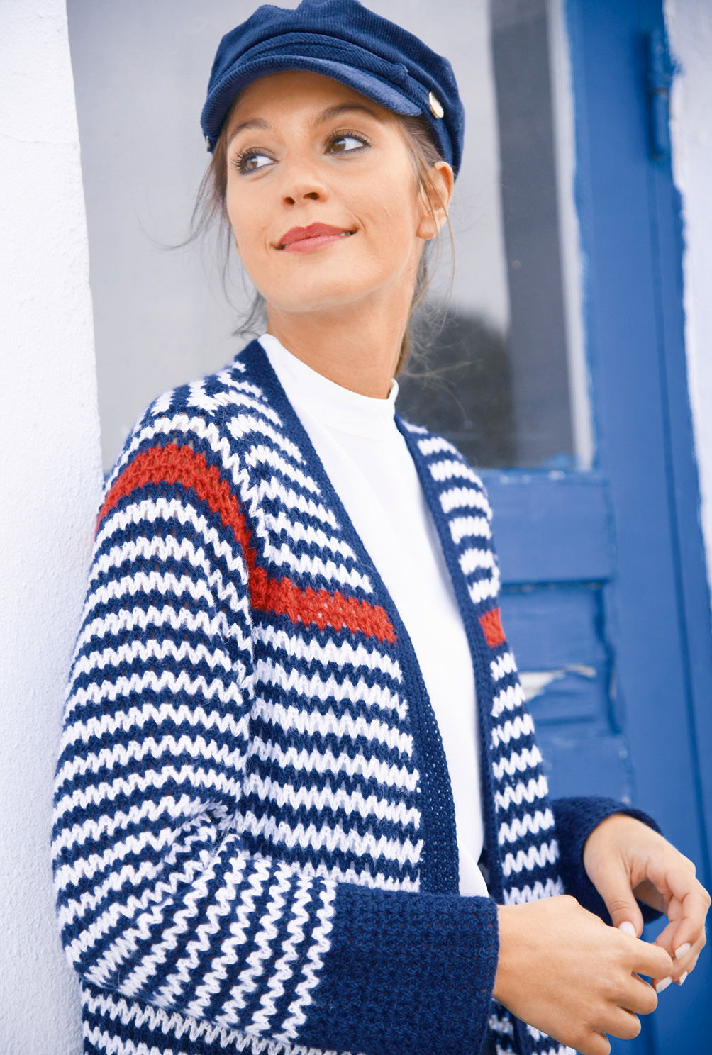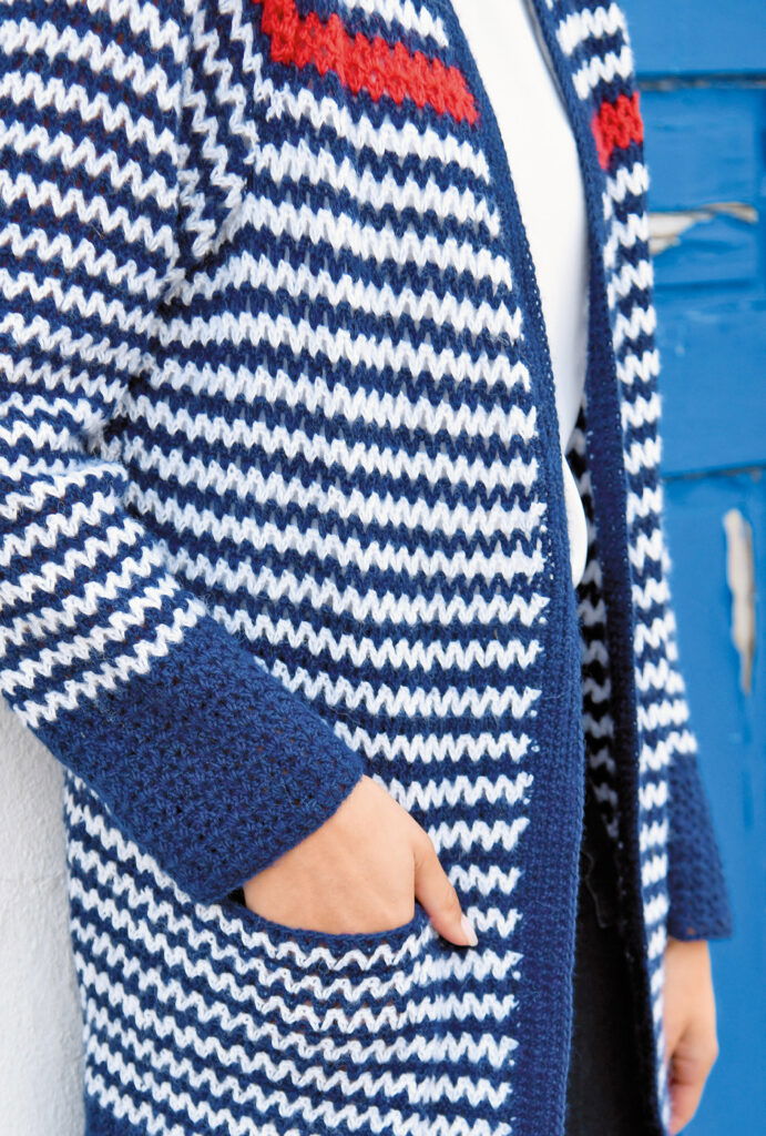Lässig und alltagstauglich ist diese schöne Jacke mit maritimem Flair. Das weiche Mischgarn, aus Baumwolle, Wolle und Alpaka, hat einen leichten Flausch und eignet sich für den Übergang hervorragend. Das Häkelmuster ist ganz einfach. Es wird mit Stäbchen und Luftmaschen gearbeitet. Die breiten Blenden am Saum und an den Ärmeln geben den farblichen Rahmen. Dasselbe Muster, dann in Streifen gehäkelt, wirkt ganz anders. Es erscheint in Zick-Zack-Linien. Einen besonders schönen Farbakzent setzt dann der breite, rote Streifen, der sich in allen Teilen findet. Verschlusslos werden die vorderen Kanten und der V-Ausschnitt mit festen Maschen behäkelt. Wer möchte, kann hier sehr einfach Knopflöcher arbeiten, um die Jacke mit Knöpfen zu schließen. Du häkelst mit Nadel Nr 3 und Garn von Lana Grossa. In der Anleitung findest Du die Größen 36, 38, 40, 42, 44 und 46.