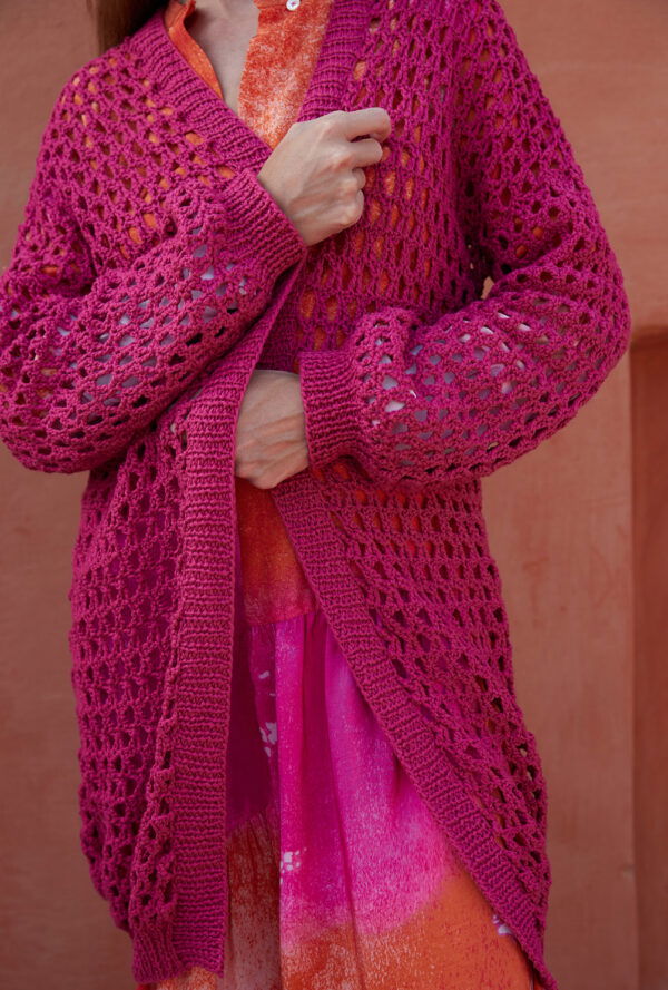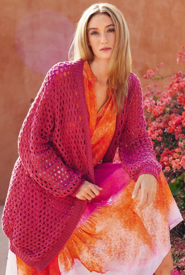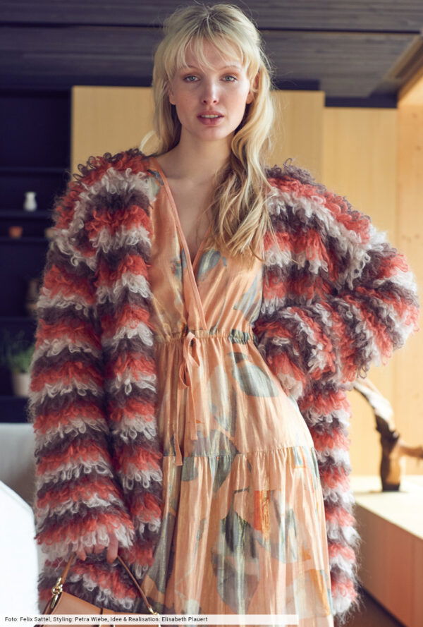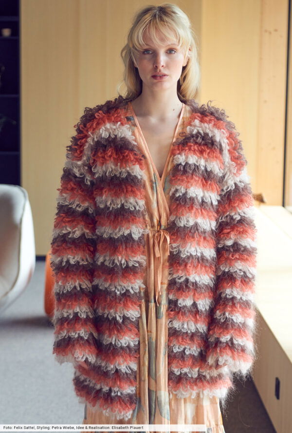 Wer schon lange nicht mehr gehäkelt hat, kann sich hier voll und ganz auf das Muster aus Luftmaschen, Stäbchen und festen Maschen konzentrieren. Denn dieser tolle Poncho entsteht aus einem Rechteck, das zum Schluss an den seitlichen Rändern zusammengenäht wird. Besonders reizvoll ist auch die Kombination aus hellem Mint und warmem Braun – ein Farbkontrast, dem man nicht alle Tage sieht. Das weiche Alpakamixgarn sorgt für den lockeren Fall und umhüllt die Körperkonturen. Unser Fazit: wärmstens zu empfehlen!