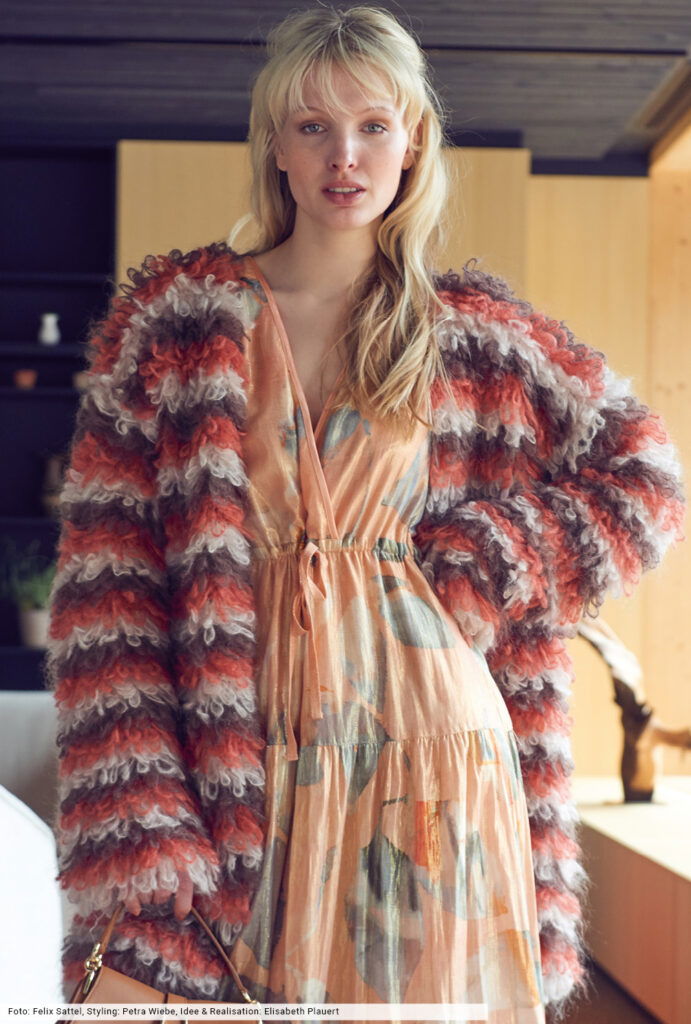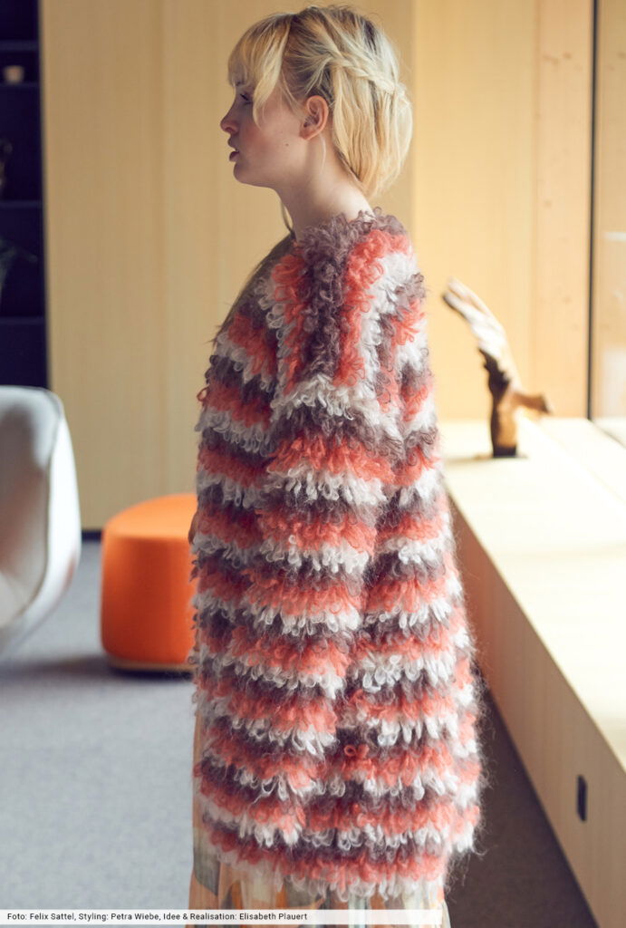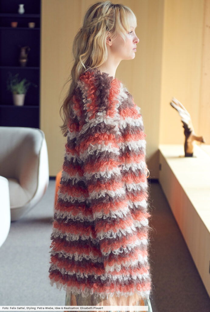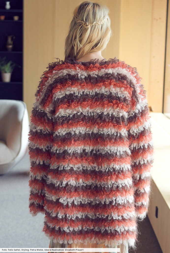 Die Franseneffekte dieser kuscheligen, verschlusslosen Jacke entstehen durch Schlingen, die um den MIttel- und Ringfinger gelegt und mit festen Maschen abgehäkelt werden. Streifenweise in drei Farben ein tolles Design, das wir aus einem flauschigen Mohairgarn erstellt haben. Die Teile werden, bis auf eine kleine Schrägung an den Ärmel, gerade gearbeitet und sind auch von weniger versierten Handarbeitskünstlerinnen machbar.