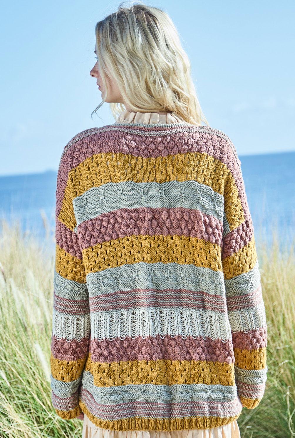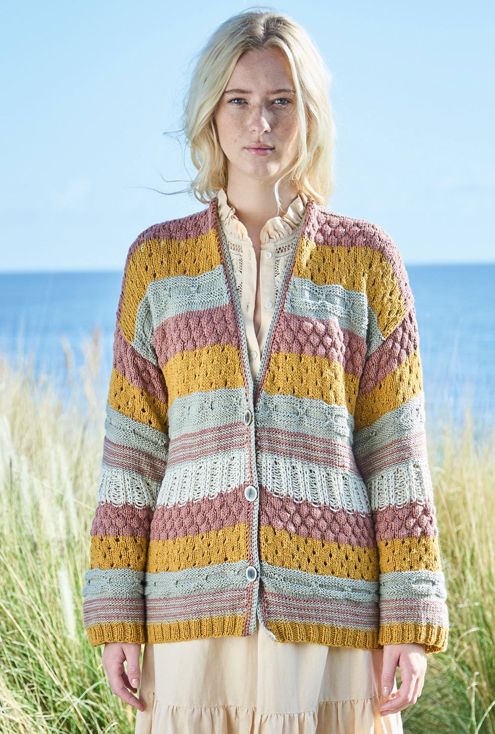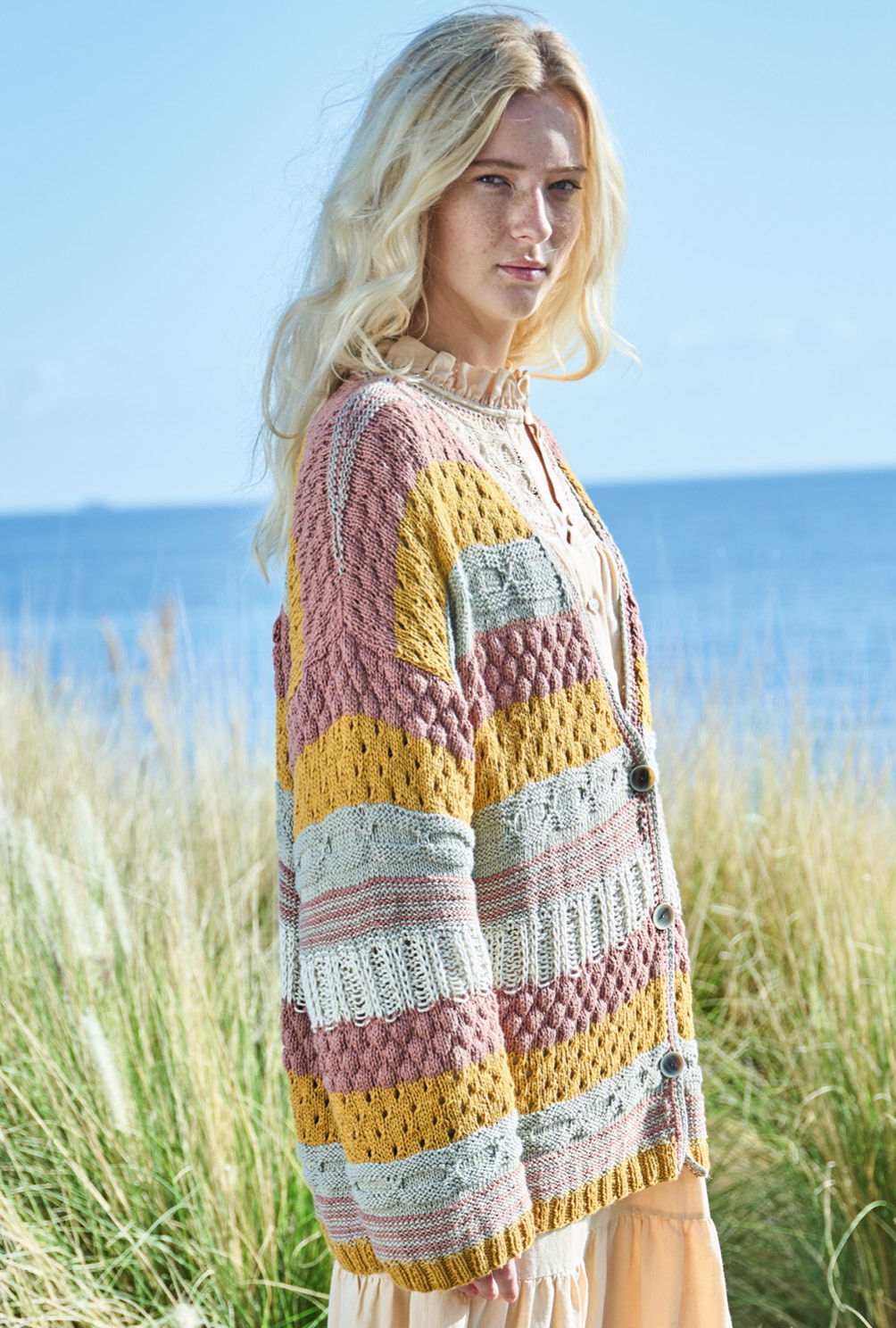Diese tolle Jacke ist Strickprofis vorbehalten, denn sie ist durch ihre Vielzahl an unterschiedlichen Mustern nicht nur anspruchsvoll, sondern erfordert auch etwas Geduld. So entsteht Streifen für Streifen ein Highlight in Sachen Strick, zu der auch die Farbkomposition aus warmen Braun-, Curry- und Naturtönen beiträgt. Das Ganzjahresgarn aus Baumwolle und Viskose ist weich und anschmiegsam, lässt alle Strukturen toll zur Geltung kommen und setzt sich bis weit in den Herbst hinein in Szene. Umhäkelte Kanten und die Knopfleiste bilden das Finish.