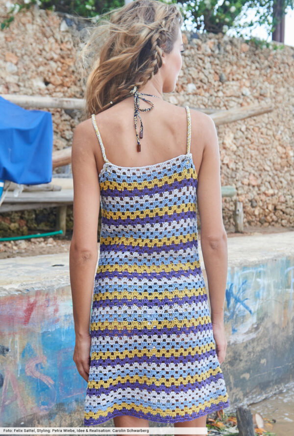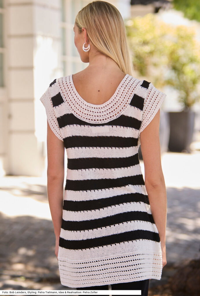 Wer sowohl gerne strickt als auch gerne häkelt, kommt bei dieser Tunika voll auf seine Kosten. Die mit einer Lochreihe abgegrenzten Streifen werden gestrickt, die Saumkante, die breite Blende am tiefen runden Halsausschnitt und auch die kurzen Flügelärmelchen sind hingegen als Filetmuster aus halben Stäbchen und Luftmaschen gehäkelt. Das ganze Design zielt auf feminine Leichtigkeit ab. Ein Garn aus Baumwolle und Viskose glänzt dezent und trägt sich angenehm kühl auf der Haut. Die Anleitung dazu gibt es für die Größen 38/40, 42/44 und 46/48.