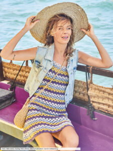 Wer schon lange nicht mehr gehäkelt hat, findet hier das perfekte Einstiegsmodell. Für das transparente Gittermuster gibt es bei der Anleitung eine Häkelschrift, die Abfolge der Farbstreifen und die Abnahmen für die Seitenschrägungen sind in der Anleitung genau beschrieben. Zum Schluss werden die in ICord-Technik gestrickten Träger an den oberen Rand genäht, fertig ist ein bezauberndes Kleid, dass dich nicht nur auf Festivals begleiten wird.