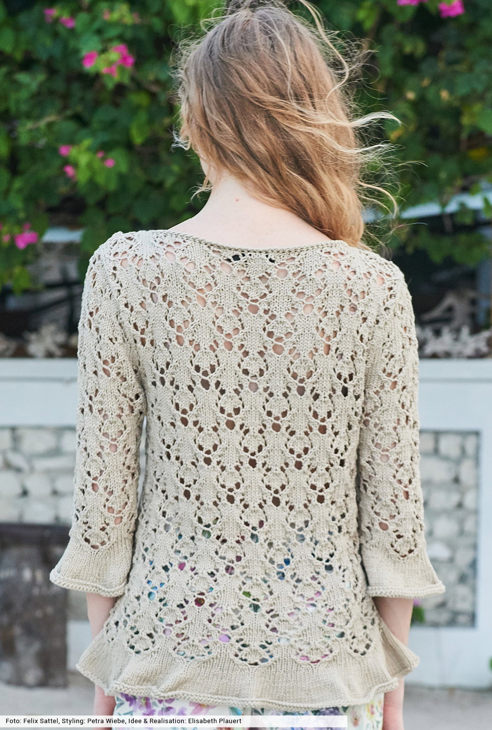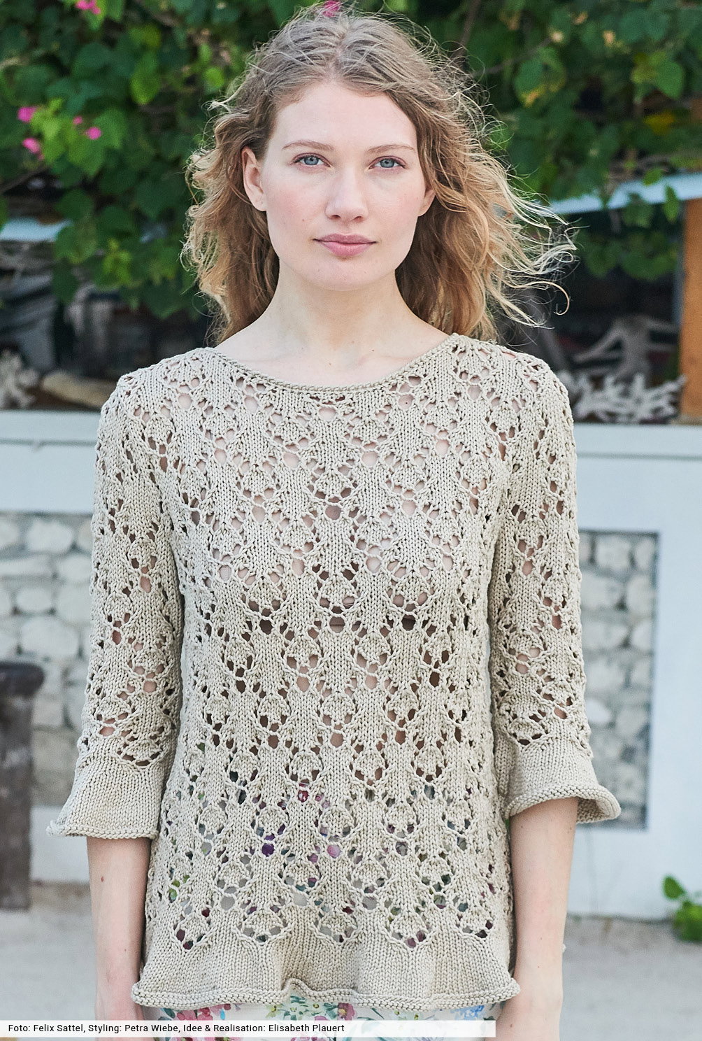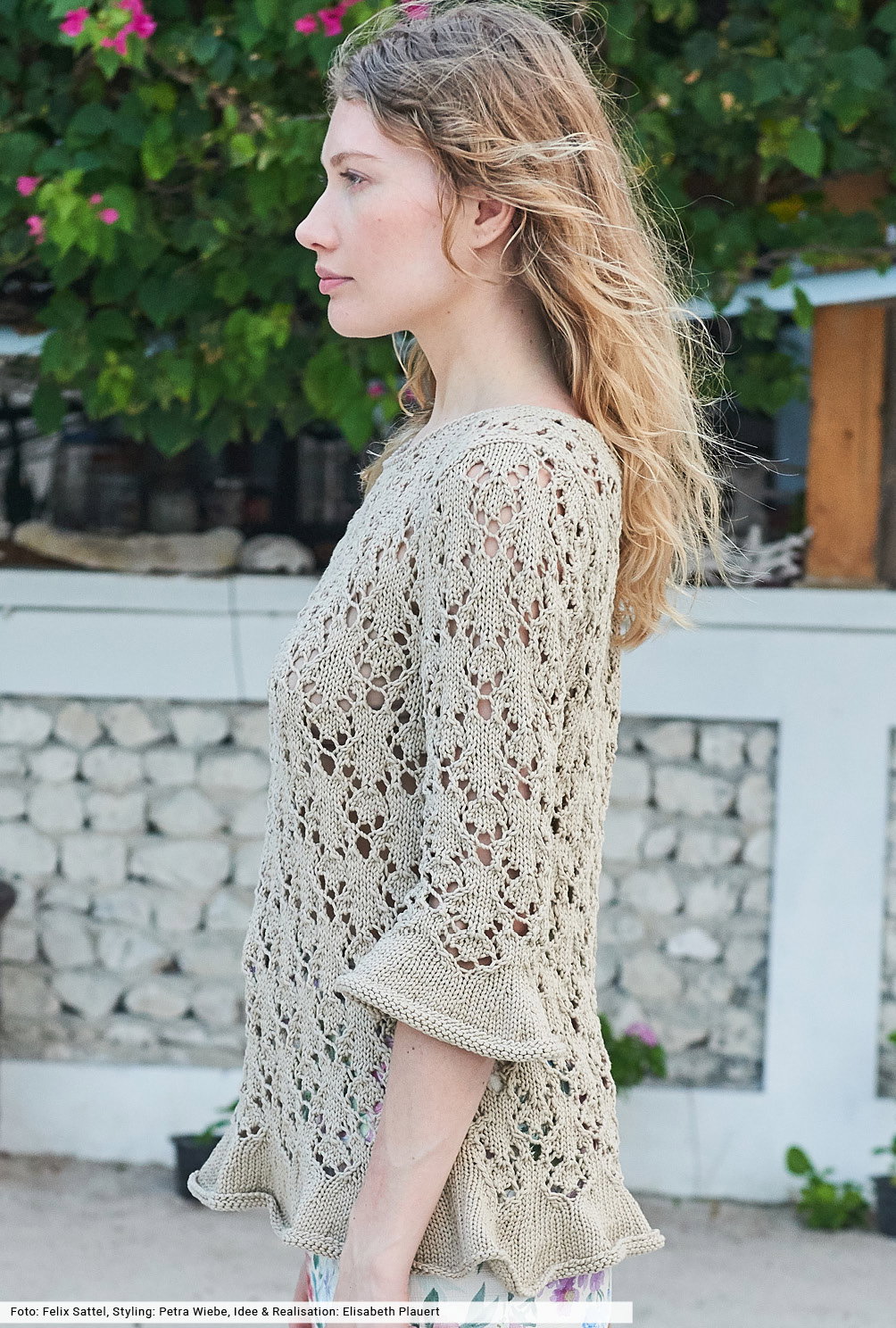 Für einen Sommer, der sich leicht und besonders anfühlt, ist dieser Pulli der richtige Begleiter. Gestrickt aus einem etwas griffigeren Baumwollbändchen kommen die Lochstrukturen sehr aussagekräftig zur Geltung. Die übersichtliche Strickschrift findest du bei der Anleitung und schon nach wenigen Reihen bist du im „Flow“. Wenn du vor der Arbeit eine Maschenprobe anfertigst, geht’s umso schneller. Probiere es aus!