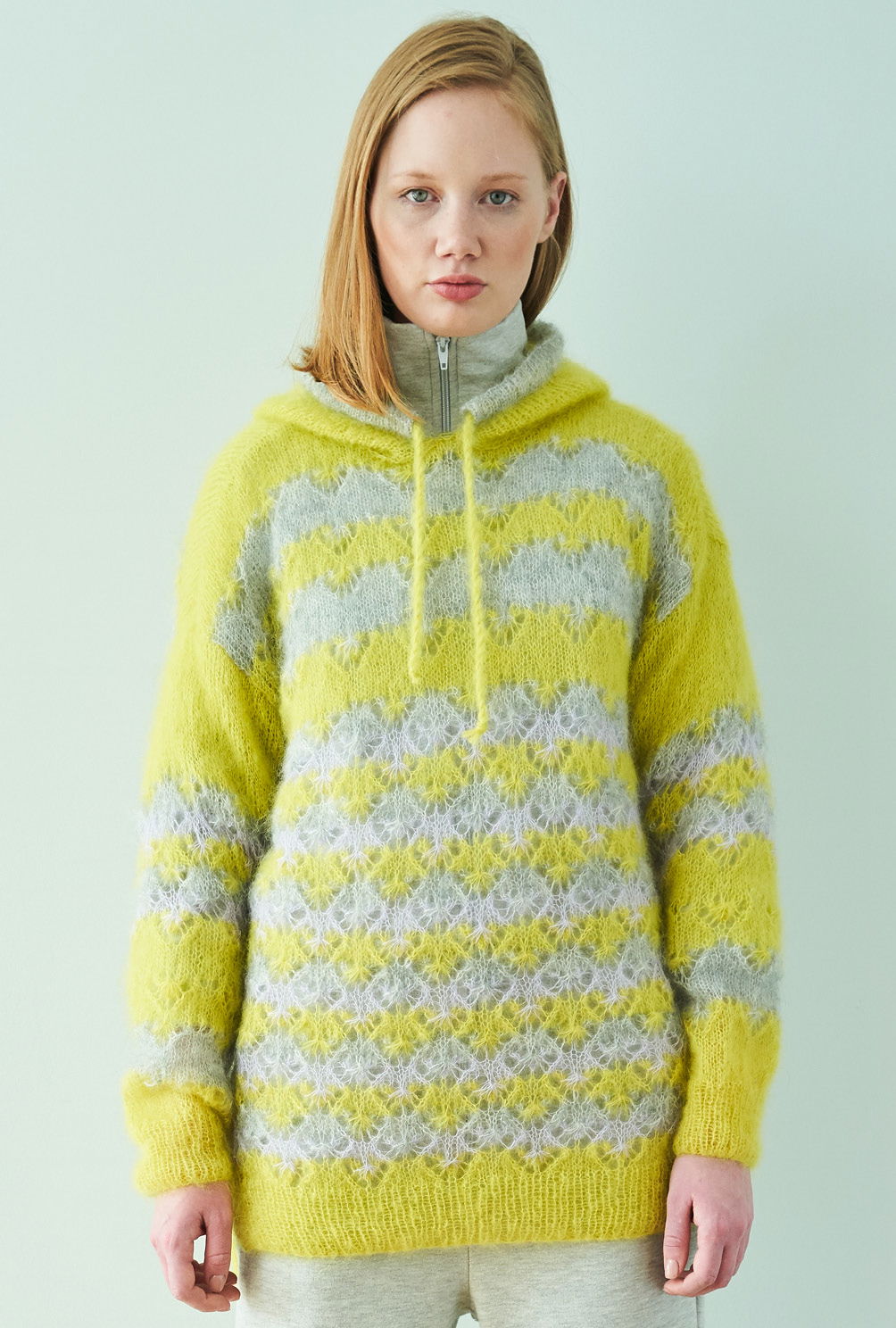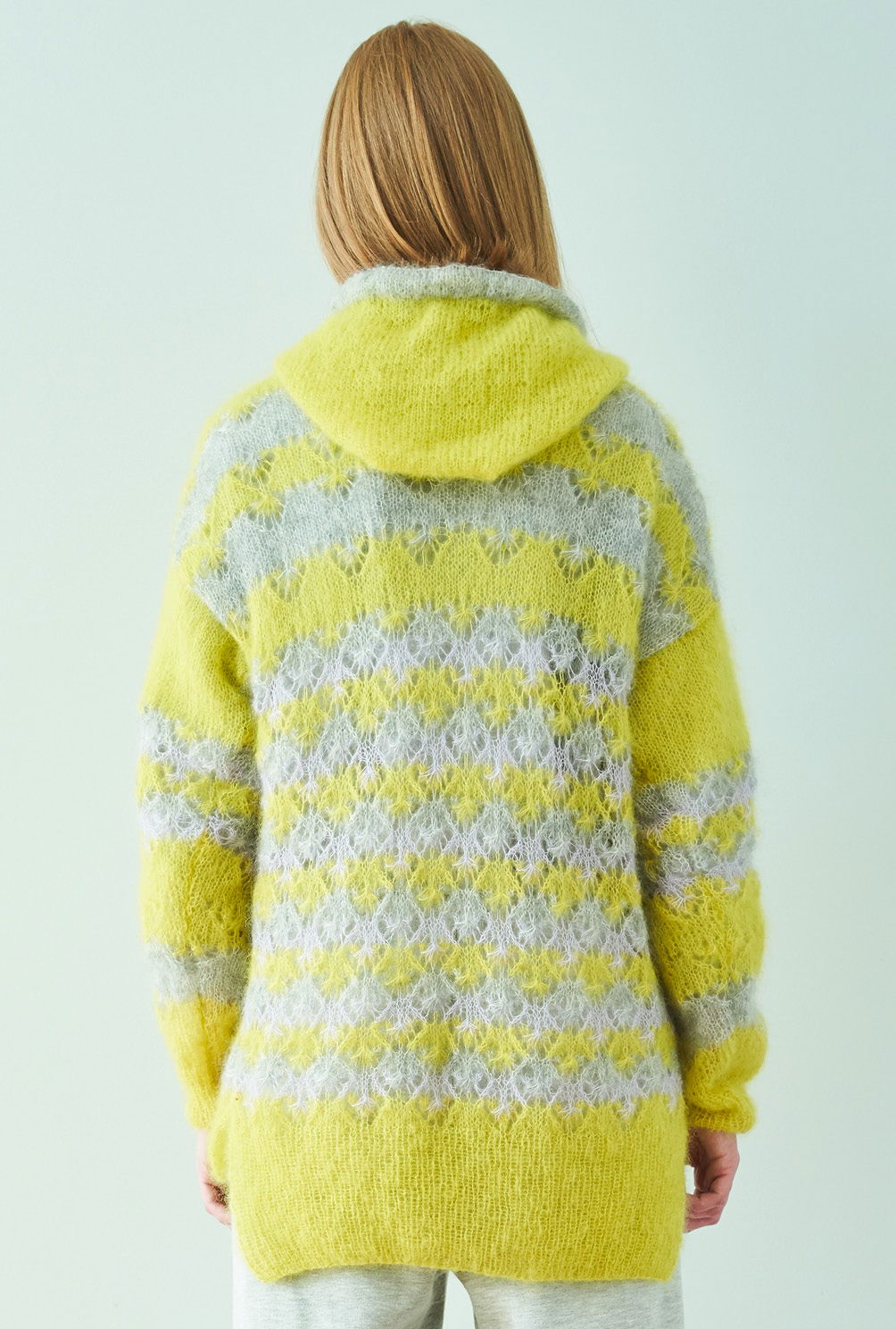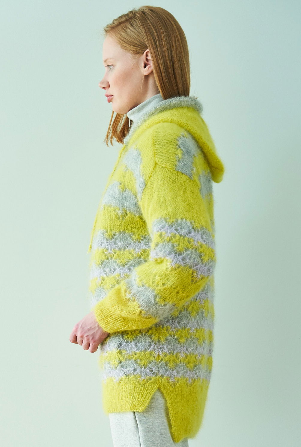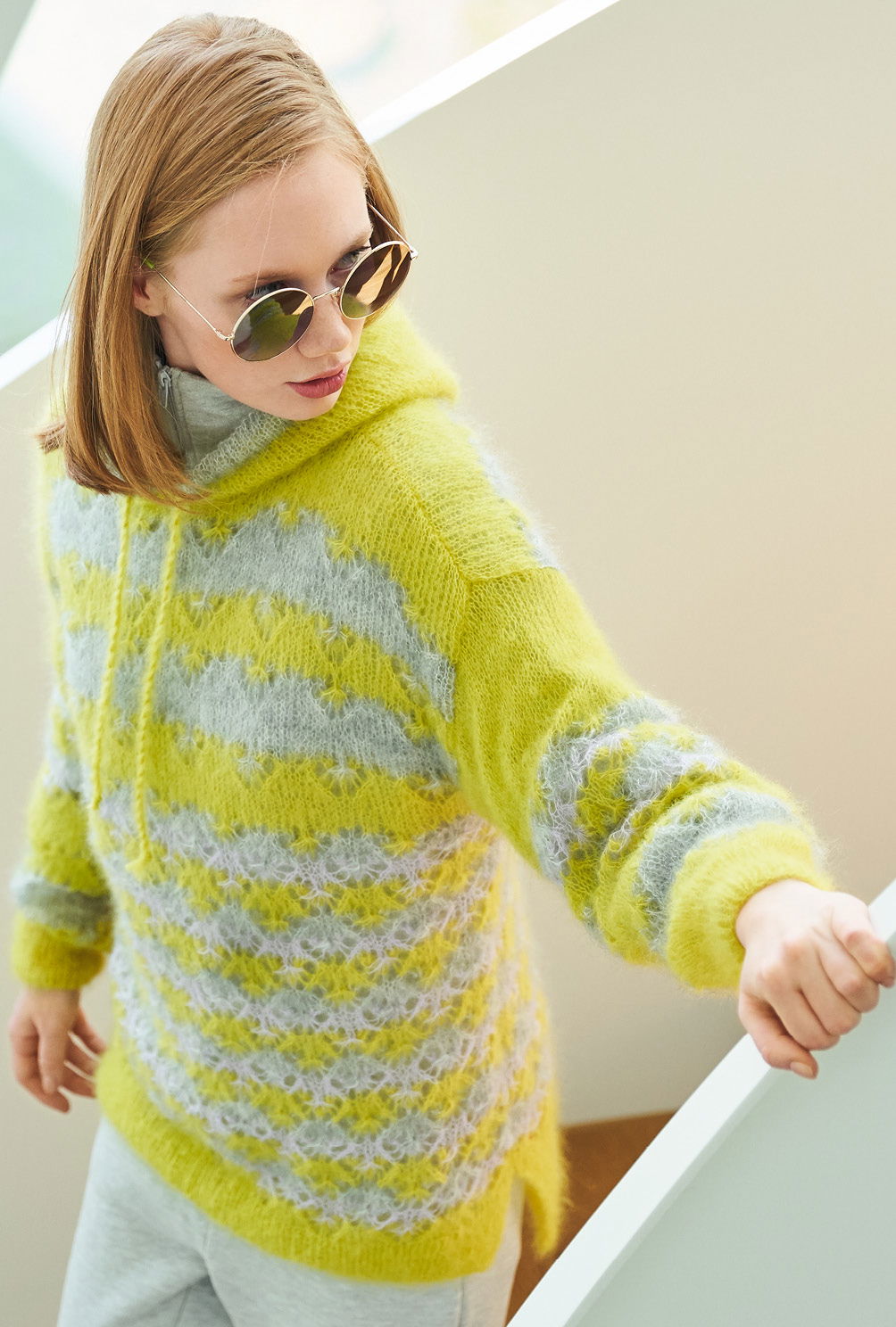 Aus feinstem Mohair-Seidengarn entsteht dieser High-Low-Pulli, dessen dreifarbige Ajourstrukturen für die spannende Optik sorgen. Seitliche Schlitze und die Kapuze vermitteln Lässigkeit und geben das modische Upgrade. Für ganz viel Strickspaß ist natürlich auch gesorgt – der Farbwechsel bietet Abwechslung und zur Erholung werden zwischen dem – zugegeben eher anspruchsvollerem – Ajourmuster, immer wieder einige Reihen glatt rechts gestrickt. Für das Lochmuster wird in jeder 7. und 13. Reihe eine Häkelnadel benötigt – so entsteht der ganz besondere Effekt dieses Musters. Die übersichtliche Strickschrift in der Anleitung hilft dabei, stets die Übersicht im Muster zu behalten. Sind Vorderteil, Rückenteil, Ärmel und Kapuze fertig gestrickt, werden noch alle Nähte geschlossen und eine Kordel durch den Tunnelzug der Kapuze gezogen.