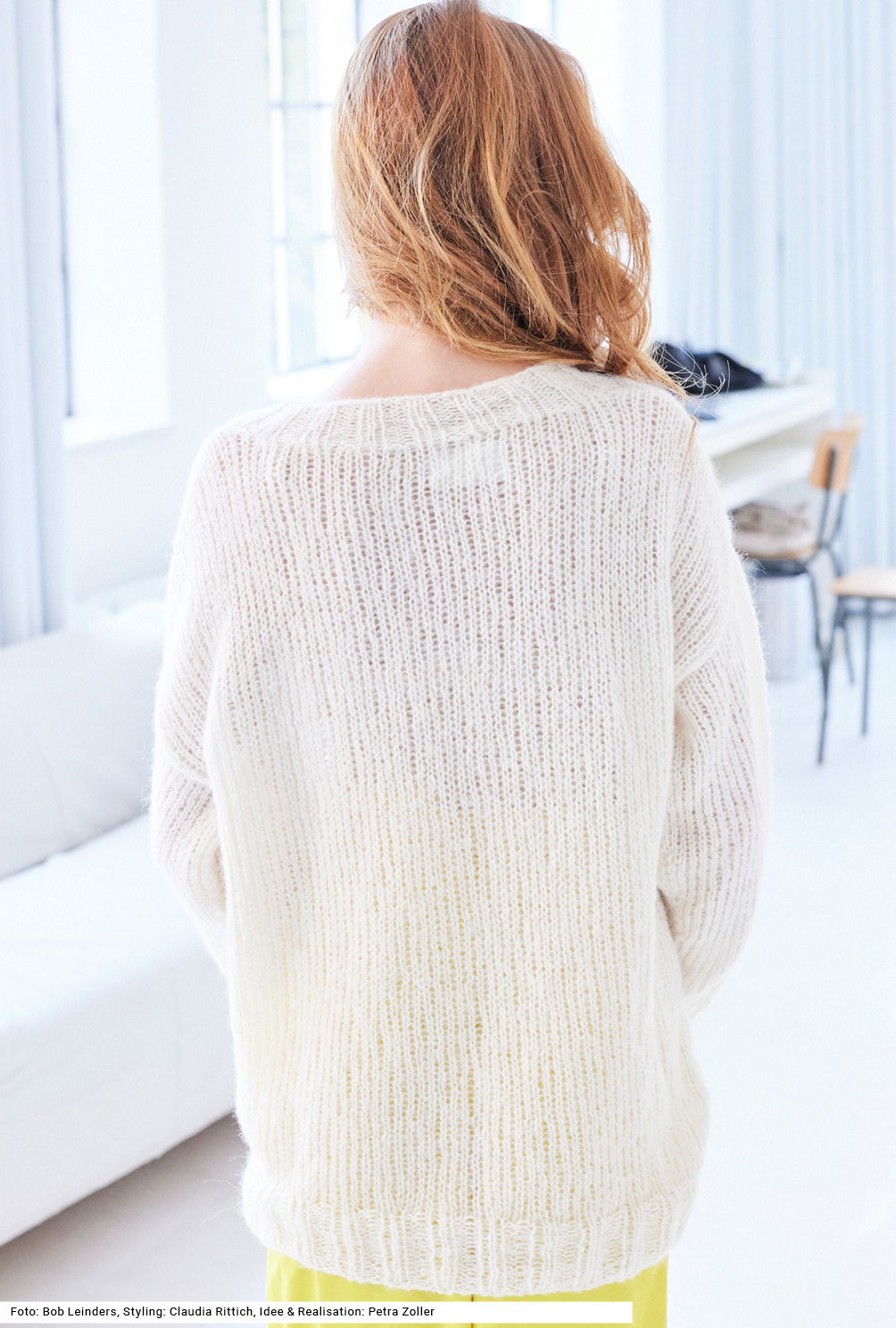 Dieser Pullover in neutraler Farbe beweist, dass schlicht nicht langweilig bedeutet. Er ist glatt rechts gestrickt, mit Bündchen und Ausschnittblende im 2/2-Rippenmuster. Der oversized geschnittene Pulli liegt herrlich zart auf der Haut, denn er wird aus einem Garn mit Merino-, Alpaka- und Seidenanteil gestrickt. Highlight ist ganz klar das aus Kettmaschen aufgestickte Blattmotiv, das in einer kraftvollen Farbe zum strahlenden Hingucker wird. Eine Anleitung kann für die Größen 36/38 und 40/42 sowie 44/46 downgeloadet werden.