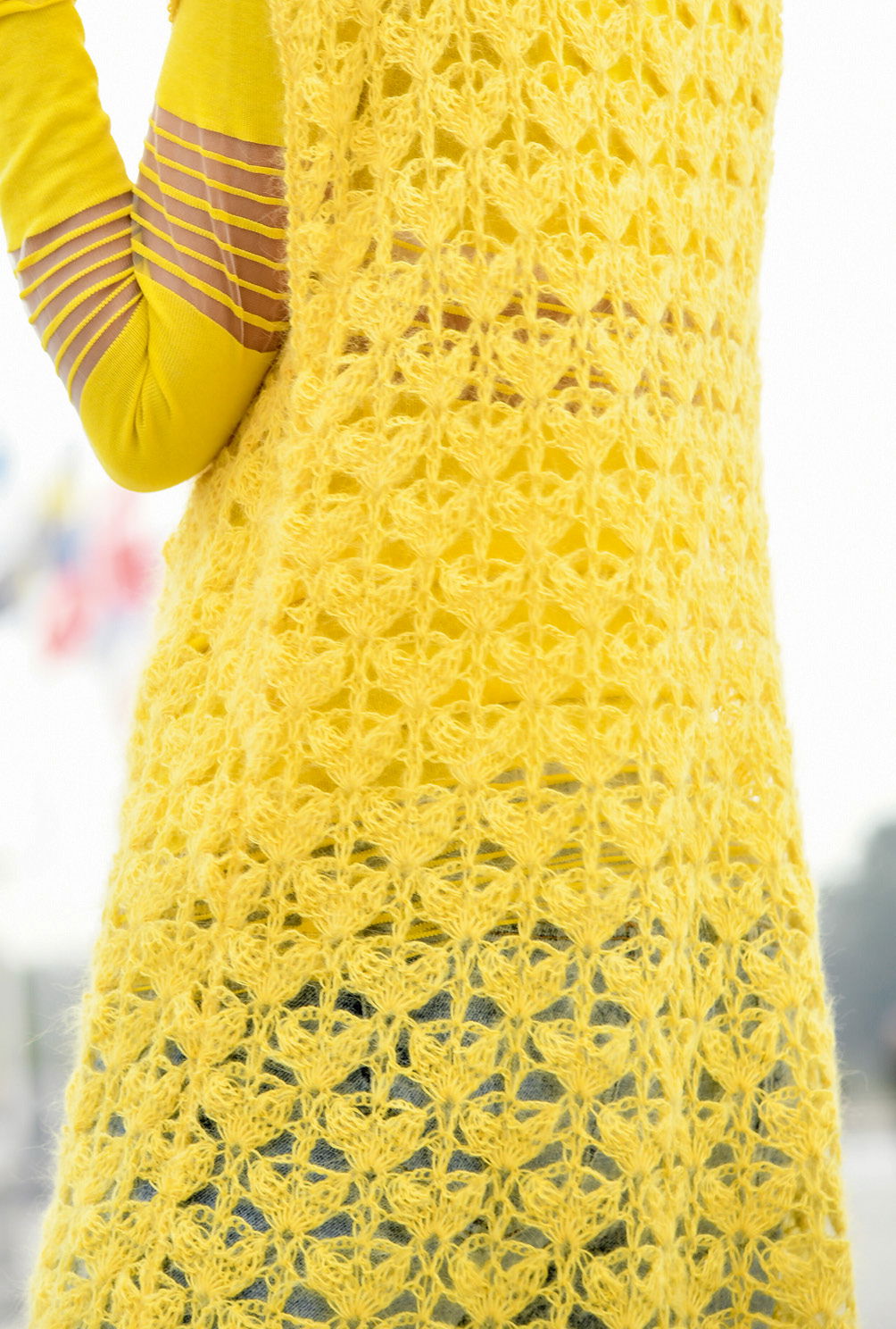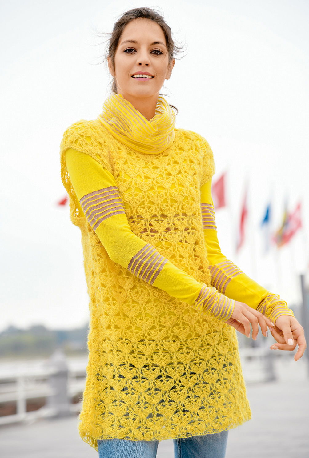 Welch großartiges Muster! Diese gerade, schlichte Tunika, mit rundem Ausschnitt trumpft mit Muster, Farbe und Garn. Das ausgefallene Muschelmuster bedarf nur 8 Reihen auf 10 Zentimeter. Es ist sehr luftig und daher eignet sich das Alpacagarn besonders gut. Dieses ist federleicht, hat einen leichten Flausch und temperaturausgleichende Eigenschaften. Nach dem Zusammennähen werden die Armausschnitte und der Halsausschnitt mit festen Maschen und Krebsmaschen umhäkelt. Sie sind wichtig für die Formgebung und sehen sehr edel aus. Da es bei diesem Kleidungstück entscheidend auf die Länge ankommt, sollte diese vor Beginn des Häkelns individuell bestimmt werden. Gehäkelt wird mit Nadel Nr 3,5. Das Alpaca-Garn ist von ggh. In der Anleitung wird die Tunika in den Größen 36, 38, 40, 42, 44 und 46 beschrieben.