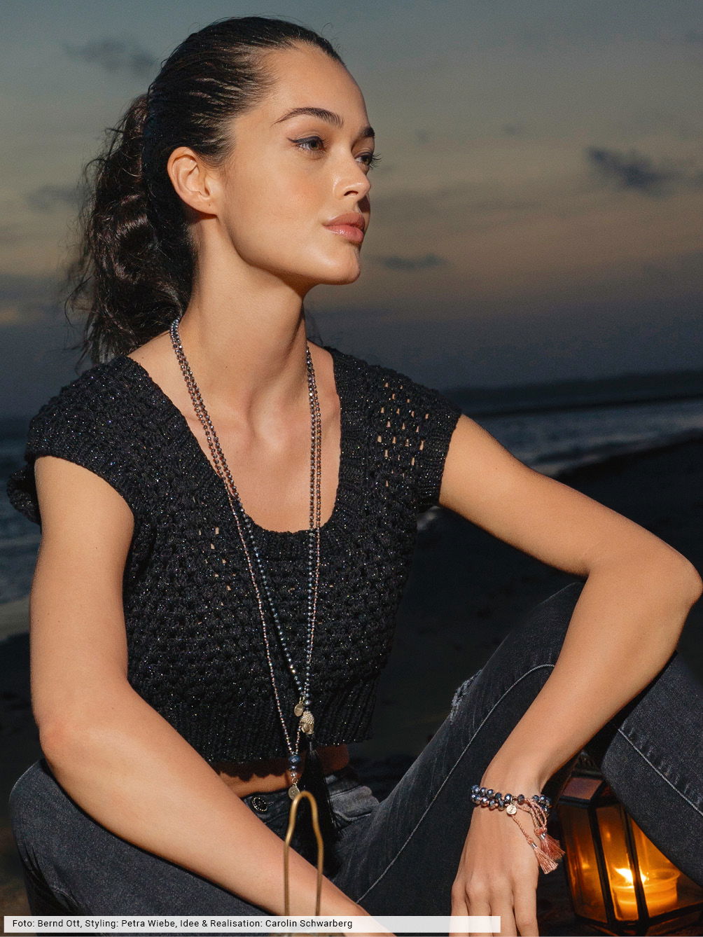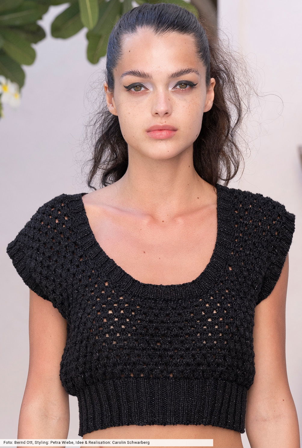 Let’s go to the beach. Natürlich in diesem aus Stäbchen gehäkelten Top, das mit seiner Schlichtheit und seinem silbern schimmerndem Garn einen modischen Mix aus Tragbarkeit und Sexappeal darstellt. Die elastischen Rippenbündchen werden zum Schluss angestrickt, bringen alles schön auf Taille und sorgen für die perfekte Passform an den Armausschnitten und an der tiefen Halskante.