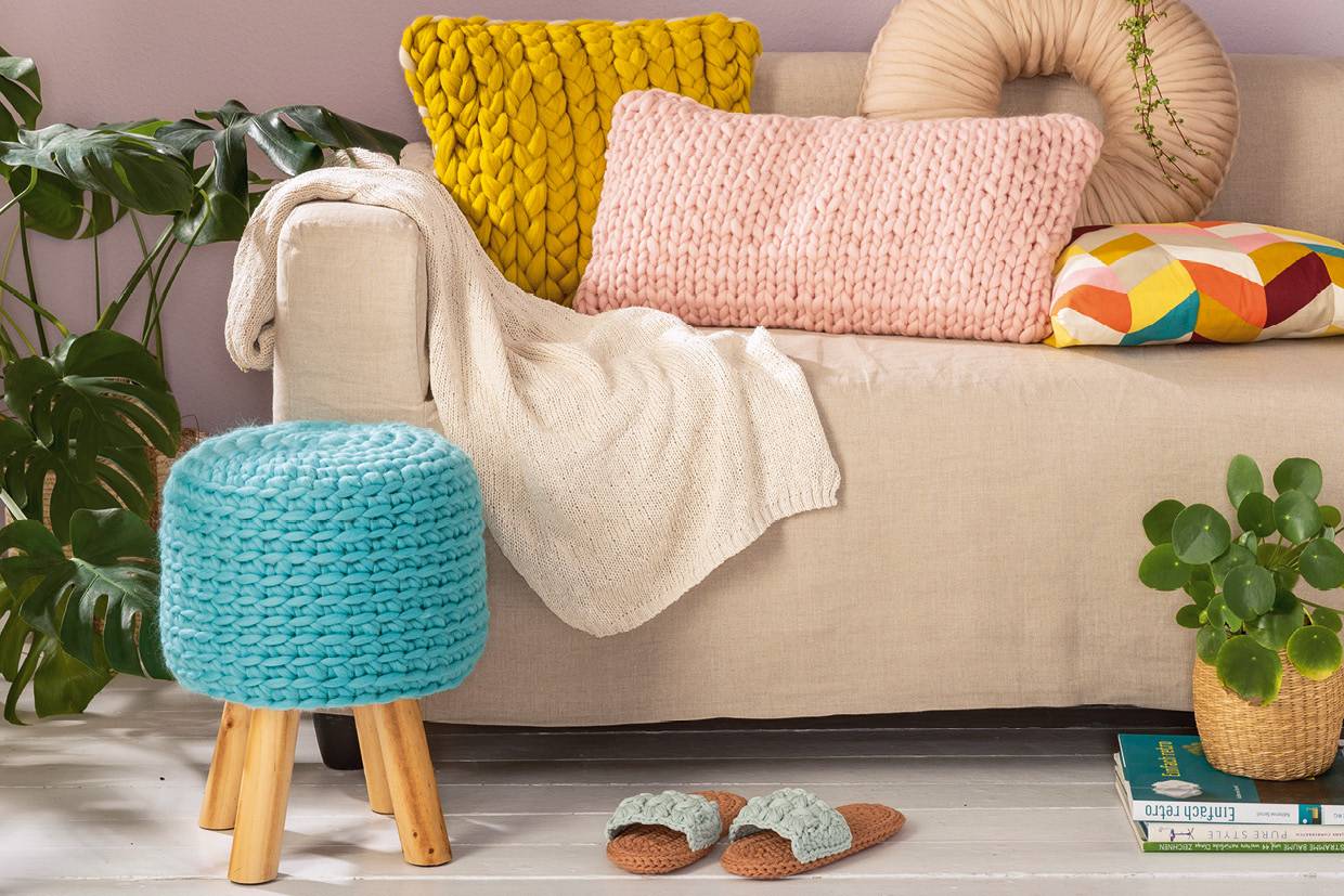 Kissen in Rosa: 60 x 35 cm; Kissen in Curry: 50 x 50 cm; Rundes Kissen: ca 45 cm Ø; Pantoffeln: 35 – 37 (38 – 40); Hockerbezug: ca 30 cm Ø