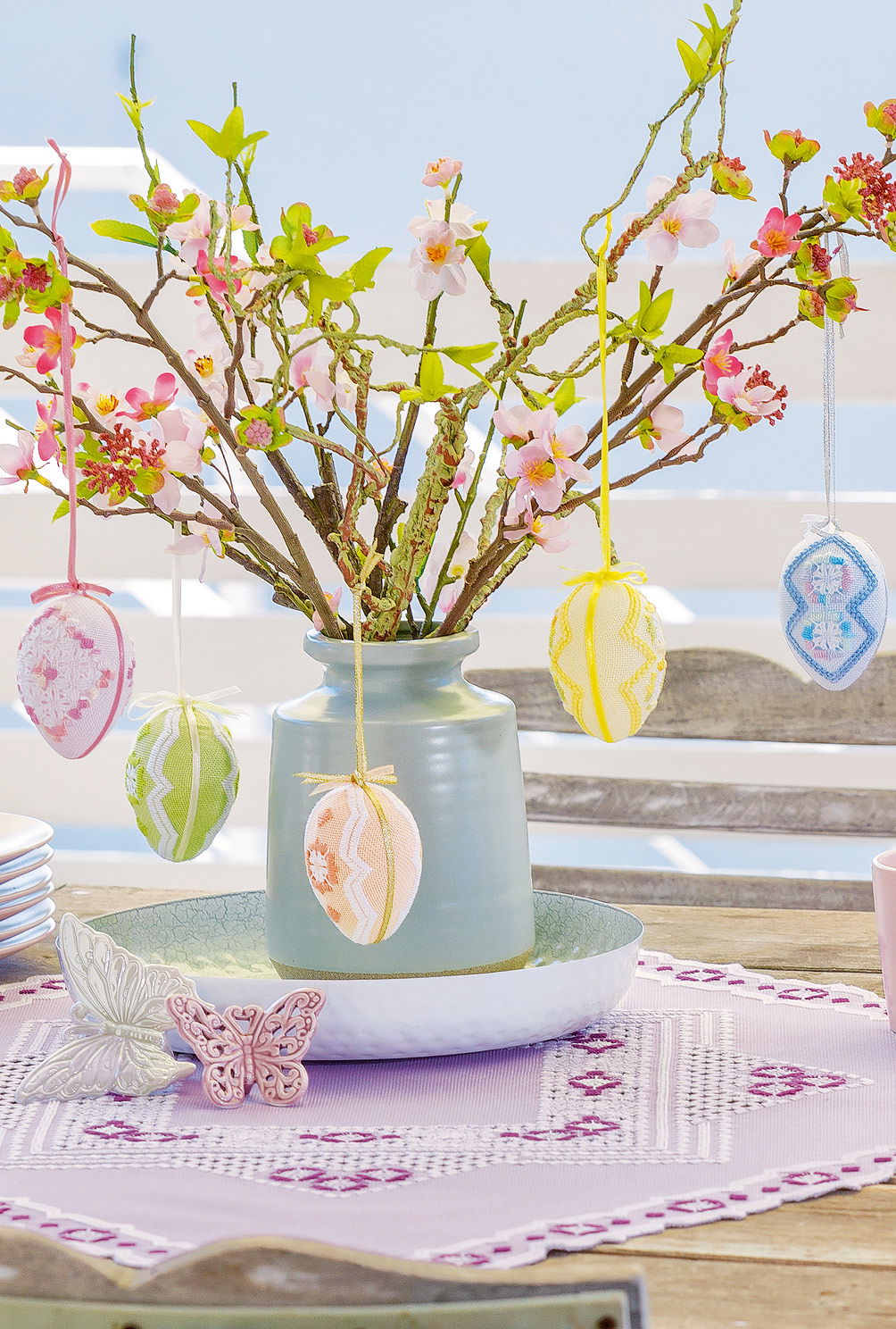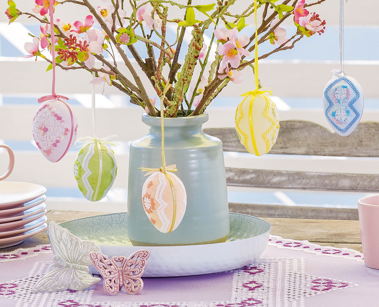 Eier: je ca 8 cm hoch (ohne Aufhängeschlaufe); Motive: ca 8 x 8 cm bis 7 x 10 cm