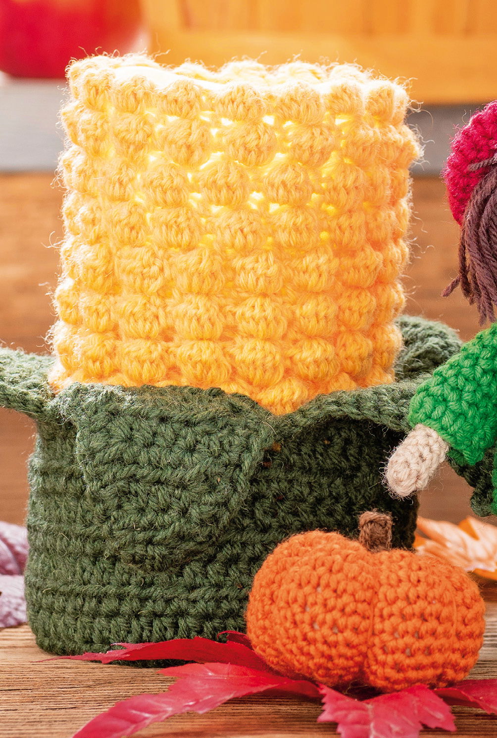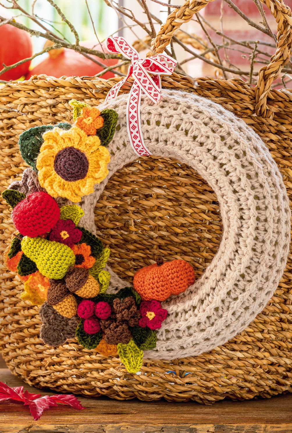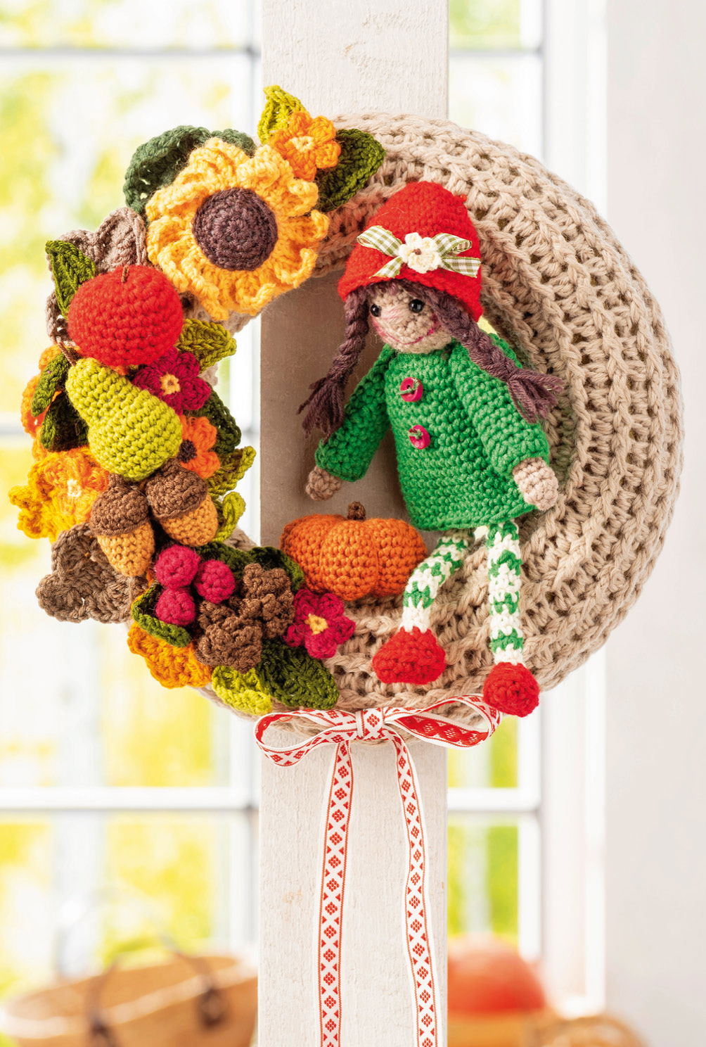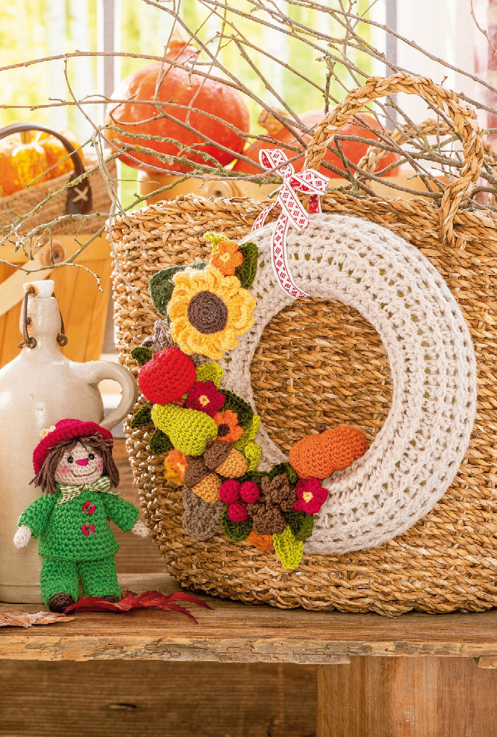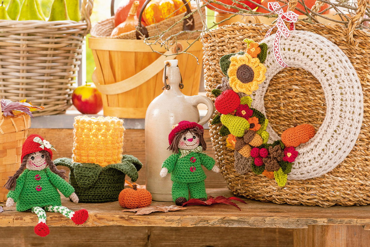 Kranz: ca 25 c m Ø, Wichtelmädchen: ca 7 cm hoch (sitzend), Vogelscheuche und Kerze: je ca 7,5 cm hoch