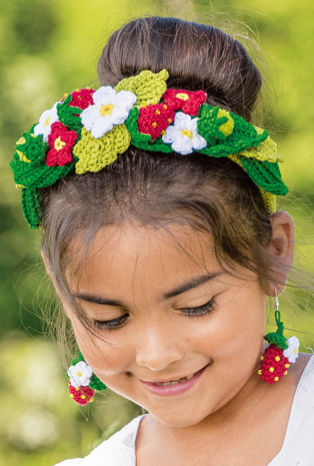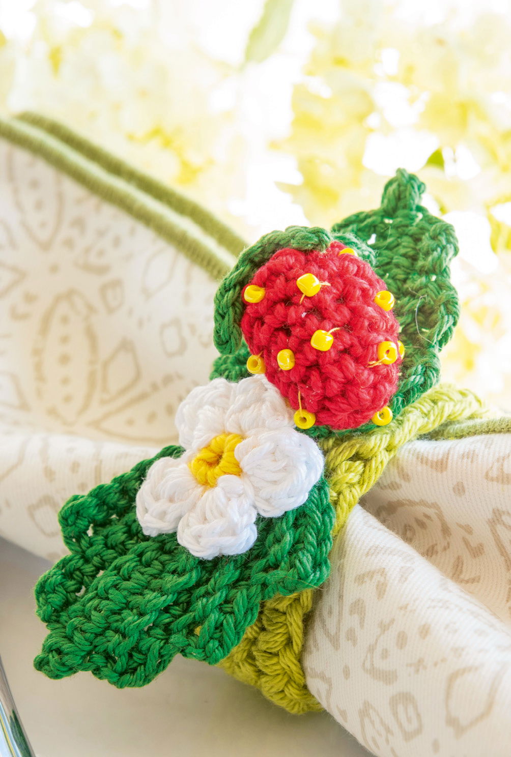 Eierwärmer: ca 4,5 cm hoch; Serviettenringe: ca 5,5 cm Ø; Windlichter: ca 5,5 cm Ø, 6,5 cm hoch; Kannenwärmer und Türkranz: ca 35 cm Ø; Tasche: ca 22 x 18 cm (ohne Henkel)