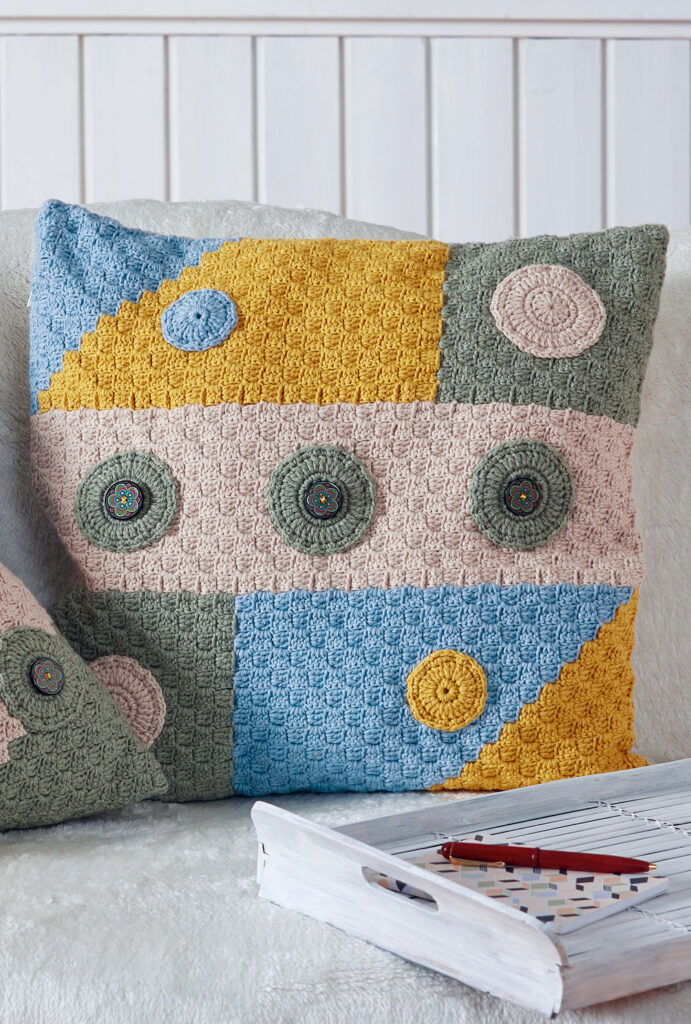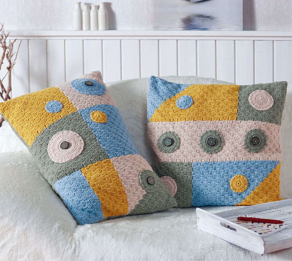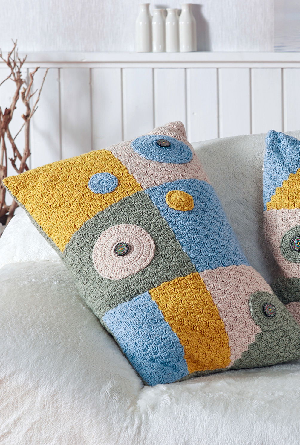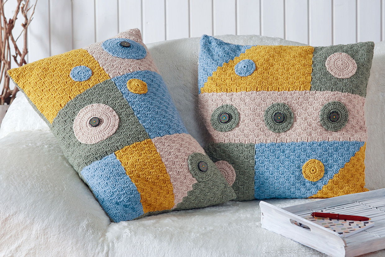 So schön kann Home-Deko sein! Die gehäkelten Kissen geizen nicht mit Besonderheiten. Das einfache Stäbchenmuster wird diagnal gearbeitet. Das heist, es wird in einer Ecke mit einem Motiv begonnen. Das Muster setzt sich dann diagonal fort, was bedeutet, dass die Reihen mit immer mehr Mascchen gearbeitet werden. Da durch diese Art die Größe vorgegeben ist, ist es unbegingt erforderlich, mit der in der Anleitung angegebenen Maschenprobe zu arbeiten. Für die Farbaufteilung gibt es für jedes Kissen ein Zählmuster. Aber natürlich kannst du die Farben auch nach deiner Fantasie aufteilen. Zum Schluss häkelst du noch Rosetten, die du dann mit den Knöpfen aufnähst. Du häkelst mit Nadel Nr 3,5 und Garn von Lana Grossa. Die fertigen Kissen haben eine Größe von 50 x 50 cm bzw 43 x 64,5 cm.