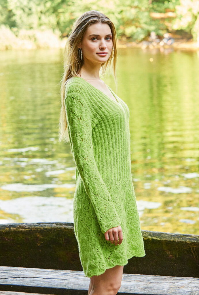 Ein Kleid in Minilänge aus einem leicht glänzenden leuchtendgrünen Mischgarn aus Alpaka, Schurwolle, Baumwolle und Polyamid lässt dich frühlingshaft strahlen. Dafür braucht es nur wenig Garn und es ist federleicht zu tragen. Der Rockteil und die Ärmel werden in einem luftigen Ajourrautenmuster gestrickt; durch das anschließende Rippenmuster im Rumpfbereich erhält das Modell eine taillierte Form, die sich dem Körper perfekt anpasst. Doppelte Randmaschen und betonte Abnahmen am V-Ausschnitt ergeben einen sauberen Abschluss am Ausschnittrand. Eine Anleitung kann für die Größen 36/38, 40/42 und 44/46 downgeloadet werden.