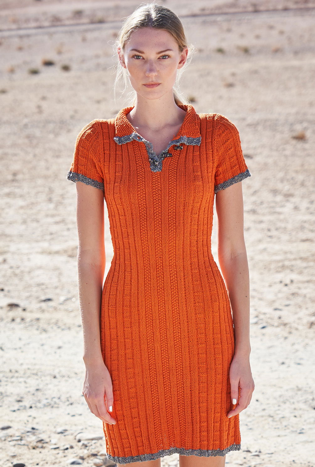 Das kurze Strickkleid lebt von Akzenten und einer gewissen Nonchalance. Dies zeigt sich durch das einfache Strukturmuster in Orange, das wir ganz mutig mit silbernen Lurexblenden eingefasst haben. Besonders schön sind die detaillverliebten Streifen, die im mittleren Bereich dezent, aber effektvoll durch das kleine Perlmuster der Figur folgen. Das wirkt sehr feminin, während der Polokragen den klassischen, sportlichen Akzent verleiht. Gestrickt wird erst das Rückenteil, dann das Vorderteil und zum Schluss die kleinen Ärmel. Nach dem Perlmuster-Bündchen werden die Maschen für die Musterstreifen eingeteilt. Die einzelnen Muster sind nicht schwierig, es empfiehlt sich lediglich für das Mittelmuster Maschenmarkierer zu verwenden. So hat man einen besseren Überblick darüber, wo man sich gerade im Muster befindet. Gerade am Anfang ist das sehr hilfreich. Sind alle viert Teile fertig gestrickt, werden die Nähte geschlossen und der Polokragen aus dem Halsausschnitt herausgestrickt. Tipp: Da kräftiges Orange nicht unbedingt jedem steht: Die Soft Cotton gibt es in über 20 wunderschönen klassischen und trendigen Farben.