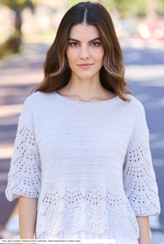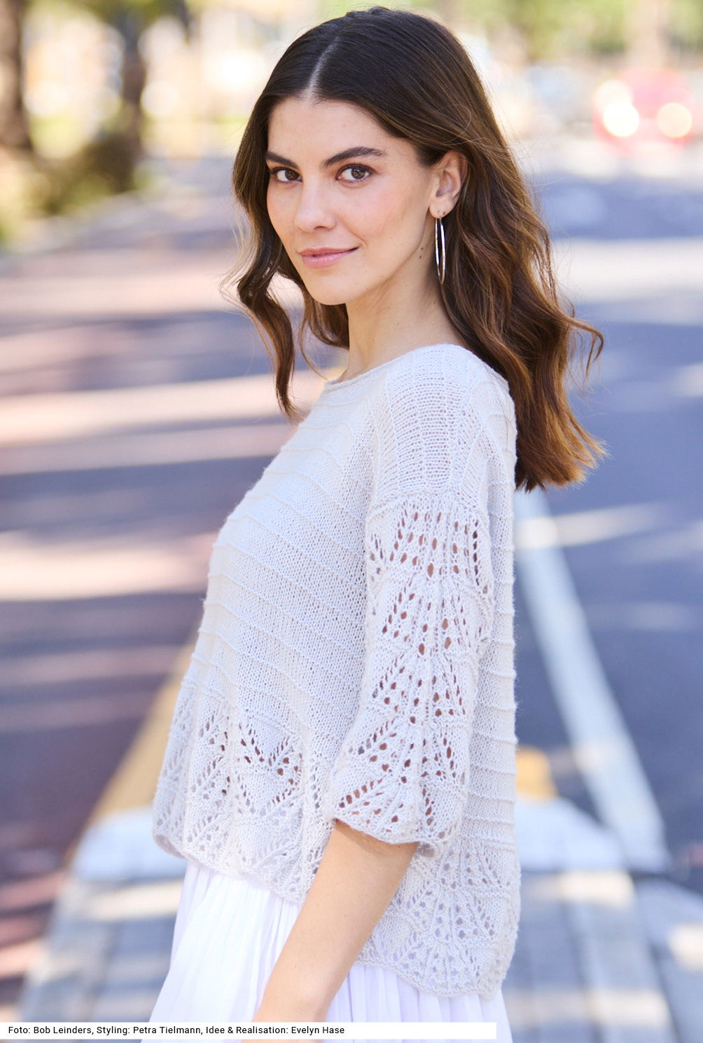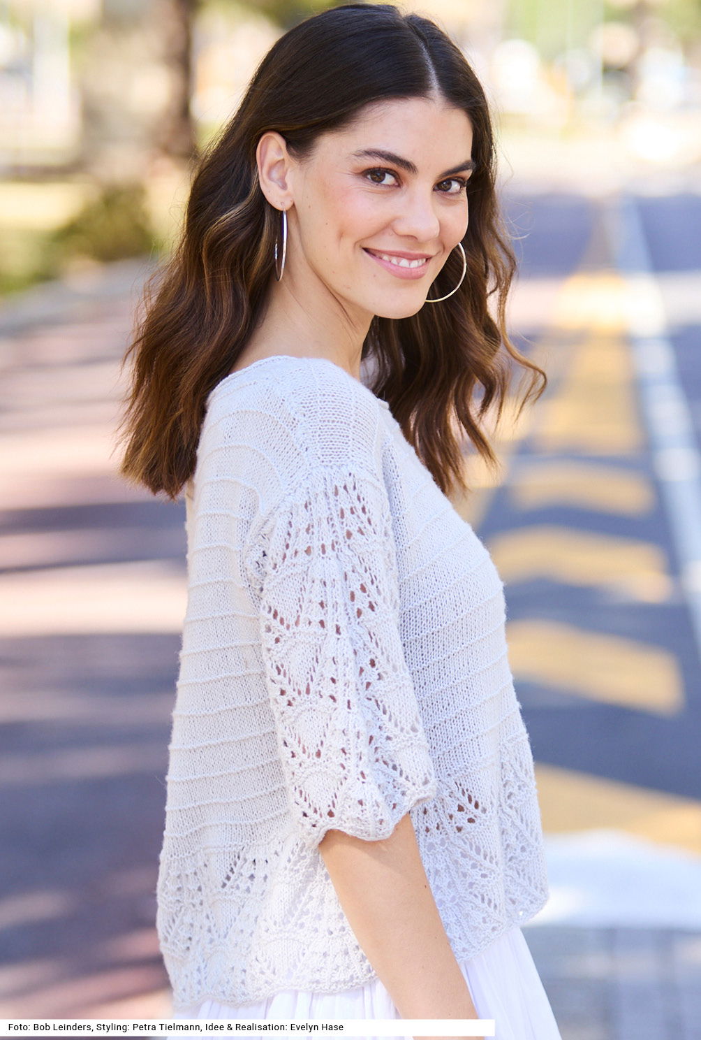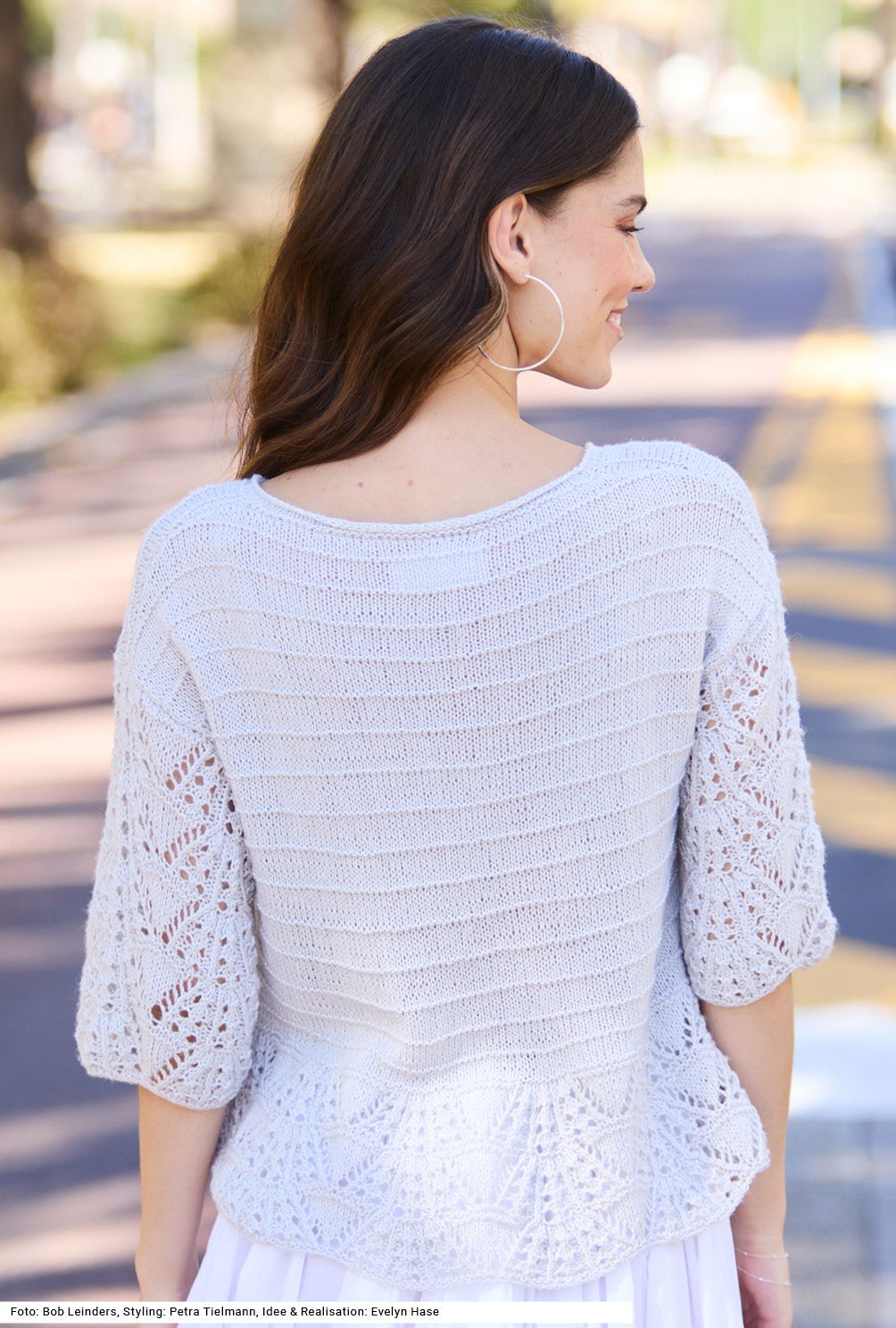 Dieser romantische Pullover mit dreiviertellangen Ärmeln liebt es verspielt. Mit Ajourmuster in Bereich der Ärmel sowie der langen Bordüre am Saumrand ist er luftig, feminin und dennoch lässig – eine charmant-schmeichelnde Kombination. Im oberen Bereich kommt ein schlichtes Muster aus glatt rechts mit Querrippen in kraus rechts zum Einsatz. Der runde Halsausschnitt hat einen Rollrand aus rechten Maschen. Das Modell wiegt nur 200 bzw. 250 g, da das Garn aus Baumwolle mit Merinowolle eine lange Lauflänge hat. Die Anleitung dazu gibt es für die Größen 36/38, 40/42 und 44/46.