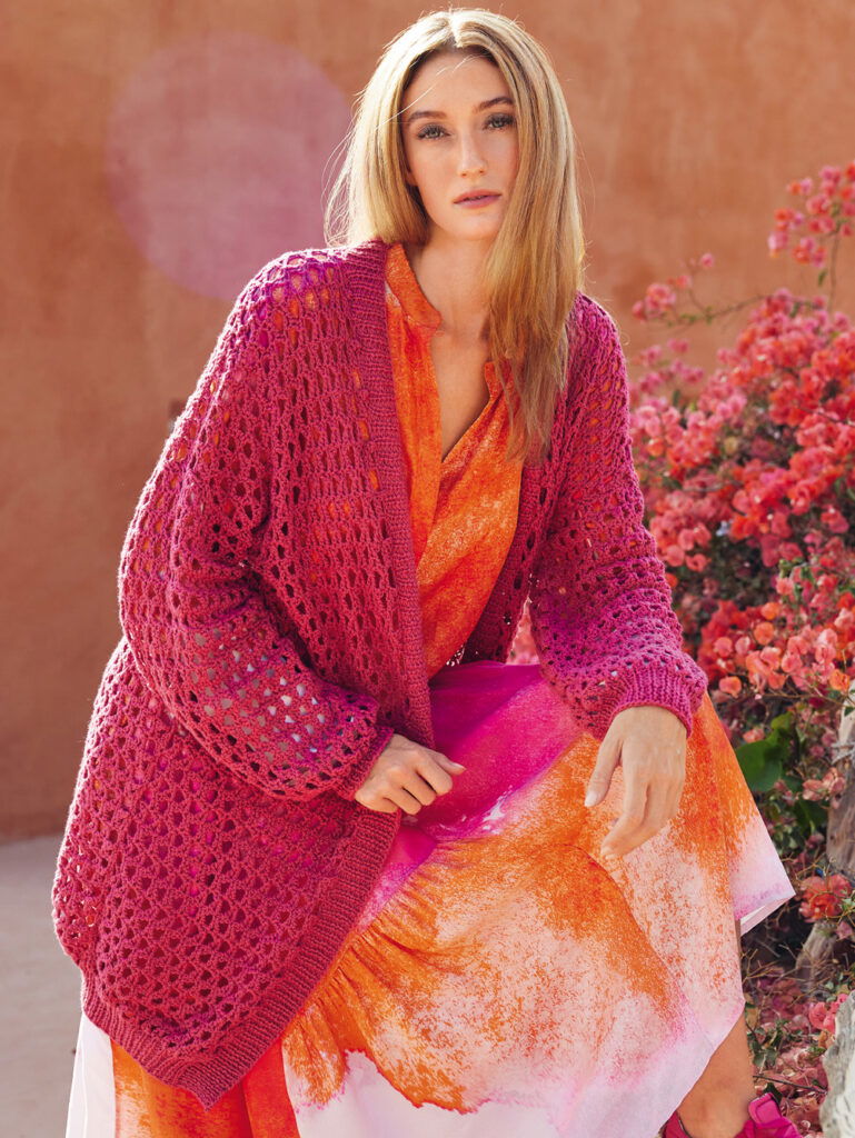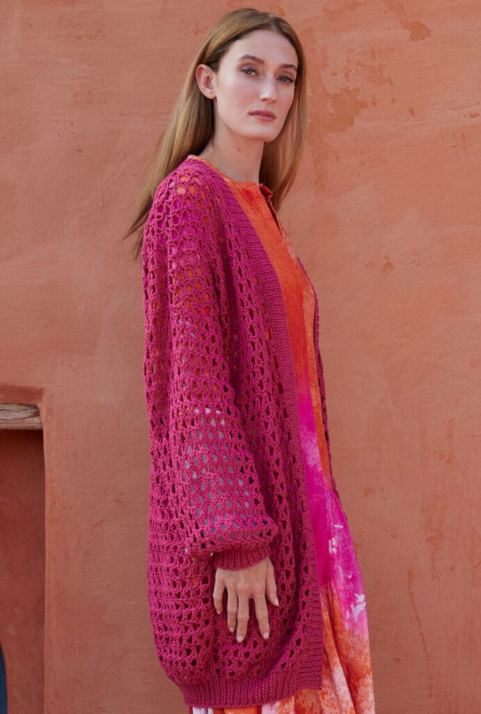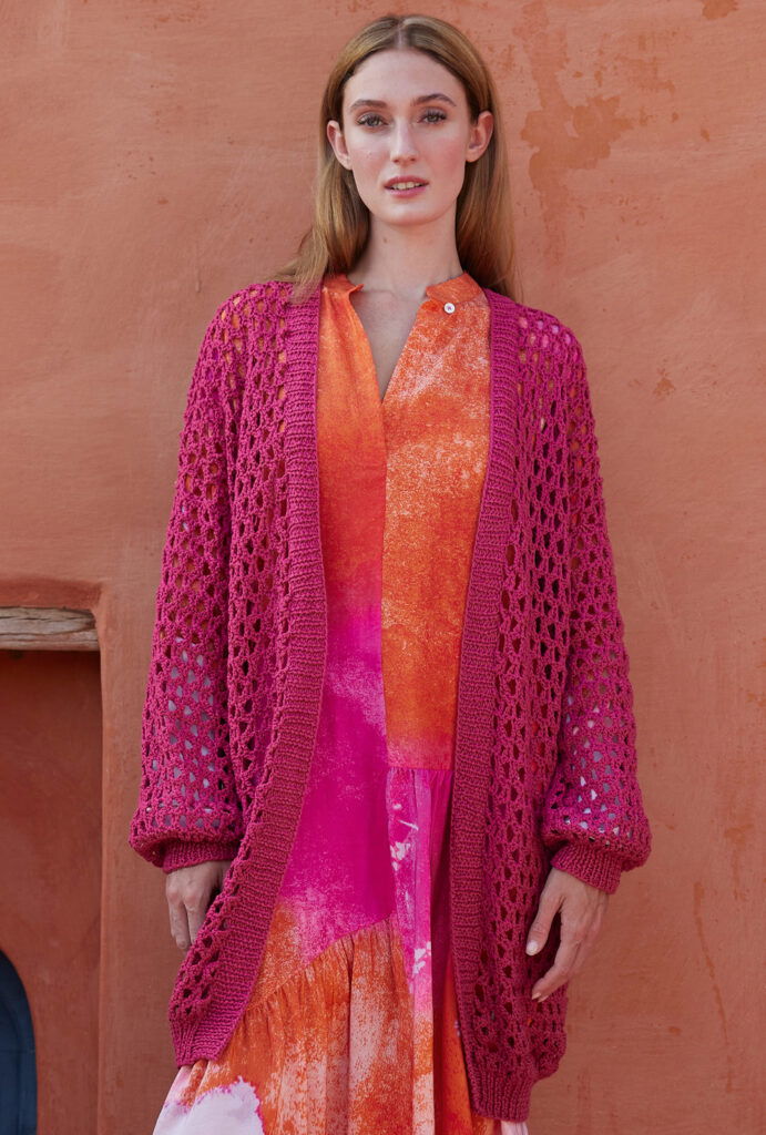 Der lockere Schnitt und das leicht angeraute Baumwollgarn geben dieser verschlusslosen Longjacke das nötige Volumen, um die Konturen weich zu umschmeicheln. Man sieht es erst auf den zweiten Blick: Das transparente Netzmuster wird aus Doppel- und Kreuzstäbchen gehäkelt. Das ist nicht allzu schwer und die Arbeit geht mit der übersichtlichen Häkelschrift flott von der Nadel. Zum Schluss werden die Rippenbündchen und -blenden angestrickt und verleihen dem Teil den stabilisierenden Halt. In leuchtendem Zyklam ein wunderbarer Begleiter für Frühling und Sommer.
