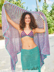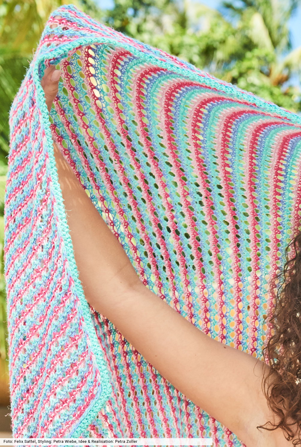 Wenn am Strand eine frische Brise aufkommt oder es abends etwas kühler wird, leistet diese Strickdecke mit gestreiften Lochstrukturen immer gute Dienste. Sie wird mit gehäkelten Krebsmaschen eingerahmt und ist so groß, dass sie als Liegetuch zum Einsatz kommt oder dass man sich von Kopf bis Fuß darin einhüllen kann. Aus Viskose- und Ananasfasern ein toller Begleiter für Wind und Wellen.