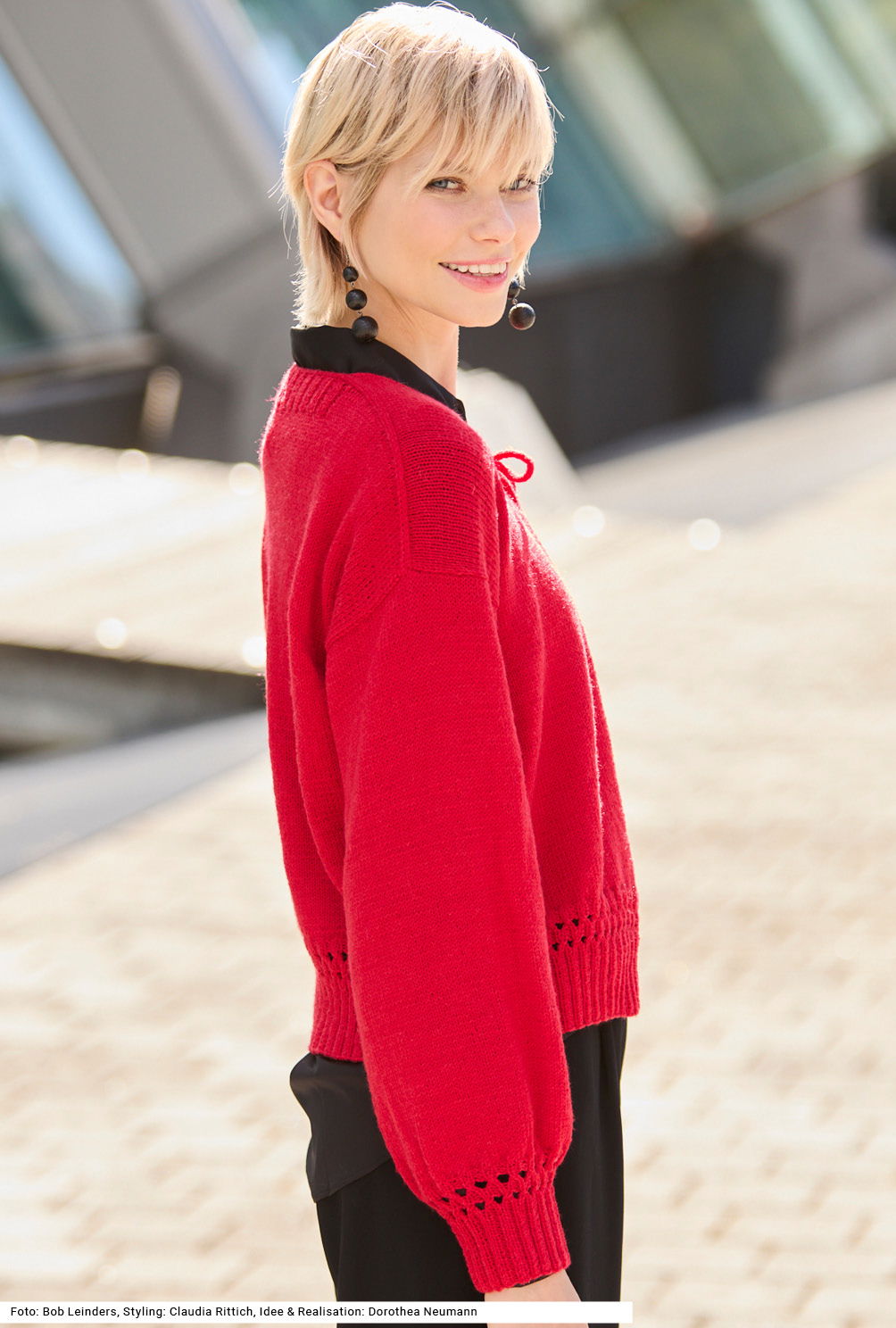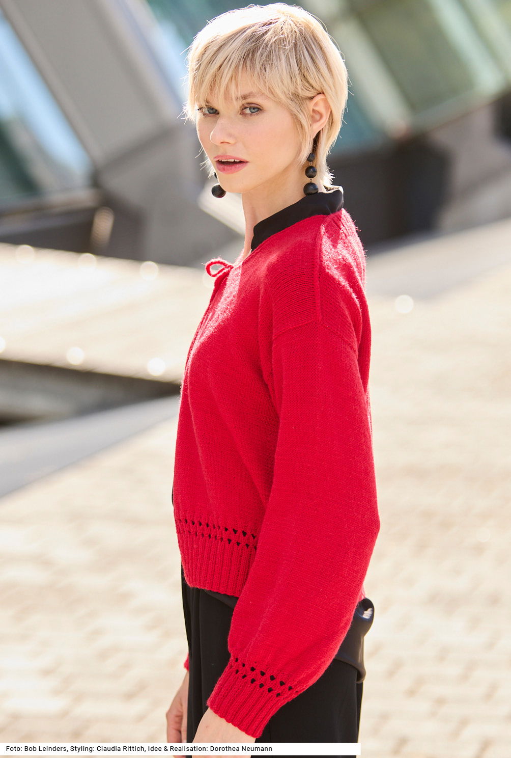 Diese sehr clean wirkende, feminine Jacke fällt dank der überschnittenen Schultern locker, ohne dabei an Eleganz zu verlieren. Das feine Lochmuster über dem Bund – auch der Bund der Ärmel – sorgt für eine filigrane Optik; wobei die Bündchen im Rippenmuster gestrickt sind. Besonderes Detail: der I-Cord-Rand am Halsausschnitt, der beidseitig als Bindebänder fortgesetzt wird. Die lässige Passform kommt von den ganz gerade geschnittenen einzelnen Teilen. Eine Anleitung für ein Garn aus Wolle, Polyamid und Kaschmir gibt es für die Größen 36/38, 40/42 und 44/46.