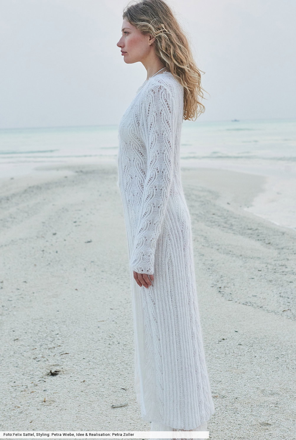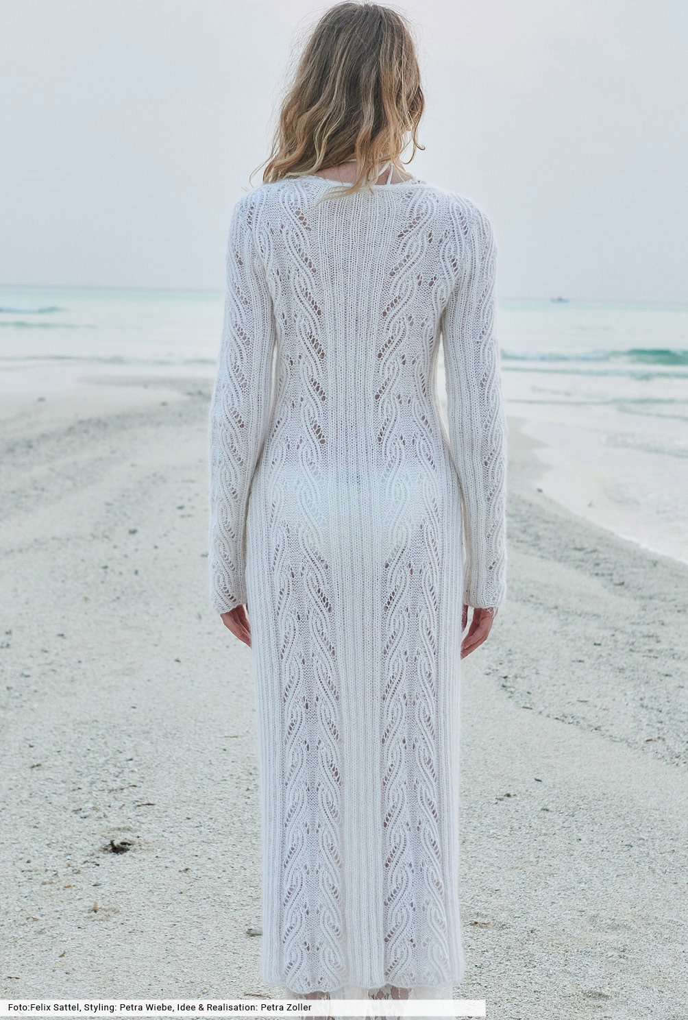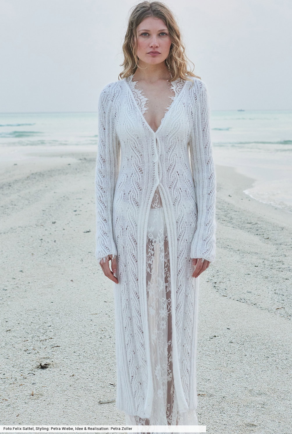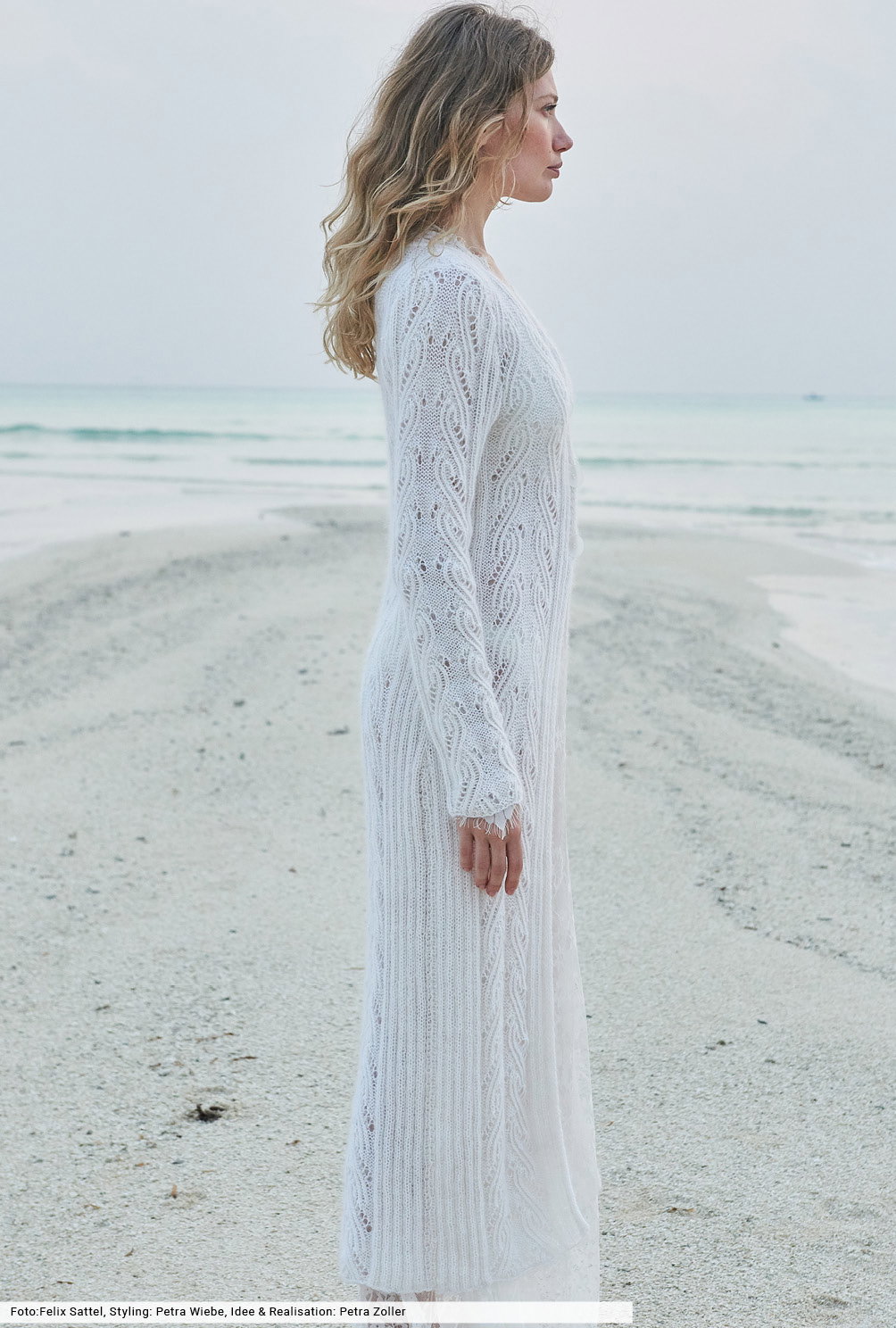 Minimal in der Farbe, maximal in der Wirkung: Mit diesem knöchellangen, schmal geschnittenen Mantel stehst du auf jeder Beachparty im Mittelpunkt. Er besteht aus einem feinen Baumwoll-Viskosegarn, dem wir zusätzlich einen flauschen Mohairfaden hinzugefügt und zusammen verstrickt haben. So kommen die Ajourstreifen und Rippenstrukturen noch deutlicher zur Geltung und du bist an kühlen Sommerabenden von Kopf bis Fuß weich umhüllt.