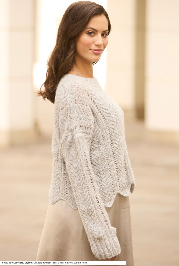 Der leichte, kurz geschnittene Pullover aus einem federleichten Flauschgarn aus Polyamid, Alpaka und Wolle lebt von seinem luftigen Strukturlochmuster, das ganz automatisch eine zackige Saumlinie ergibt. Die Ärmel beginnen ganz gerade und erhalten erst im oberen Bereich ihre endgültige Weite; sie haben ein Bündchen im Rippenmuster, wie auch die Halsausschnittblende. Ein Modell, das durch sein Spiel aus Transparenz und Struktur raffiniert Akzente setzt. Der gerade Schnitt mit gerippten Bündchen macht ihn vielseitig kombinierbar: ob lässig zur Jeans oder elegant zu fließenden Stoffen. Eine Anleitung gibts für die Größen 36/38 und 46/48.