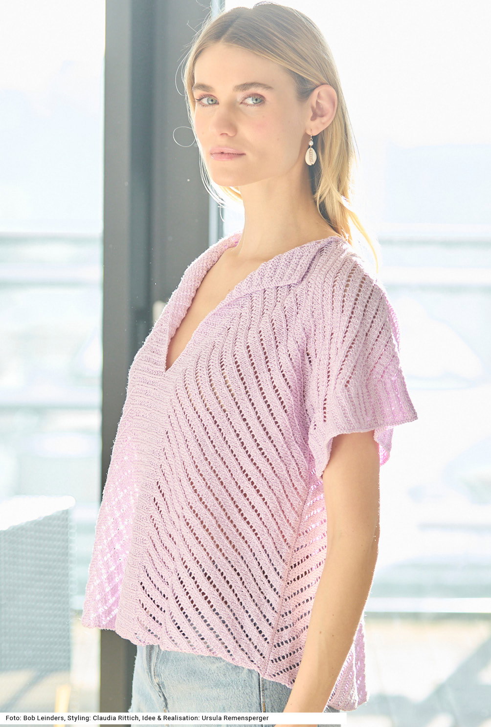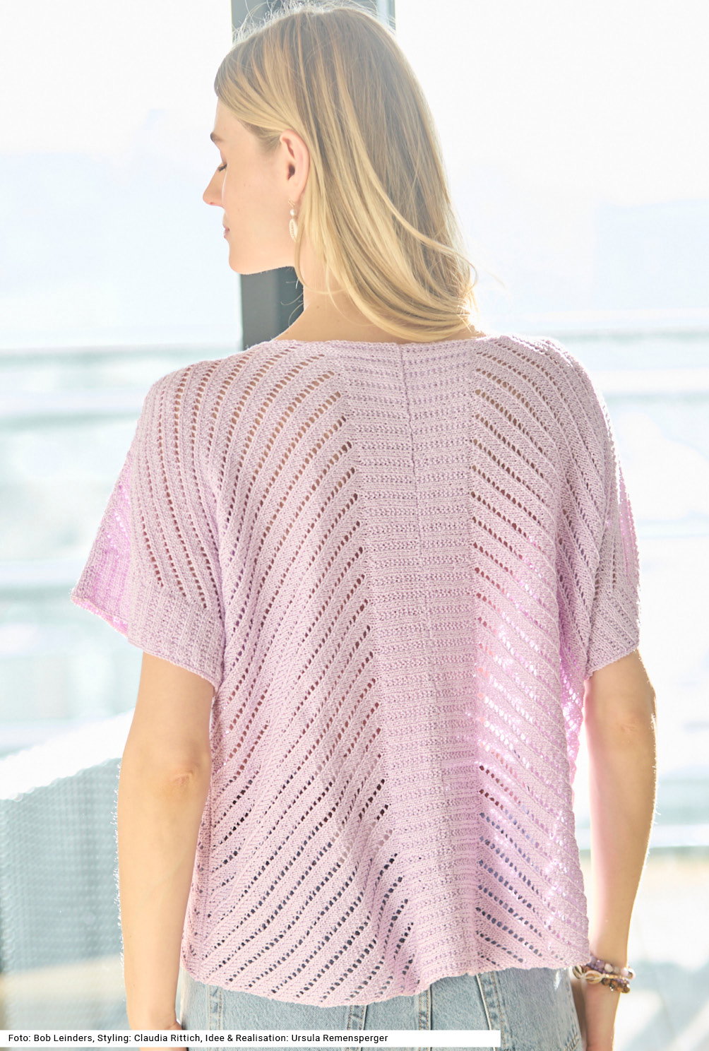 Dieses weit geschnittene Shirt mit (gefaktem) V-Ausschnitt und mittigem Schlitz überzeugt durch seine besondere Strickrichtung: Quer von der Mitte aus gearbeitet, entsteht ein spannendes Spiel aus Struktur und diagonalen Linien. Breite Blenden in einem abgewandelten Rippenmuster umrahmen das Design und geben ihm klare Konturen, während das Lochmuster für Luftigkeit sorgt. Die Rippenpartien in der vorderen Mitte werden einfach entlang des Halsausschnitts umgeschlagen. Die kurzen Ärmel enden ebenfalls mit Rippenmuster. Eine Anleitung für ein Baumwolle-Viskose-Garn gibts für die Größen 36 – 40 und 42 – 46 sowie 48 – 52.