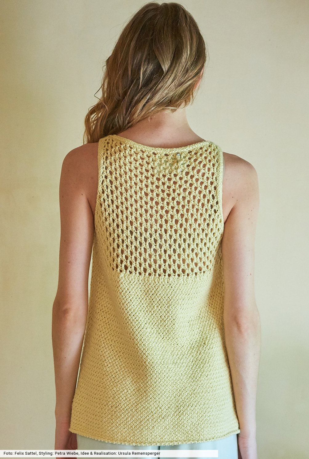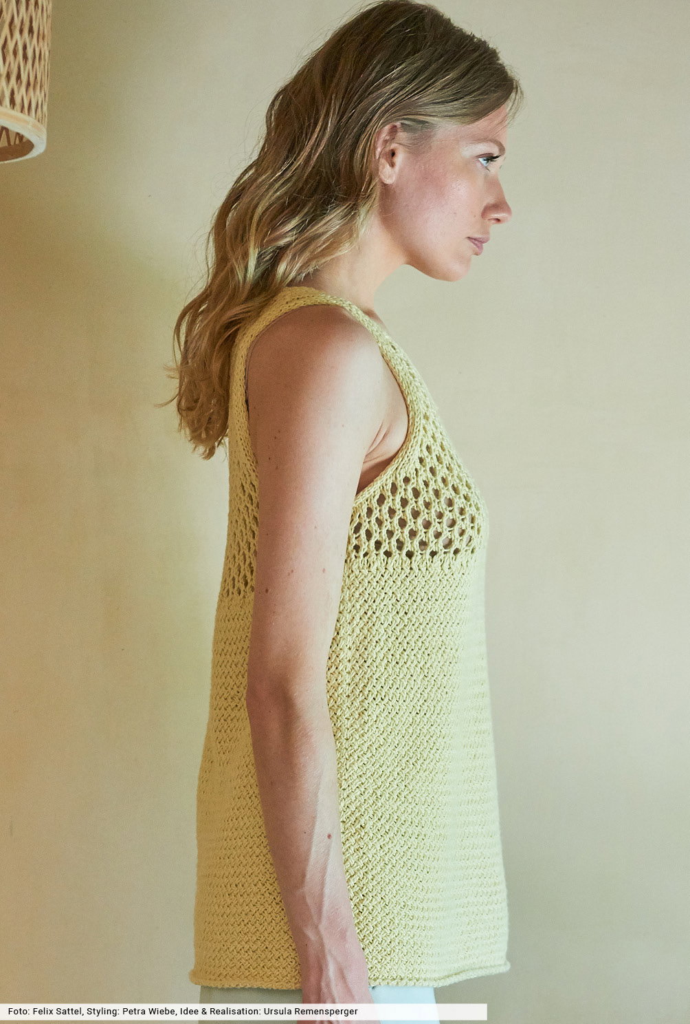 Material: BUTTINETTE "Adeva" (77% Baumwolle, 23% Seide, LL = 120 m/50 g) 300 (350) 350 g Vanille (Art 99.106.565). Je 1 Paar Stricknadel Nr 4 und 4,5 sowie 1 Rundstricknadel Nr 4.