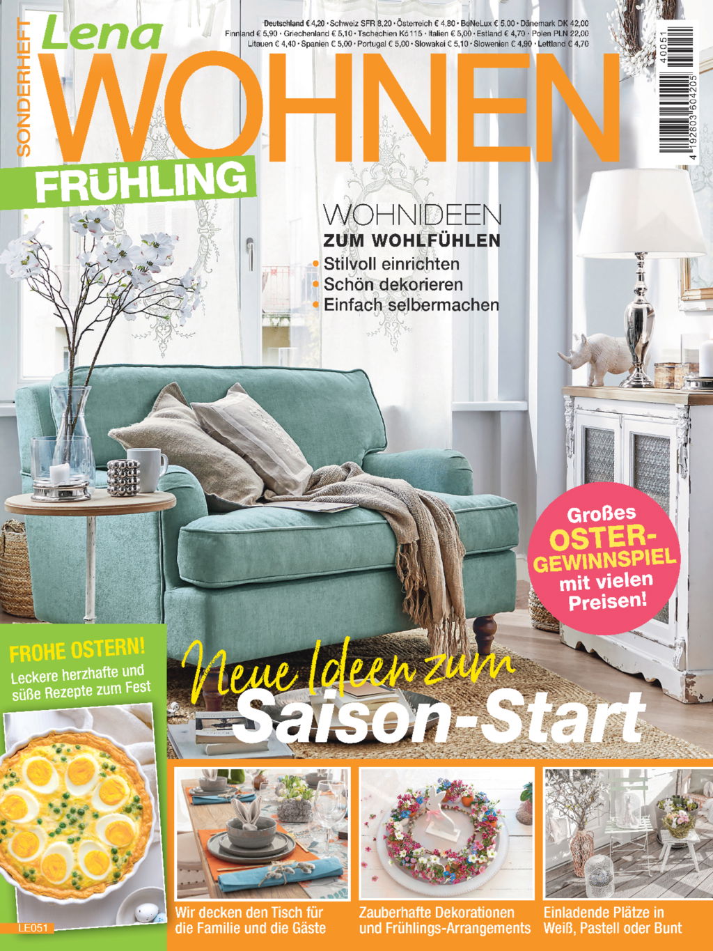 Willkommen in dieser Ausgabe von Lena Wohnen Sonderheft. Hier wird es frühlingsfrisch und österlich. Diesmal zeigt dir unsere Kreative Christine Eller ihr Zuhause, passend zur Jahreszeit dekoriert. Wir helfen dir, Ordnung zu schaffen. Mit cleveren Tipps und dekorativen Helfern. Gemütlich wird es im Schlafzimmer. Dezente Farbtöne mit viel Holz, Textilien aus nachhaltigen Materialien und blendfreie Lampen schaffen ein ganz besonderes Ambiente. Wir zeigen dir hier vier Einrichtungsstile. Finde heraus, welcher am besten zu dir passt. Fürs Kinderzimmer haben wir ein paar ganz ausgefallene Ideen für dich dabei. Frühlingsstimmung kommt jetzt auch auf den Tisch. Raffiniert, trendig und auch niedlich kommen die Dekorationen daher. Hier hilft dir auch unser Shopping-Magazin weiter. Leckeres muss natürlich auch auf den Tisch. Hier findest du herzhafte Rezepte, aber auch Süßes und tolle Ideen zum Vernaschen und Verschenken. Lass dich von unseren DIY-Ideen inspirieren. Hier findest du einfache Inspirationen zum Nachmachen, wie zum Beispiel die beflügelten Ideen mit Schmetterlingen. Mit dabei ist auch wieder unser großes Gewinnspiel. Wir verlosen 25 Gewinne im Wert von über 3700,- Euro. Schau einfach rein und lass dich inspirieren!