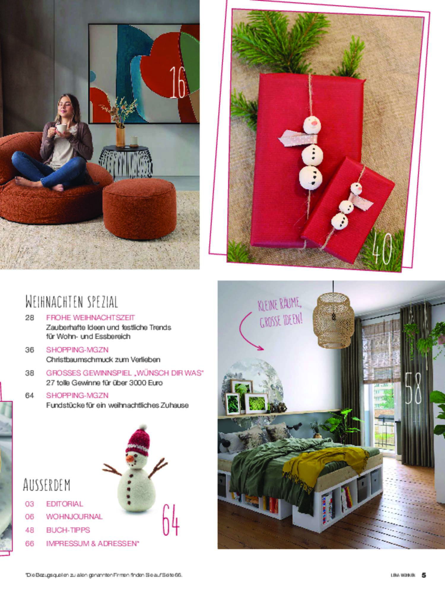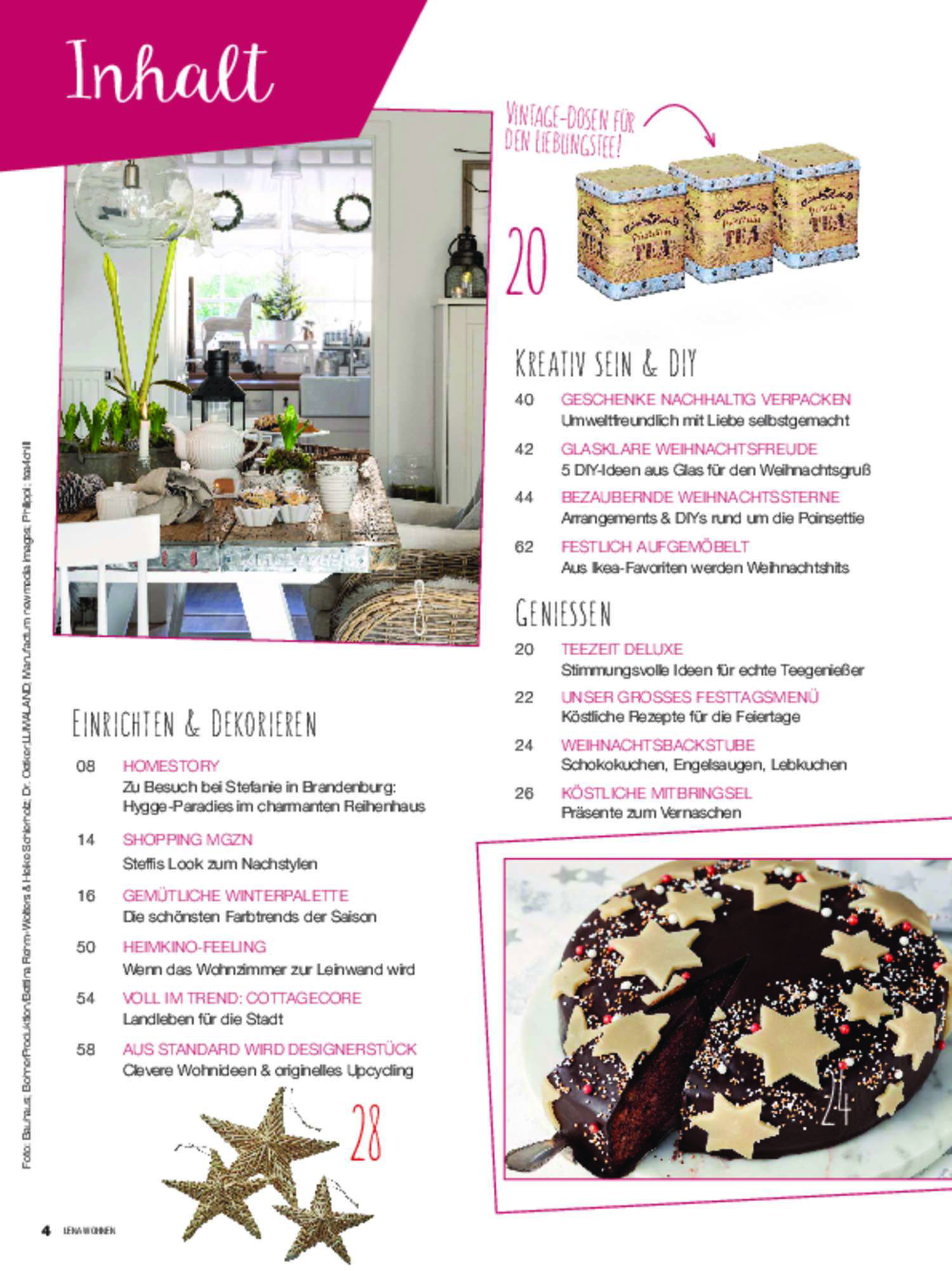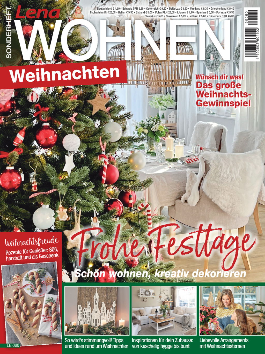 Die kühleren Tage rücken näher und mit ihnen der Wunsch nach einem Zuhause, das nicht nur warm ist, sondern echte Wohlfühlmomente schafft. Die Vorweihnachtszeit ist die perfekte Gelegenheit, um den Alltag ein wenig auszubremsen und die eigenen vier Wände in eine gemütliche, festliche Oase zu verwandeln. Freue dich auf neue Farbtrends, überraschend, wohnlich und voller Stil. Kulinarisch geht es weiter mit Teestunden, leckeren Rezepten und allem, was nach Weihnachten schmeckt. Unser großes Weihnachts-Special bringt Deko, Licht und Atmosphäre auf den Punkt, mit natürlichen Looks, modernem Stil und cleveren Ideen für den Tannenbaum. Wer Lust auf DIY hat, findet zahlreiche Inspirationen von nachhaltigen Geschenkverpackungen über Last-Minute-Mitbringsel aus Glas bis hin zu kreativen, festlichen Arrangements. Interior-Bloggerin Stefanie öffnet uns die Türen zu ihrem hyggeligen Zuhause. Und es wird filmreif, mit allem, was man fürs Heimkino braucht, Technik, Snacks und Kuschelfaktor. Und wer den Cottagecore-Trend liebt, entdeckt ländliche Gemütlichkeit im neuen Gewand. Ikea-Hacks und Wohnlösungen für mehr Style, Individualität und Ordnung warten auch auf dich. Freue dich auf unser Gewinnspiel, es heißt wieder – wünsch dir was – mit tollen Preisen. Lass dich von den inspirieren von den Ideen in dieser Ausgabe von Lena Wohnen Sonderheft!