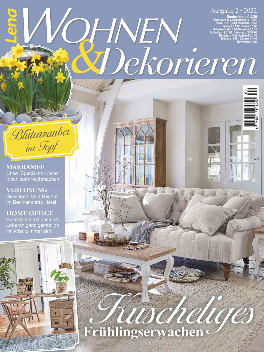 Mit dem kommenden Frühling starten wir ganz sanft in das neue Jahr und richten alles ganz in Weiß ein. Die fröhliche Narzisse dagegen bringt uns die ersten Farbtupfer auf Balkon und Terrasse. Weil immer noch so vielen von Zuhause arbeiten, haben wir uns in dieser Ausgabe von Lena Wohnen & Dekorieren noch einmal dem Thema Homeoffice angenommen. Unsere Expertin Susanne Töpfer von Loberon zeigt dir, wie dein Arbeitsplatz so richtig gemütlich wird. Die neuen Ordnungsideen bringen den richtigen Schwung in den Frühlingsputz. In unserem Special dreht sich alles um Makramee. Bist du diesem Trend noch nicht verfallen, könnte dies mit den vielen schönen Ideen jetzt passieren. Außerdem warten auf dich wieder viele wunderschöne Deko-Ideen, tolle DIY-Tipps und leckere Rezepte. Diesmal ganz vegan, vorgestellt von Katharina Küllmer. Nimm an unserem Gewinnspiel teil und reise in unsere Hauptstadt Berlin. Lass dich inspirieren und faszinieren!