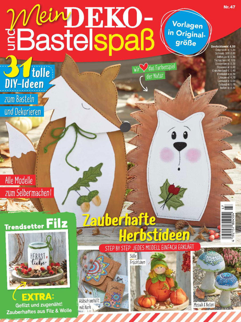 Ein Hauch von Herbst liegt in der Luft – kannst du ihn auch schon spüren? Wir freuen uns riesig auf diese ganz besondere Jahreszeit voller Energie und Farbe, die beste Inspiration für uns kreative Menschen. In dieser neuen Ausgabe von Mein Deko- und Bastelspaß Nr. 47 gibt es zauberhafte Überraschungen mit Filz und Märchenwolle, es gibt klassische Herbstmotive wie Kürbis, Rabe, Pilze und Igel, wir basteln mit Farbe, Holz, Textilien und Beton. Auch die kleinen, hübschen Mosaiksteinchen sind wieder mit dabei – dieses Mal werden daraus moderne Pilze, die drinnen und draußen einfach gut aussehen. Einen klassischen Herbstblütenkranz haben wir ganz modern als herbstlichen Traumfänger interpretiert. Natürlich am liebsten mit echten Materialien direkt aus der Natur. Wer das Basteln liebt, wird sich mit diesem Heft den Herbst kreativ versüßen.