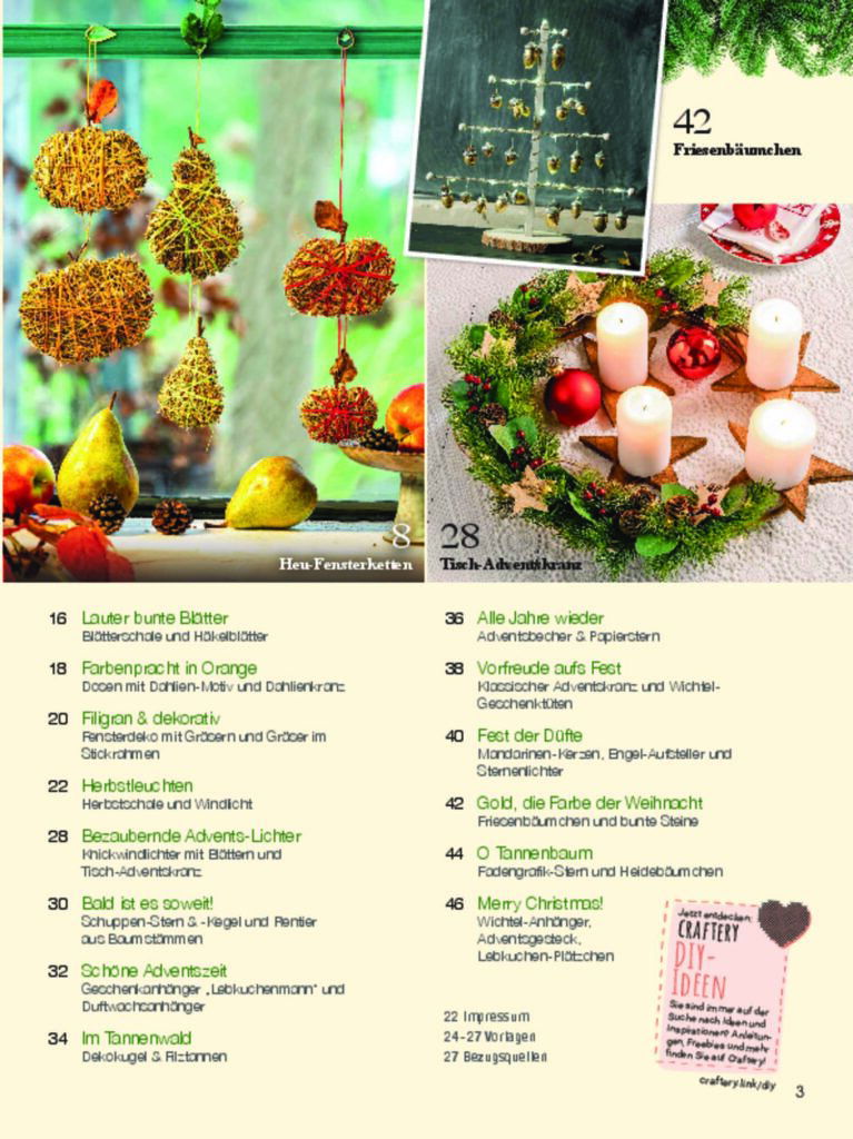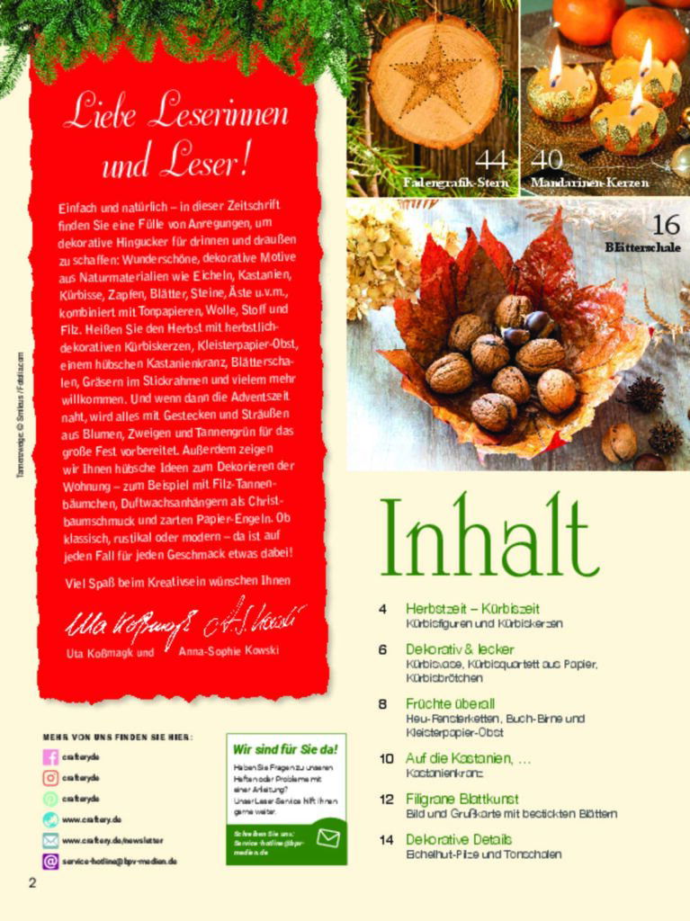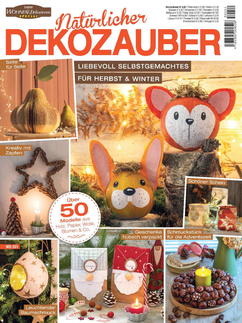 Einfach und natürlich ist das Motto dieser Ausgabe von Lena Wohnen & Dekorieren Special. Hier findest du eine Fülle von Anregungen, um dekorative Hingucker für drinnen und draußen zu schaffen. Wunderschöne, dekorative Motive aus Naturmaterialien wie Eicheln, Kastanien, Kürbisse, Zapfen, Blätter, Steine, Äste u.v.m., kombiniert mit Tonpapieren, Wolle, Stoff und Filz. Heiße den Herbst willkommen mit Kürbiskerzen, Kleisterpapier-Obst, einem hübschen Kastanienkranz, Blätterschalen, Gräsern im Stickrahmen und vielem mehr willkommen. Und wenn dann die Adventszeit naht, wird alles mit Gestecken und Sträußen aus Blumen, Zweigen und Tannengrün für das große Fest vorbereitet. Außerdem zeigen wir dir hübsche Ideen zum Dekorieren der Wohnung, zum Beispiel mit Filz-Tannenbäumchen, Duftwachsanhängern als Christbaumschmuck und zarten Papier-Engeln. Ob klassisch, rustikal oder modern, da ist auf jeden Fall für jeden Geschmack etwas dabei.