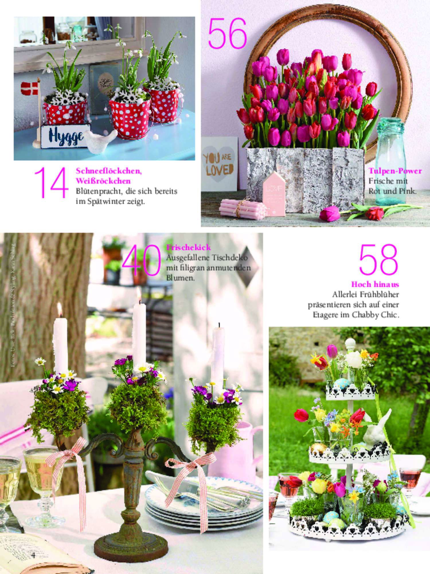 Gartenzwerge waren ganz fleißig, um die wunderhübschen Blumen großzuziehen, aus denen dann die schönen Sträuße, Gestecke und Kränze in dieser Zeitschrift werden. Mit Ranunkeln, Tulpen, Primeln, Narzissen und Bellis holen wir uns die Frühlingsfrische ins Haus. Die Arbeitsschritte werden einzeln mit Bildern erklärt. Dazu kommen noch Pflanzenportraits. Fertig ist ein Deko- und Lesespaß.
