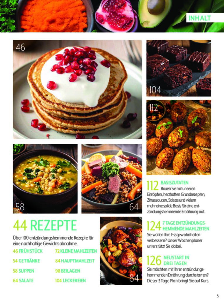 Natürlich steht die Ernährung hierbei besonders im Fokus. Mehr als 100 alltagstaugliche Rezepte mit entzündungshemmender Wirkung helfen dabei, mit Spaß zum Wohlfühlgewicht und insgesamt einem Mehr an Gesundheit zu kommen.
