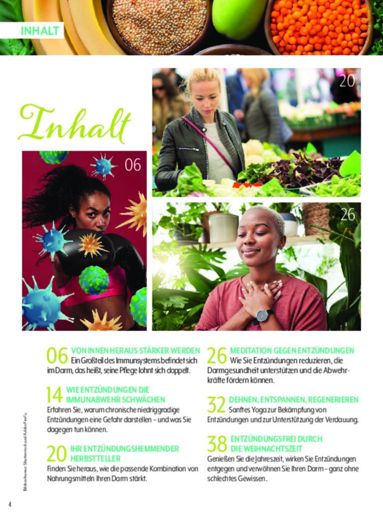 Wenn die Tage kürzer werden und die Luft kühler wird, stehen unsere Körper vor neuen Herausforderungen. Diese reichen von jahreszeitlich bedingten Infekten und verlockenden, üppigen Mahlzeiten bis hin zu vollen vorweihnachtlichen Terminkalendern. Diese Ausgabe unterstützt dabei, die kalte Jahreszeit mit Kraft, Gelassenheit und Widerstandsfähigkeit zu gestalten, Entzündungen vorzubeugen und das Immunsystem stark zu halten. Inspirierende Beiträge zeigen, wie sich eine starke und nachhaltige Immunabwehr aufbauen lässt, welche versteckten Mechanismen chronischer Entzündungen die Abwehr schwächen können und wie saisonale Ernährung gezielt Darm und Immunsystem unterstützt.