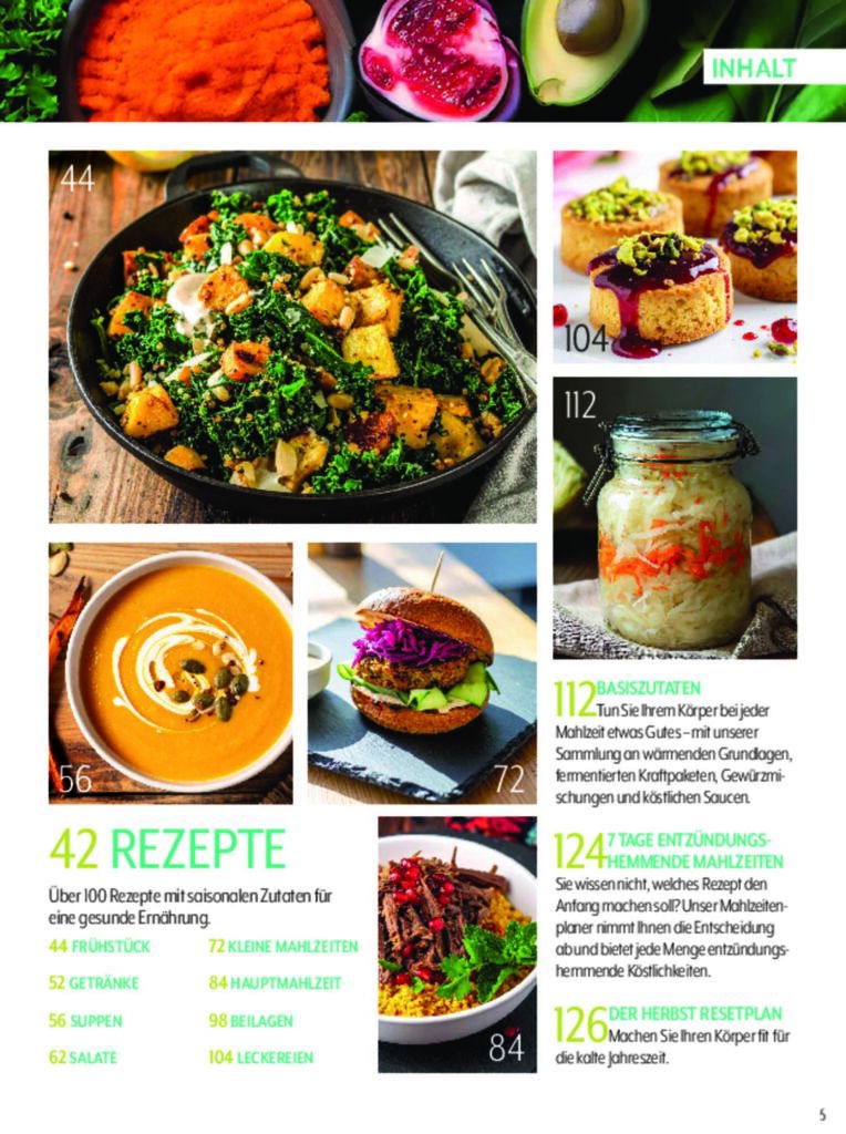 Mehr als 80 Seiten voller Rezepte feiern das Beste der Saison: kräftige Kohl-Arten, knackige Äpfel und saftige Birnen, kombiniert mit Kräutern, Gewürzen und fermentierten Lebensmitteln, die Darm und Gesundheit stärken. Dazu Anregungen für wärmende Suppen und farbenfrohen Salate, sättigende Hauptgerichte und ebenso verführerische wie gesunde Leckereien.