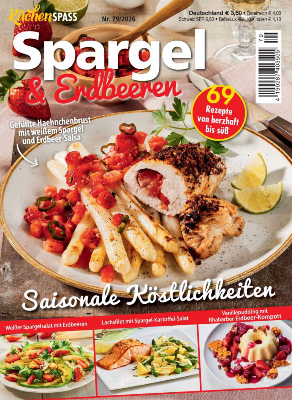 Liebe Leserin, lieber Leser, Carpe diem – nutze den Tag! Für alle, die Spargel und Erdbeeren lieben, gilt das in besonderem Maß. Die kurze Saison macht jede frisch geerntete Kostbarkeit umso wertvoller. In dieser Ausgabe von KüchenSPASS im praktischen Pocketformat erwarten dich 69 leckere Rezepte. Und wenn sich zur Freude über das üppige Marktangebot auch noch die Lust auf neue Rezepte gesellt, werdet Ihr in dieser Ausgabe von Küchenspaß sicherlich fündig. Auf mehr als 80 Seiten entfaltet sich ein kleines Fest der Aromen: Spargel in all seinen Facetten – als Salat, Suppe, Vorspeise oder Hauptgericht. Zum süßen Abschluss entfalten die Erdbeeren in leckeren Desserts ihre Verführungskünste. Kurz gesagt: Hier findest Du reichlich Anregungen, mit denen Du die Spargel- und Erdbeerzeit aufs Köstlichste zelebrieren kannst. In diesem Sinne wünschen wir euch eine genussvolle Zeit. Eure Redaktion.