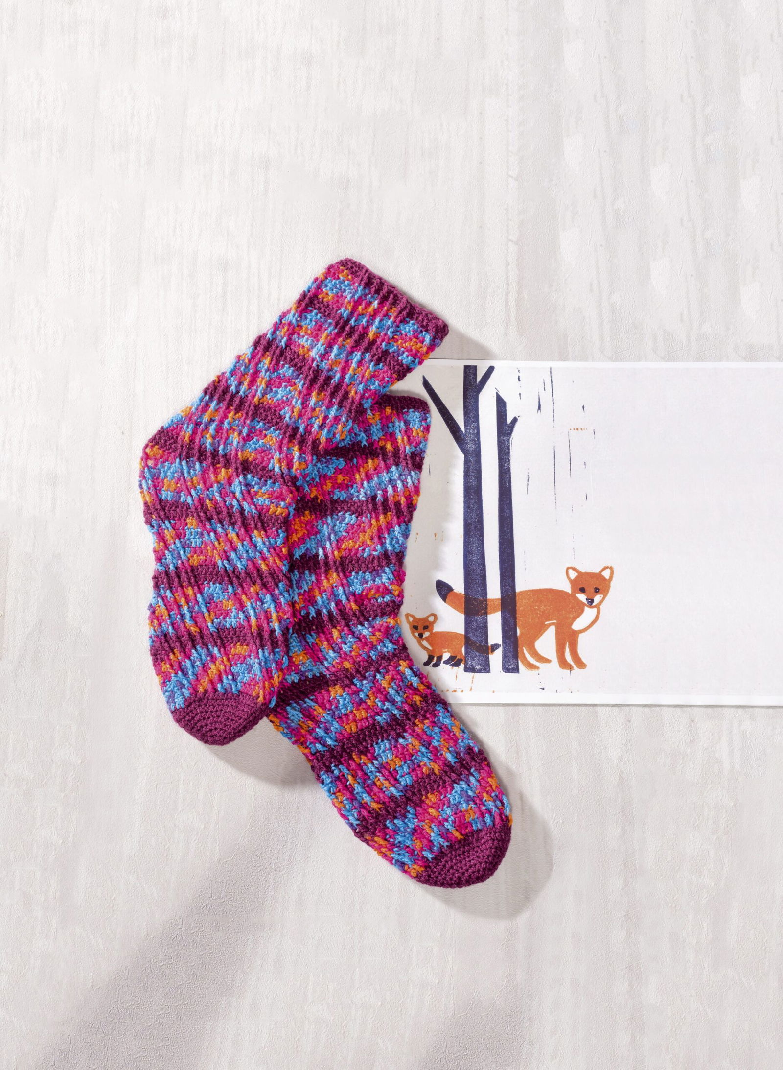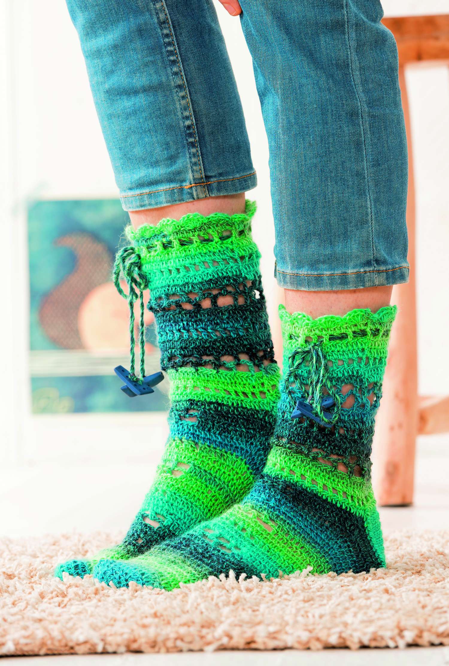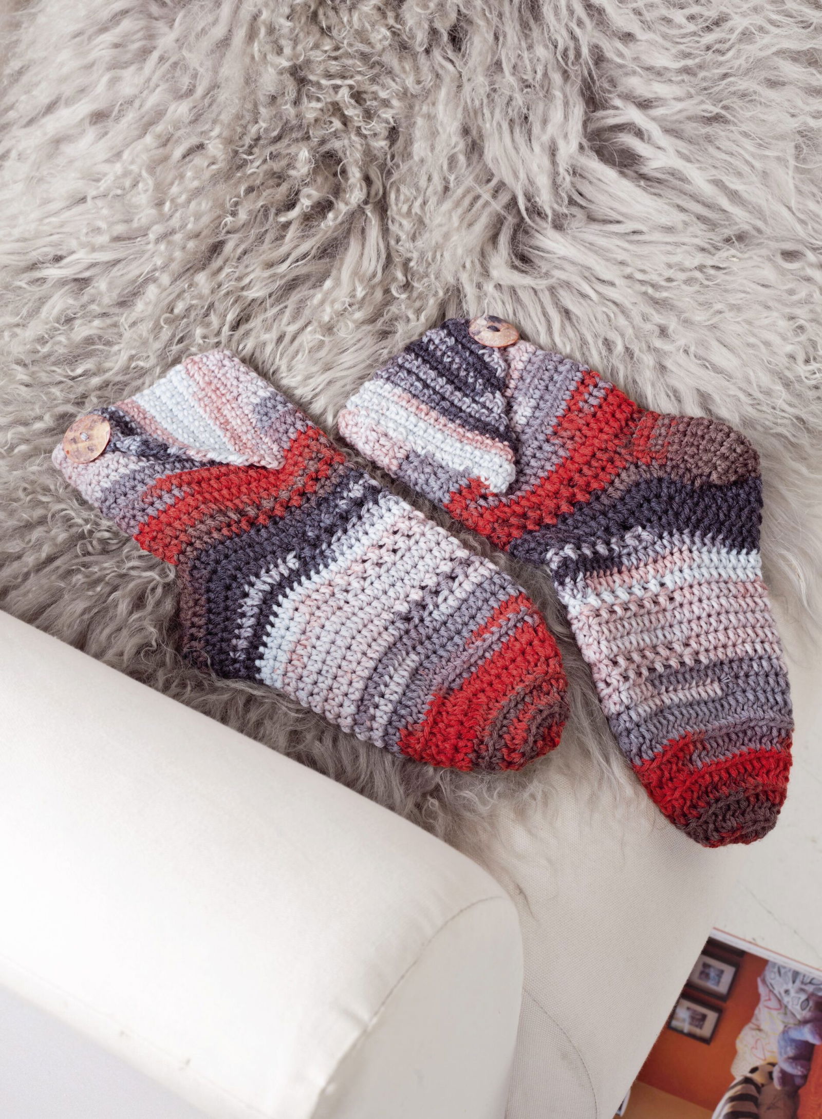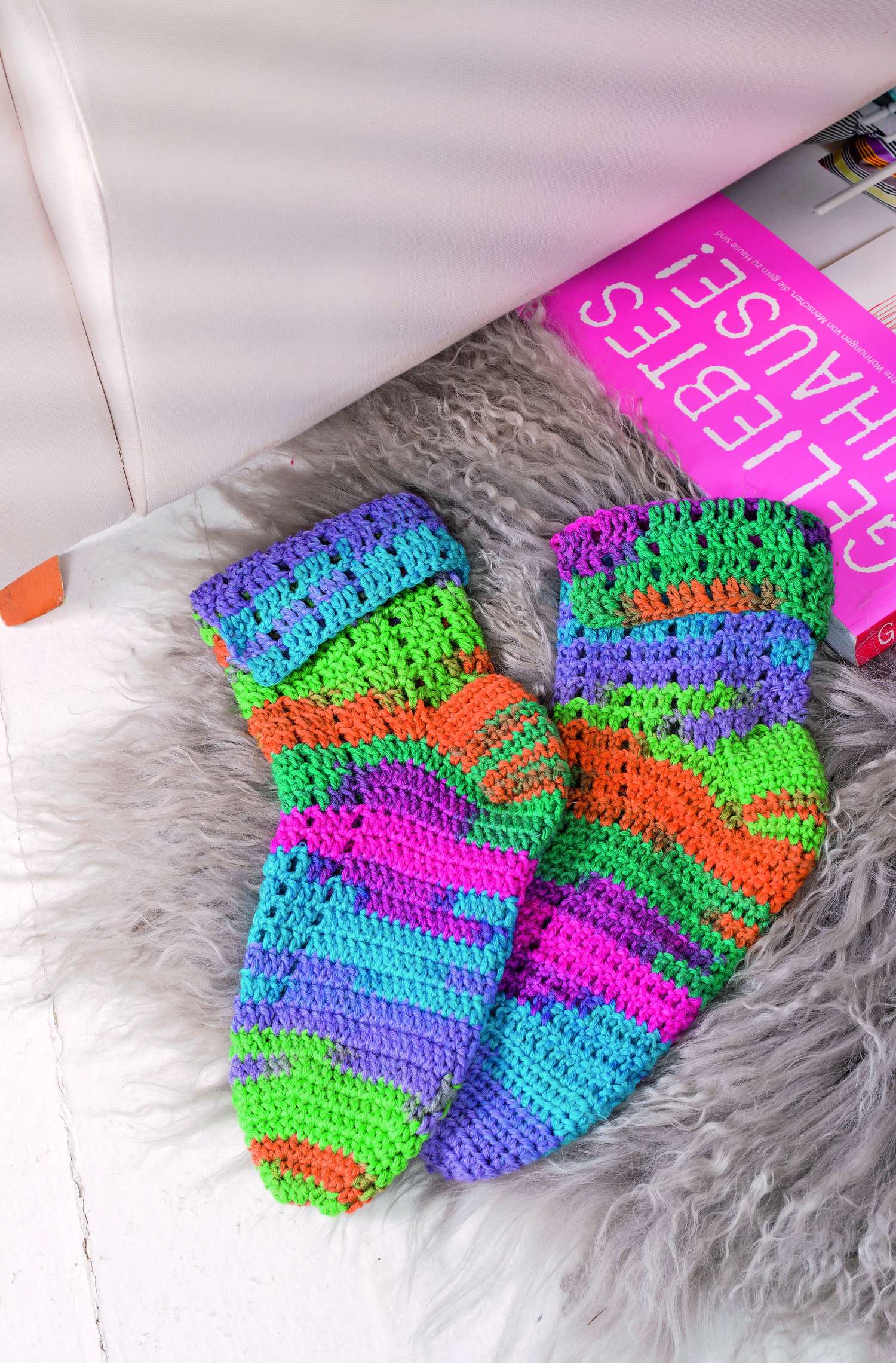 Ganz besonders möchten wir auf die Sofa-Socken hinweisen. Aus 8-facher Wolle sind sie nicht nur ganz schnell gehäkelt,