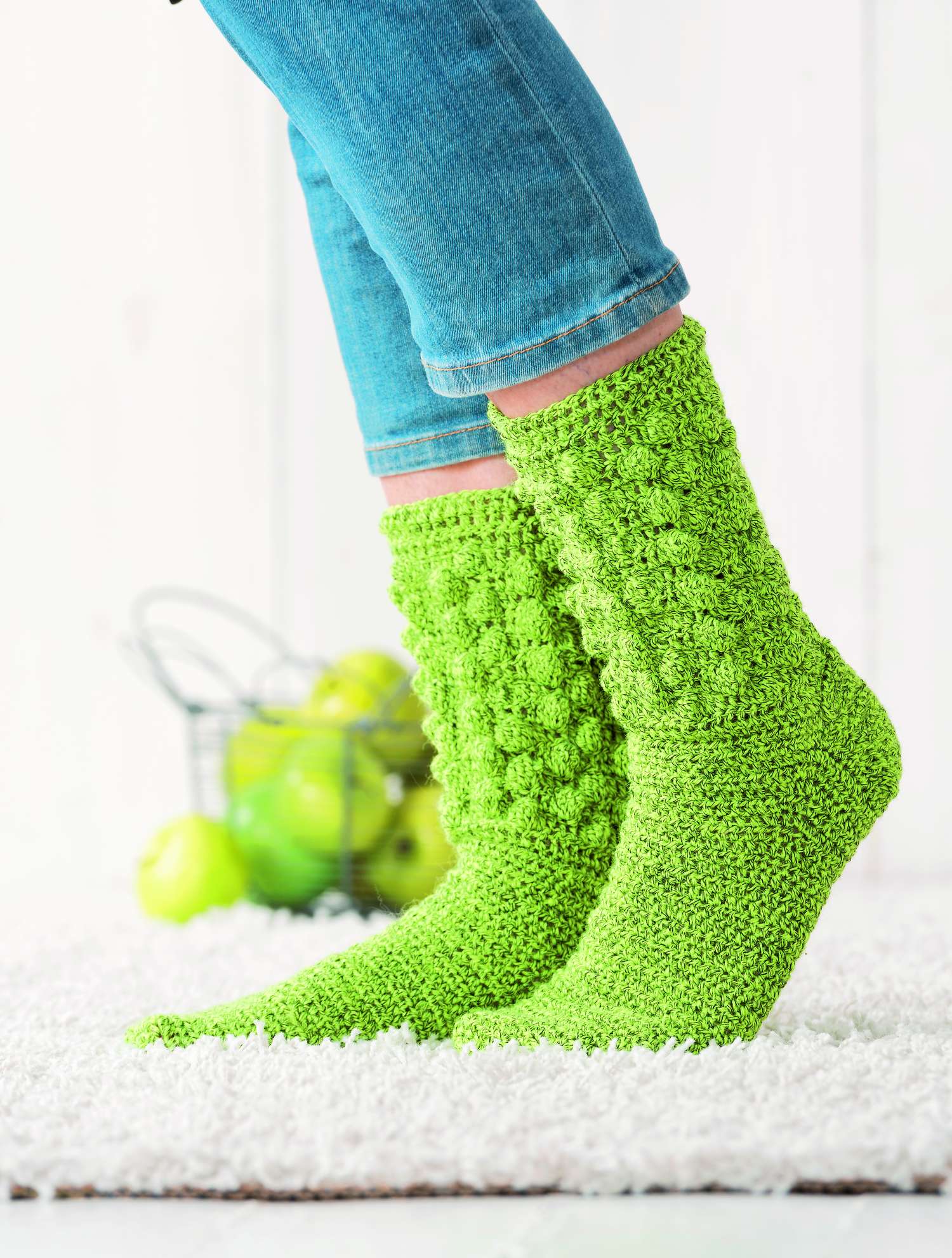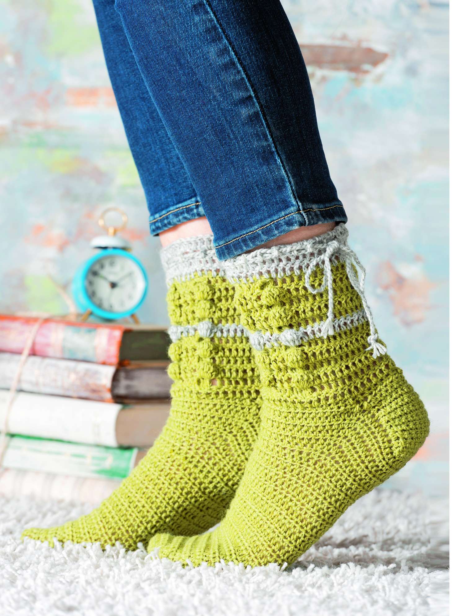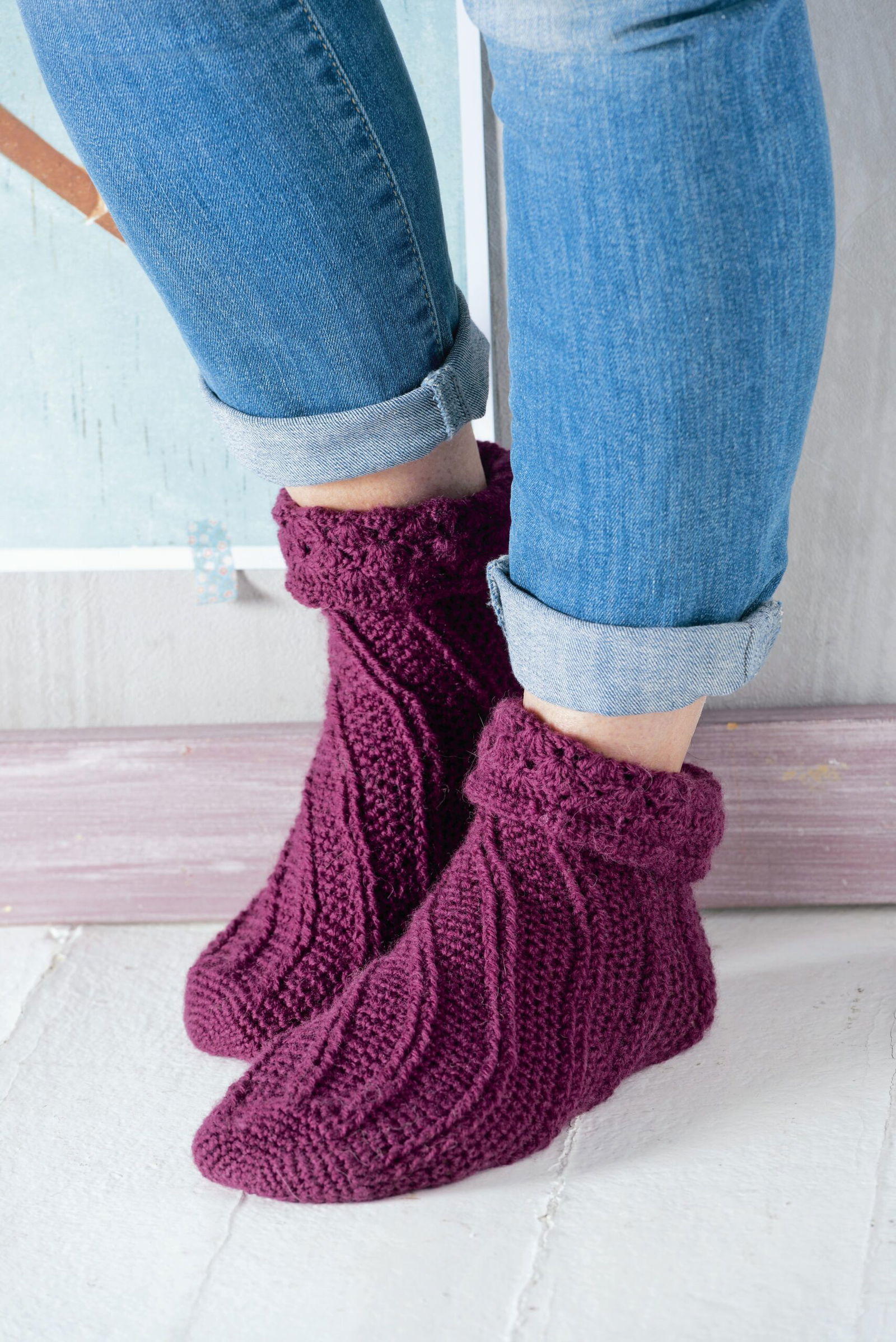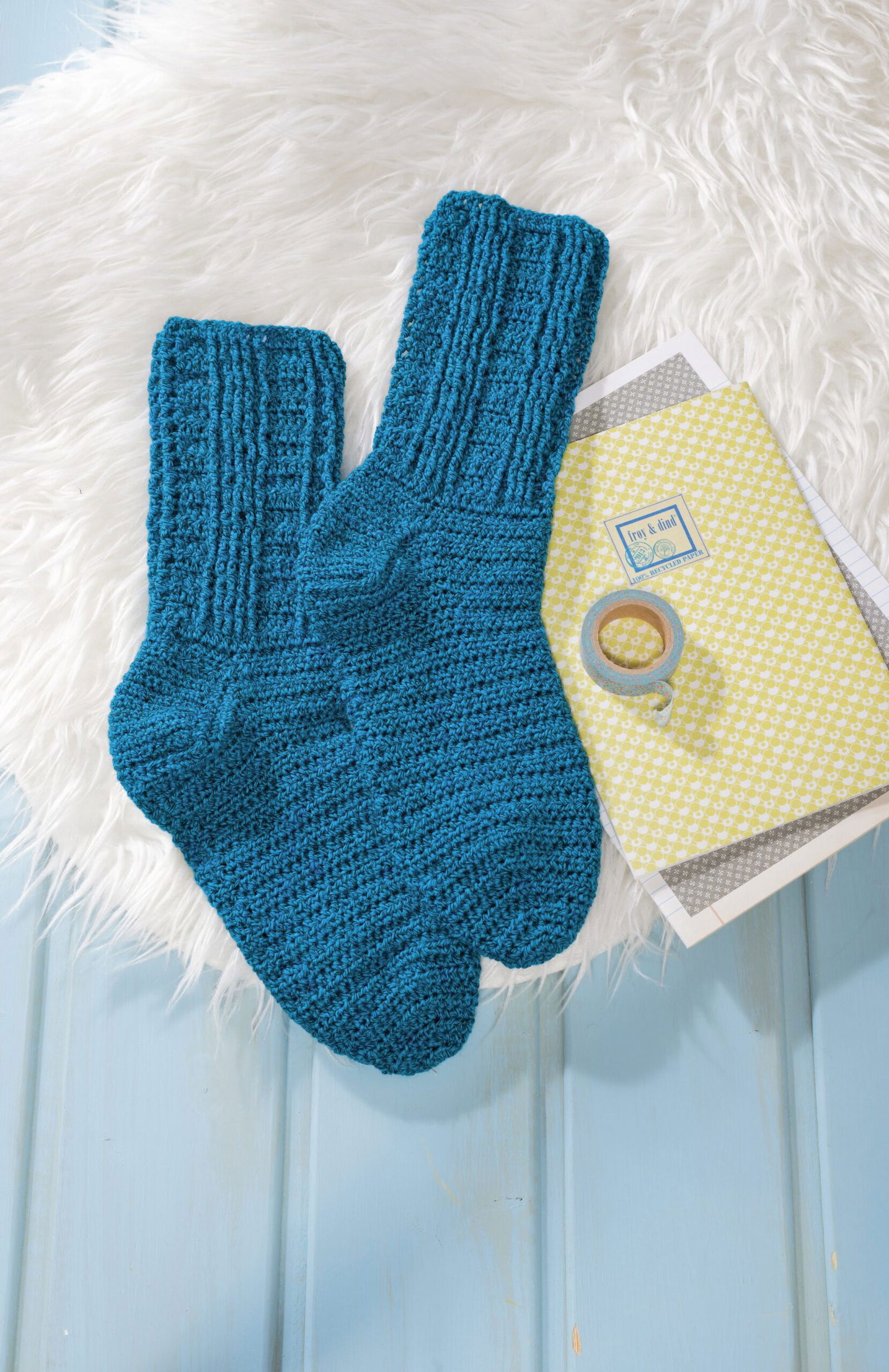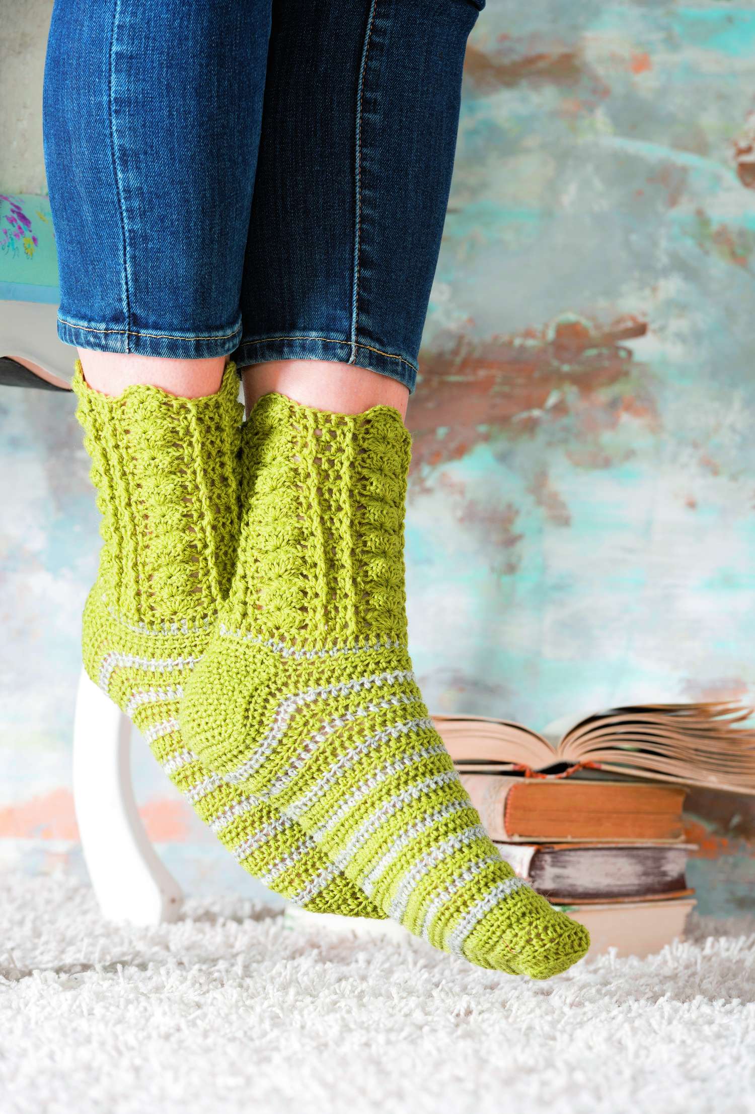 Ganz besonders möchten wir auf die Sofa-Socken hinweisen. Aus 8-facher Wolle sind sie nicht nur ganz schnell gehäkelt,